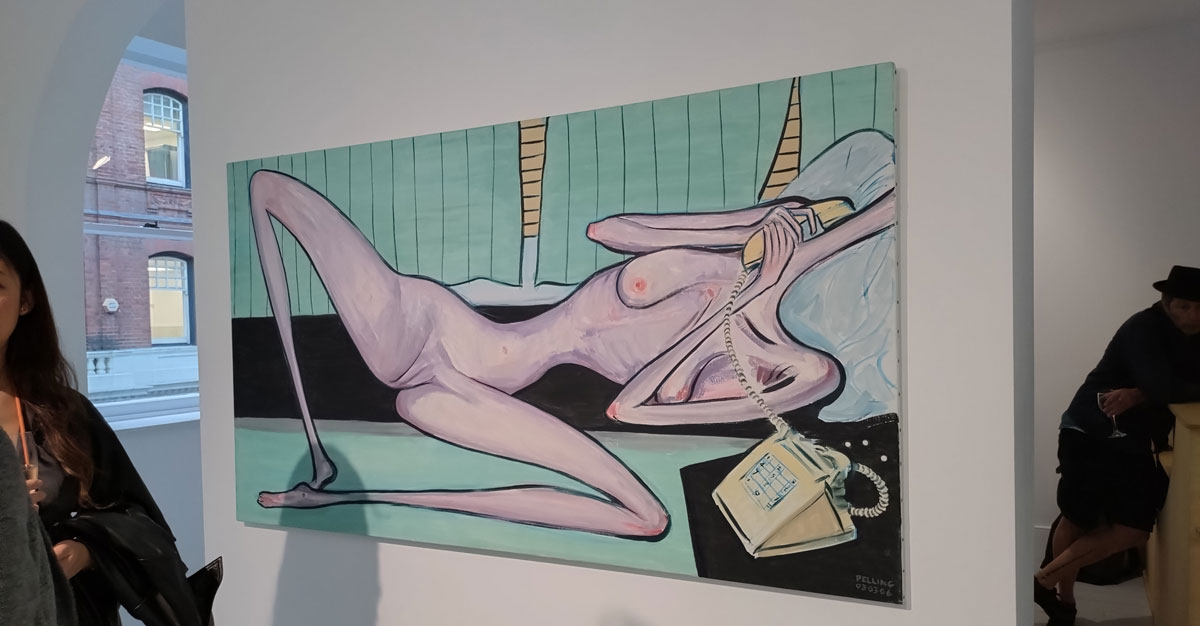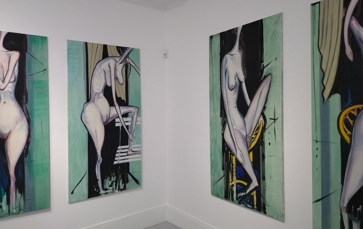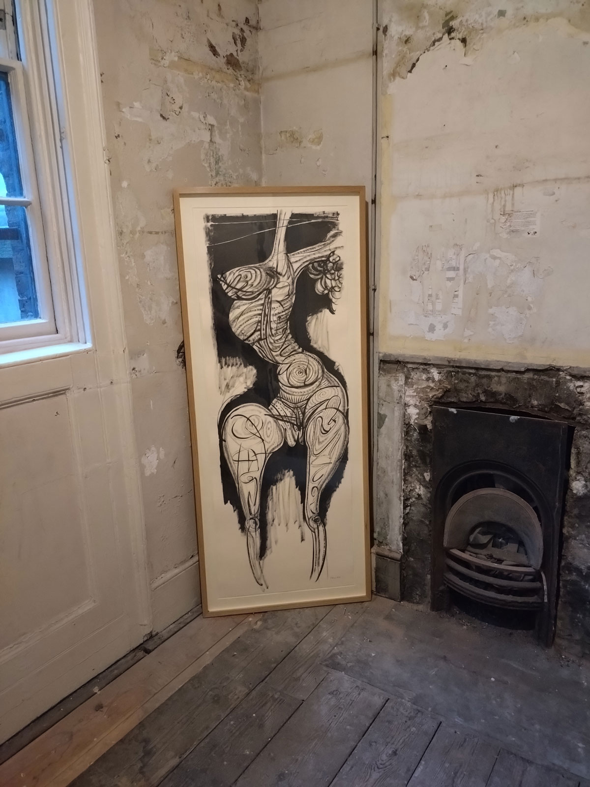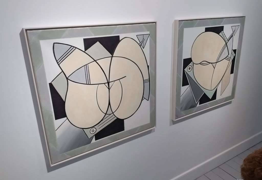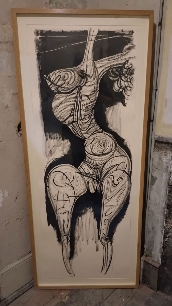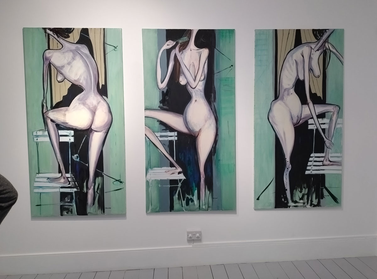 Apparently Tension, for that is what this show opening tonight is called, “brings together two distinct series of paintings by John Pelling from the early 2000s: the White Series and the Elongated Forms. Together, they embody the enduring interplay between spirituality and creativity in Pelling’s eight decades-long practice”. Apparently the two series will be exhibited together for the first time in this show, they almost feel like the work of two different people. John Pelling (born in 1930 in Hove, UK), lives and works in London, downstairs we’re looking at something rather graphically stylised, upstairs the ‘elongated’ work is rather different, there’s something here though, something that doesn’t feel quite right, there’s some uncomfortable that’s uniting the show and the two floors of work, a feel of objectification maybe? Something not quite right about the views of the female form? Something rather dated? Of the Seventies? Sexist rather than sexy? There’s something about this whole show that just doesn’t sit right. At the time of viewing I knew nothing much about John Pelling, I knew the show was opening, I knew I was going to be at the gallery next door, I knew I’d drop in (unless they blocked my entry again of course) and as I was going to be there I really didn’t need to do any advance research, the art can do all the talking and if it makes me want to, I can go look him up later. This show is nagging at me, the whole experience is, normally I’d just walk away, normally I’d just not bother saying anything, you know the policy around here, there are hundreds of art shows we’ve walked away from without having anything that positive to say, We generally can only be bothered when there’s something positive to say about a show or an artist, we don’t generally have time or inclination to say anything about a show that doesn’t grab us in a positive way. I really don’t like the subject matter hanging on the walls, or should I say I don’t like the way the subject matter in being treated? There’s something rather uncomfortable about the show…