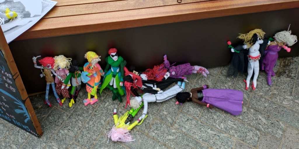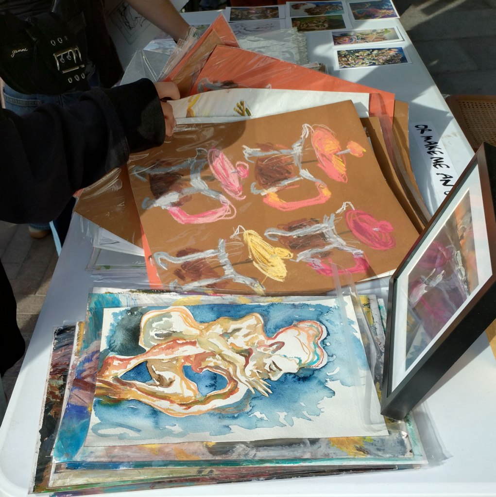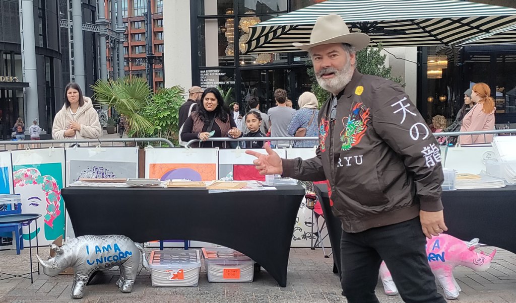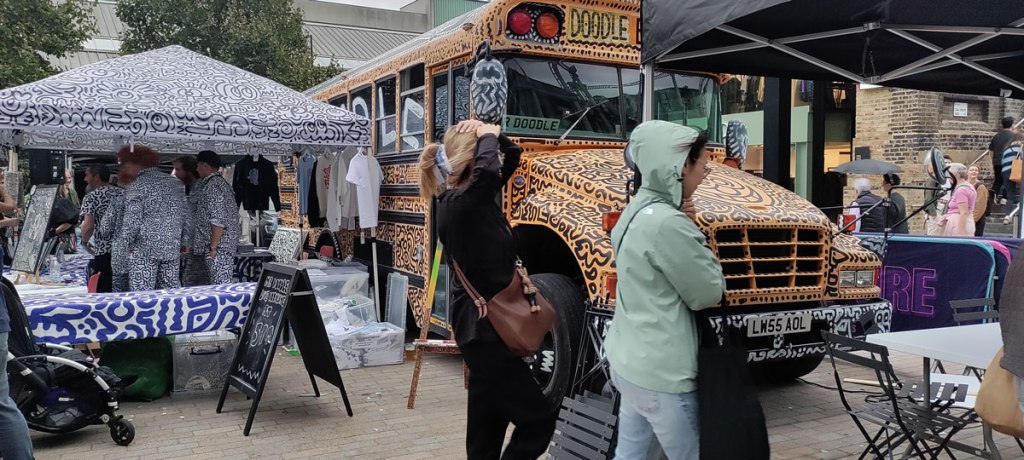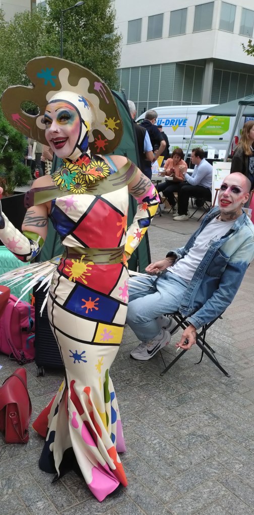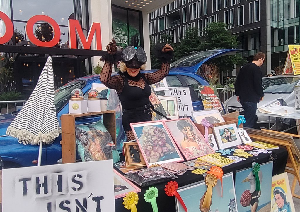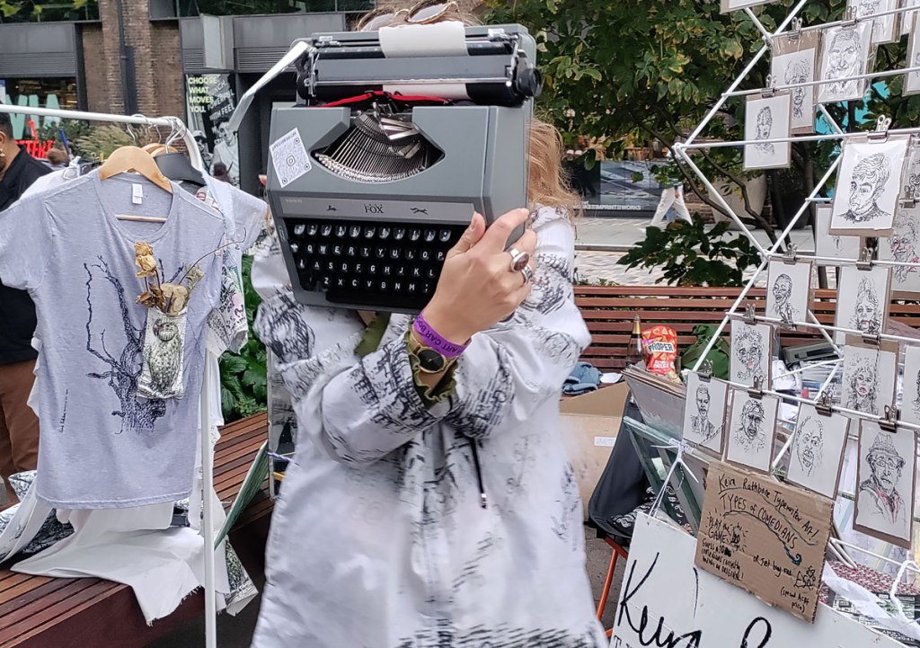 So the weather just about held, the wind wasn’t on our side at times, John Lee Bird’s reading of the day’s news from a copy of The Sun was a particular highlight as was his Animal bit that Slapper might know something about? Did Mr Bird get there on a bus (for a bus)? I must admit I did not want to be placed right by the bloody performance stage. I wanted to be as far away from it all as possible, down the other end of the whole damn ditzy scene (still can’t get used to those extra Ditzy Scene layers but that’s a whole other review of something we might once have had skin in the game of as well). No, keep me well away from the Sweet Art stage and whatever the hell John Lee Bird and the rest of them were going to be doing I yelled before hand (even if our old collaborator Marnie Scarlet was threatening a performance). Was that Saddie Hennessey going past dressed as a fly and distracting me just then? yes, I wanted to be at the other end, my request was ignored and I was stuck right next the damn performance stage! The Sweet Art performance stage was brilliant!! All the performers were excellent, I was having pre-fair nightmares about bad stand up comedians, no no no, Sweet Art done really (really) good! They took it back to the days of Brick Lane, they nailed it, well done Sweet Art and the cast of performers we mostly only caught bits of while getting on with the business of selling art (what the hell was Marnie Scarlett doing?!)
