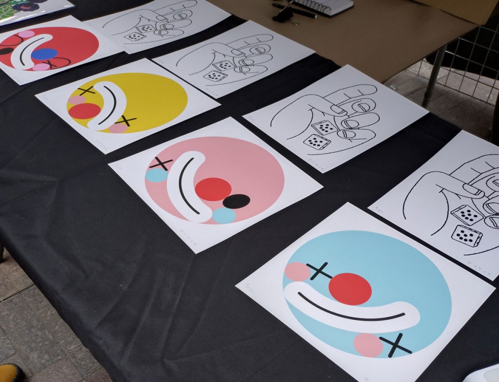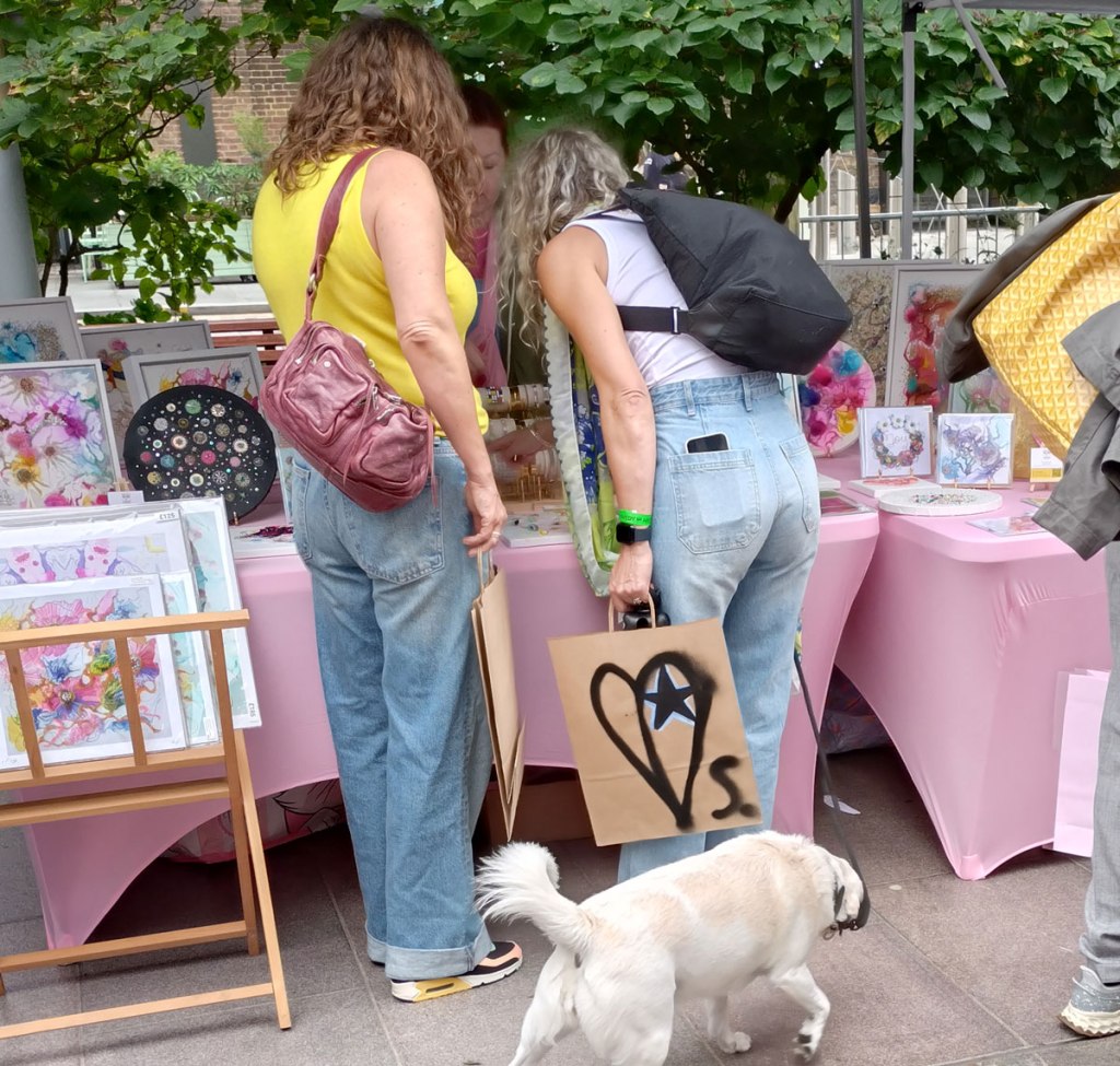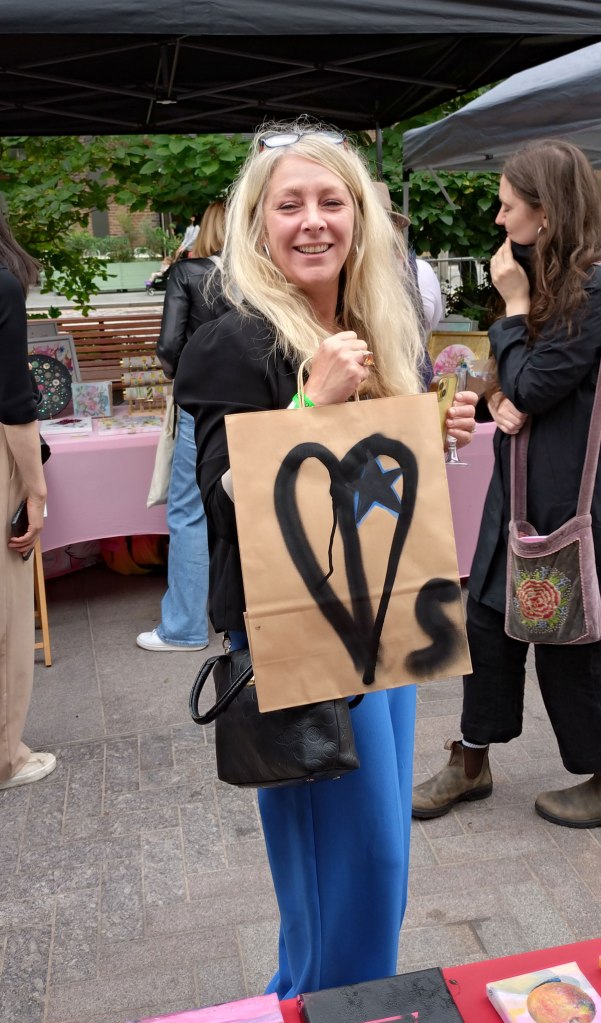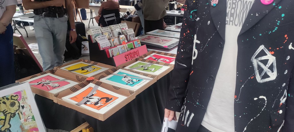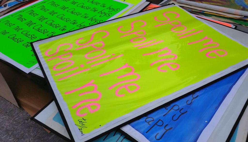 Are there more artists in here this year? Are we packed in tighter? It felt like it, it felt good. And I really wish I had had more time to go explore everyone’s art properly, I really didn’t see half of it and I needed more time to take in what kind of predictions the Misfortune Teller was casting out or to check out what Heath Kane or Rugman or Jealous Gallery of Smithson had to offer, never did see what Pure Evil had for us this year, missed StefDies completely, caught a very quick glimpse of Julia Maddison and an every quicker flash of Quiet British Accent, completely missed Lady Muck as well as Kira Rathbone and her magic typewriter although I did see several of her pieces go by. Alas real life got in the way of Emma Harvey making it to the fair this year (catch her via the on line version that about to open), somehow Grow Up didn’t get arrested or closed down even though we were right under the noses of Meta’s Kings Cross operation (seems Grow Up art isn’t popular with those who control our social media these days, can’t imagine why?!), Ben Eine made a lot of noise and never got around to using all the paint can he had out on his table over in what someone described as our naughty corner of the fair before disappearing half way through the afternoon (he’s right over from us with his stall, are we pat of the naughty corner with Mr Eine and Grow up?). Maria Brennies was looking as colourful as even, there another pink Juno Calypso bag going by…