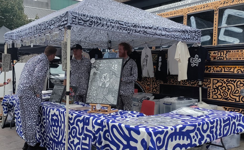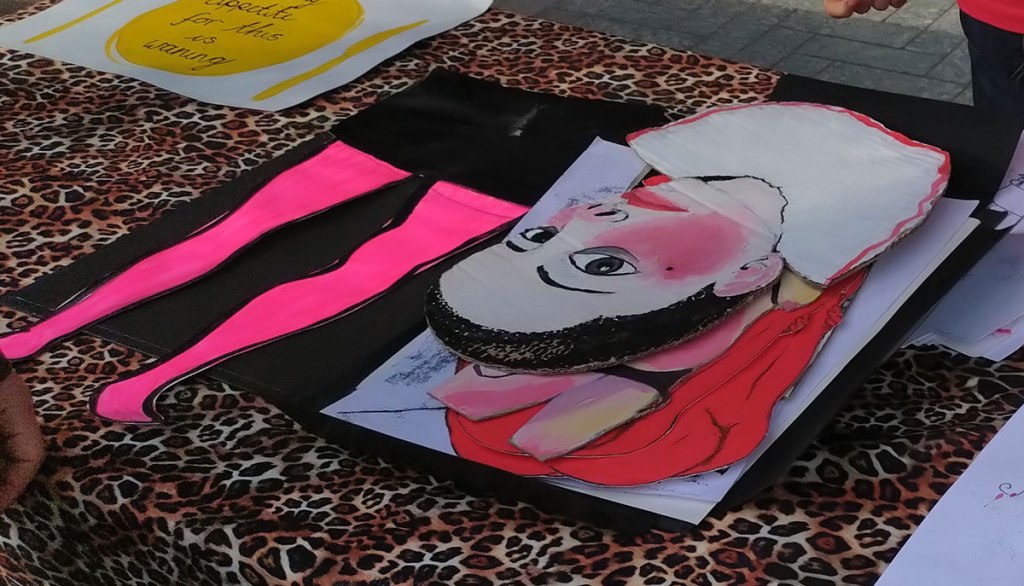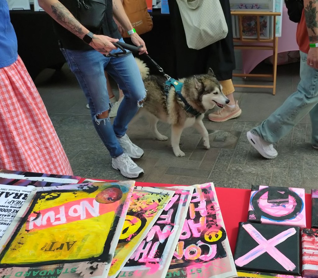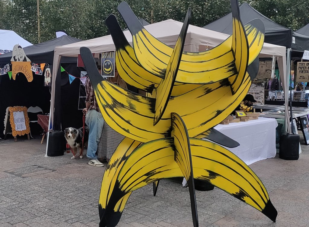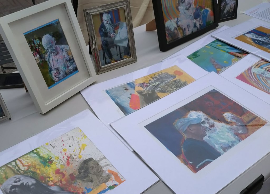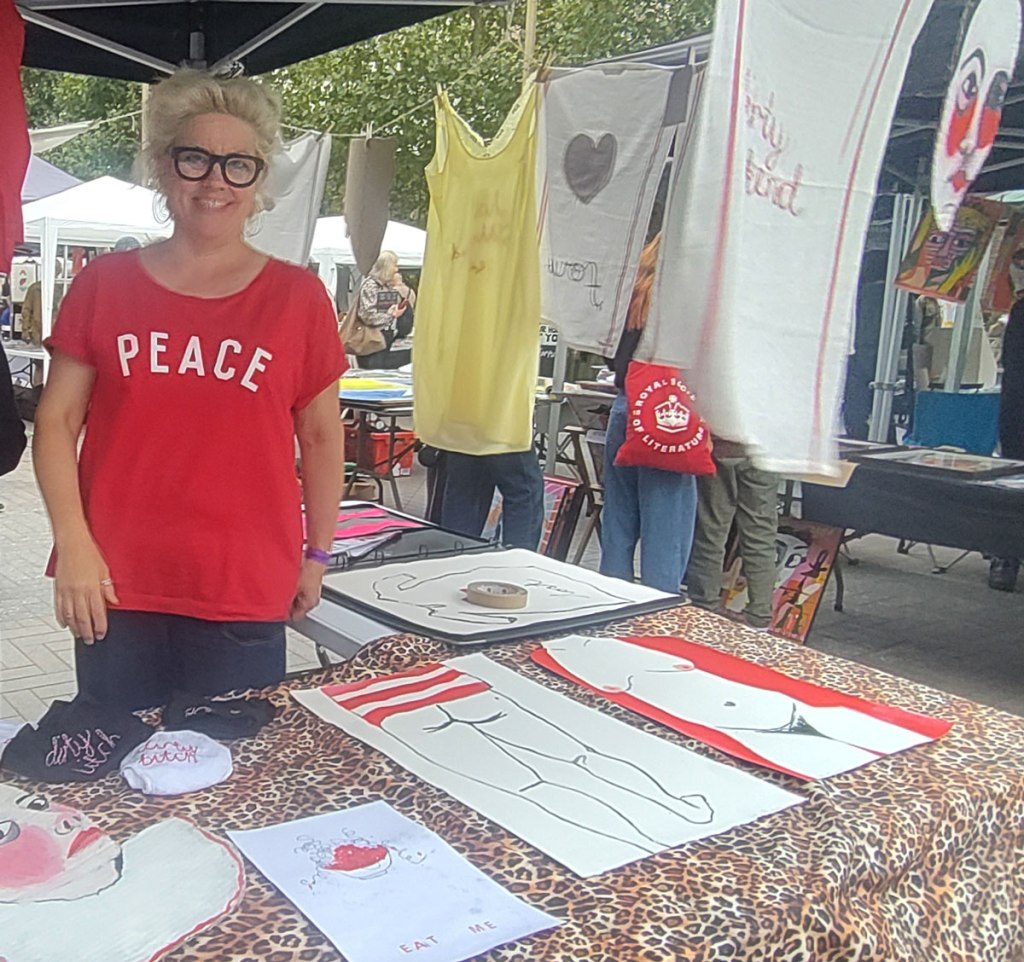 “Art and Comedy got together and had a damn fine time on Saturday” declared founder Karen Ashton on the morning after the day before. Actually she probably didn’t say it on the morning after, she probably slept most of that morning, there a lot of work that goes in to something like this! And yes, before we go any further, if you haven’t got the drift already, yes this is me declaring an interest, yes I was one of the participating artists, yes I am standing on the inside looking at the outside here, I was behind my stall watching people walk by, I was watching the passing dogs, I was talking to those who chose to stop and ask (I like all the interaction, I like the faces I see once a year, the new faces, the old faces, the faces I can’t quite place). Yes, I am writing about something I was taking part in (yet again), yes this is from my point of view, this is direct from the red trunk of my (imaginary) 68 Chevy with pipes on the side (You know she’s my idea of beauty, that’s what I drive) and no, there were none of those bats in the rear view mirror that weren’t noticed somewhere on the edge of the old Coalyard just after the flashback to Bagleys Warehouse and the Mint 400 gigs at the Red Eye over on Copenhagen Street (OK, it wasn’t quite a Chevy boot, this look back at last Saturday is coming via our very basic gazebo and a red cloth covered table in the middle of the fair) and as always, I didn’t get to go too far from my own boot or stall or whatever we want to call it for most of the day (didn’t even get to the damn bar and not one of my fellow artists came over and said hey, thanks for all those countdown previews and all the work you did on the up front publicity, here’s a thank you pint!). What I’m saying here is If you want an objective neutral point of view or review or whatever then this isn’t it, I am not Switzerland here, my observations are from where I was stood, I was involved, I had paint splattered skin in the game (I do hope by now you’ve learn to trust Organ and know that when we do cover things we’re part of we are still being objective, we call it as it is around these parts, hell, the woman who works press and PR for the fair won’t even speak to us, let alone send us a press release, something to do with not liking the way we call things out around here! We are not yes men or women at Organ, we call it as it is and it seems we’re good at pissing people off. If we’re telling you this was a good one I hope you trust us enough to know we’re not just saying so because we were part of it, we’re saying it was a good one because it was!)