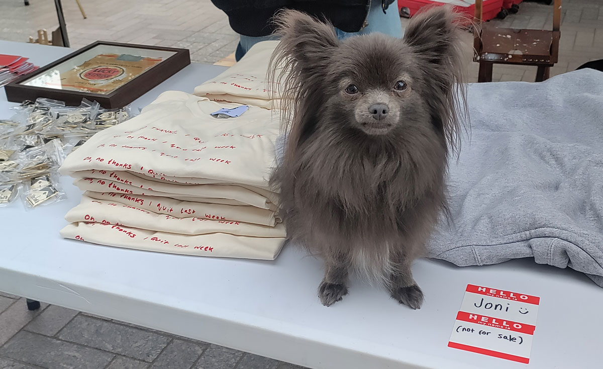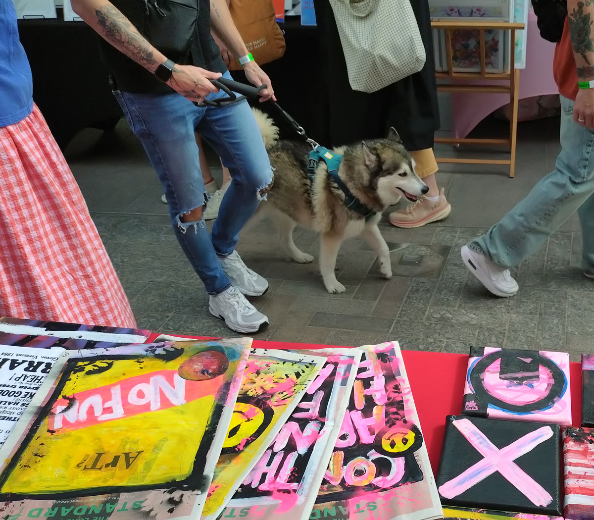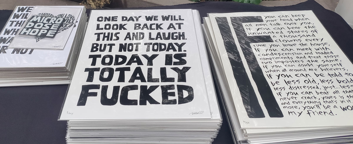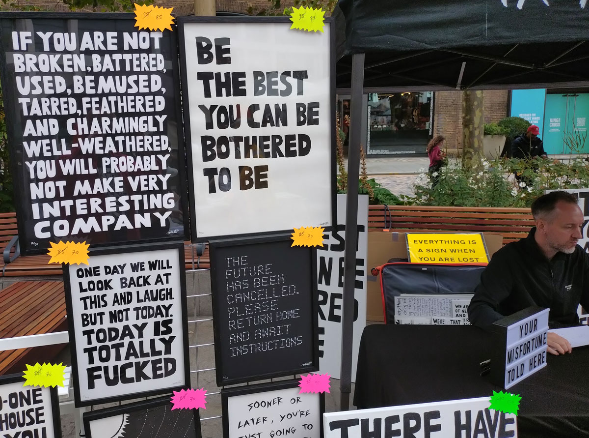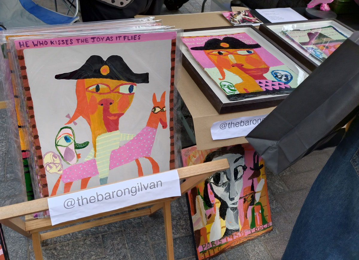 Are there more artists in here this year? Are we packed in tighter? It felt like it, it felt good. And I really wish I had had more time to go explore everyone’s art properly, I really didn’t see half of it and I needed more time to take in what kind of predictions the Misfortune Teller was casting out or to check out what Heath Kane or Rugman or Jealous Gallery of Smithson had to offer, never did see what Pure Evil had for us this year, missed StefDies completely, caught a very quick glimpse of Julia Maddison and an every quicker flash of Quiet British Accent, completely missed Lady Muck as well as Kira Rathbone and her magic typewriter although I did see several of her pieces go by. Alas real life got in the way of Emma Harvey making it to the fair this year (catch her via the on line version that about to open), somehow Grow Up didn’t get arrested or closed down even though we were right under the noses of Meta’s Kings Cross operation (seems Grow Up art isn’t popular with those who control our social media these days, can’t imagine why?!), Ben Eine made a lot of noise and never got around to using all the paint can he had out on his table over in what someone described as our naughty corner of the fair before disappearing half way through the afternoon (he’s right over from us with his stall, are we pat of the naughty corner with Mr Eine and Grow up?). Maria Brennies was looking as colourful as even, there another pink Juno Calypso bag going by…
