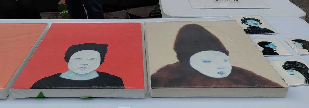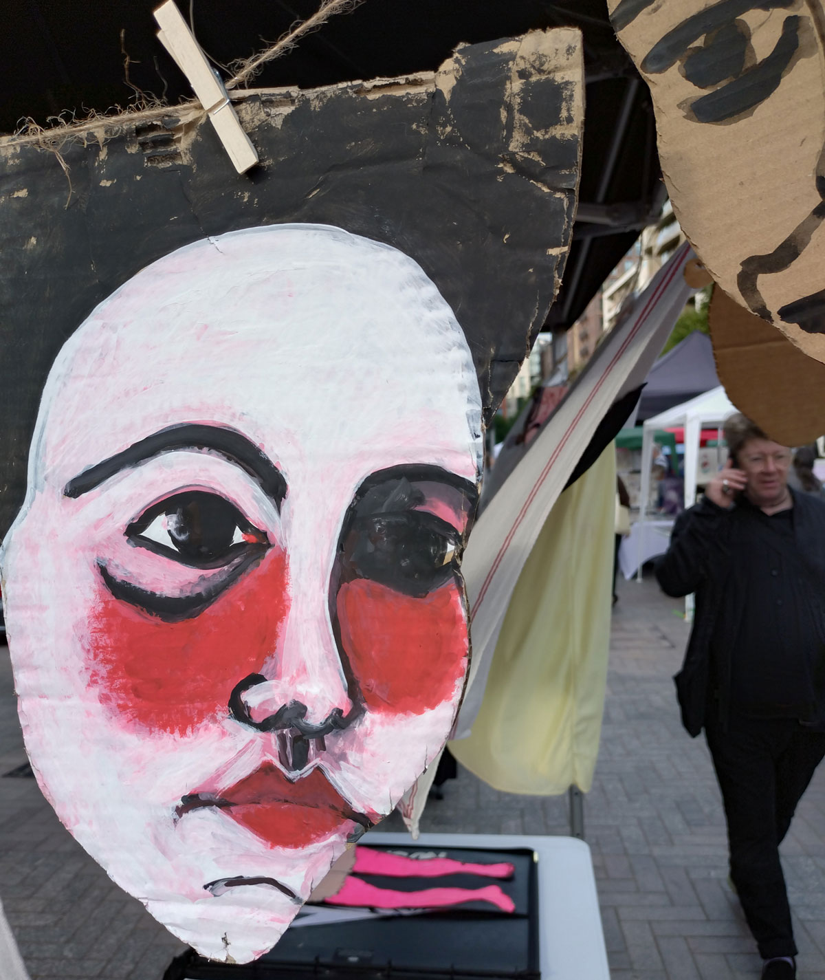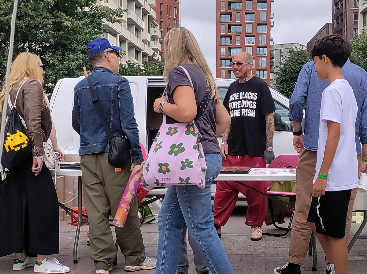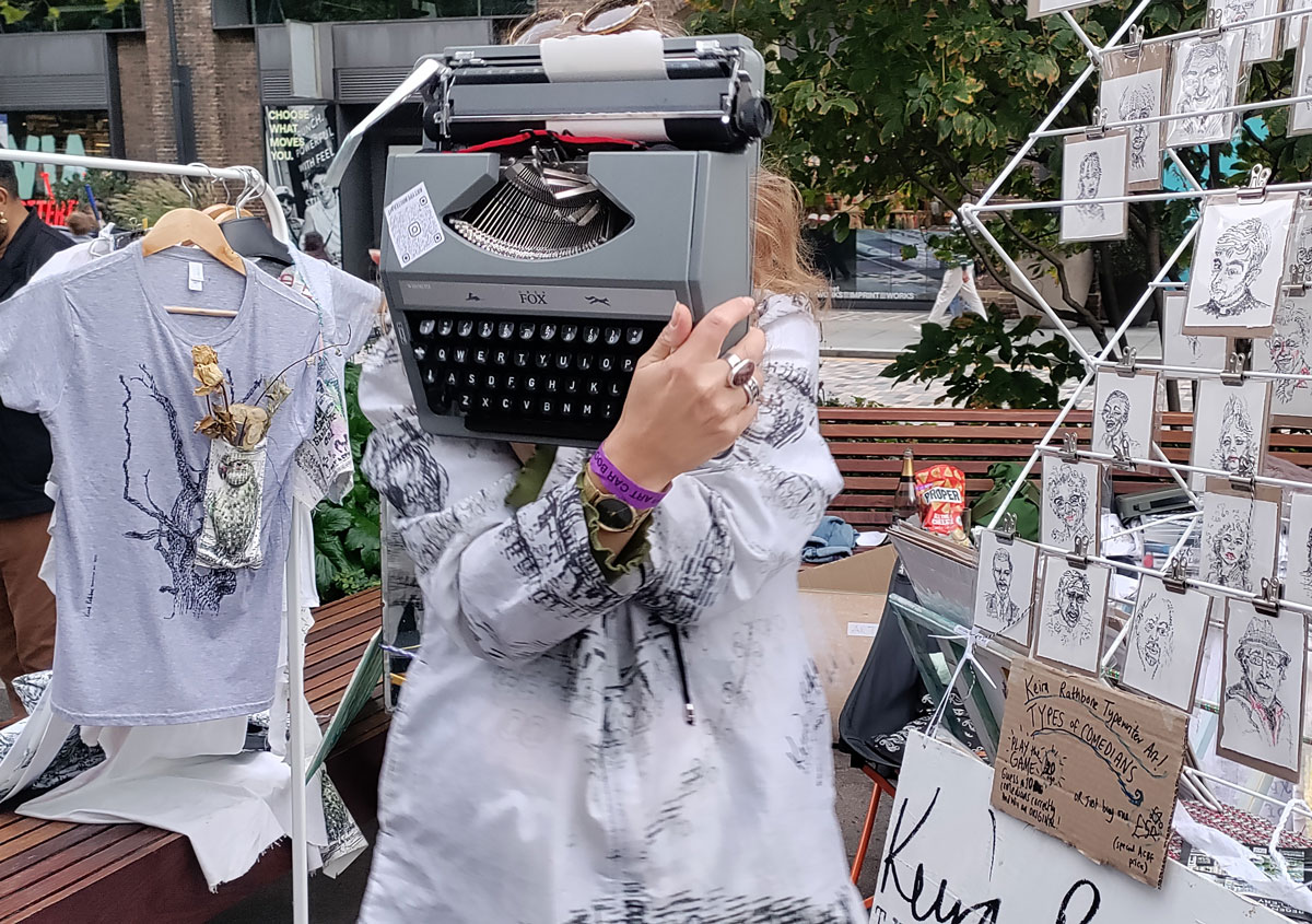 So the weather just about held, the wind wasn’t on our side at times, John Lee Bird’s reading of the day’s news from a copy of The Sun was a particular highlight as was his Animal bit that Slapper might know something about? Did Mr Bird get there on a bus (for a bus)? I must admit I did not want to be placed right by the bloody performance stage. I wanted to be as far away from it all as possible, down the other end of the whole damn ditzy scene (still can’t get used to those extra Ditzy Scene layers but that’s a whole other review of something we might once have had skin in the game of as well). No, keep me well away from the Sweet Art stage and whatever the hell John Lee Bird and the rest of them were going to be doing I yelled before hand (even if our old collaborator Marnie Scarlet was threatening a performance). Was that Saddie Hennessey going past dressed as a fly and distracting me just then? yes, I wanted to be at the other end, my request was ignored and I was stuck right next the damn performance stage! The Sweet Art performance stage was brilliant!! All the performers were excellent, I was having pre-fair nightmares about bad stand up comedians, no no no, Sweet Art done really (really) good! They took it back to the days of Brick Lane, they nailed it, well done Sweet Art and the cast of performers we mostly only caught bits of while getting on with the business of selling art (what the hell was Marnie Scarlett doing?!)