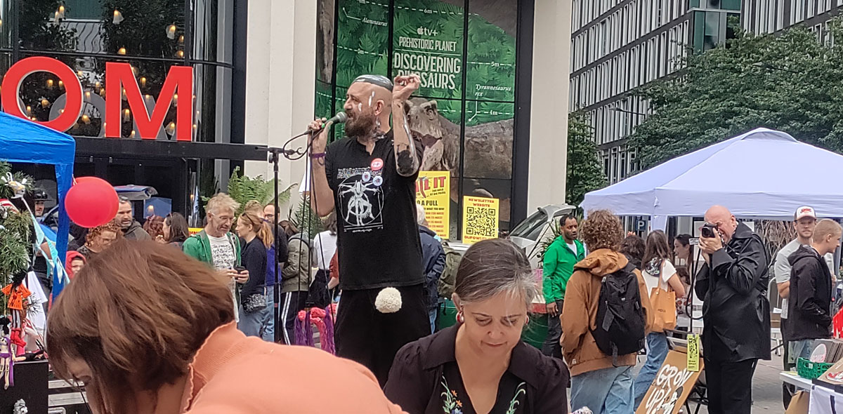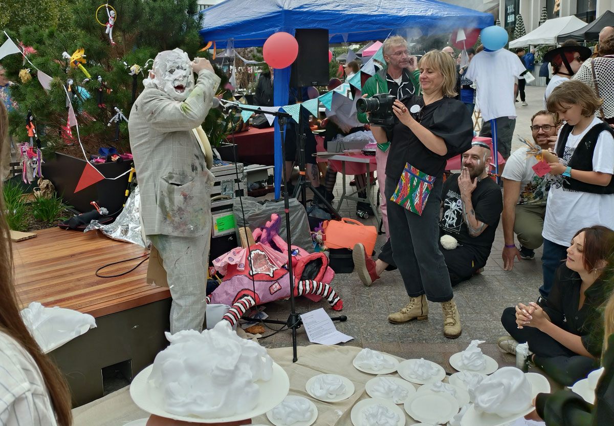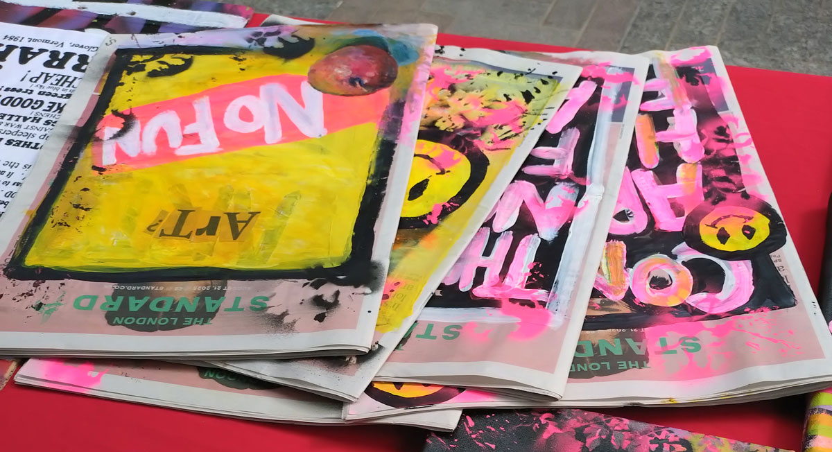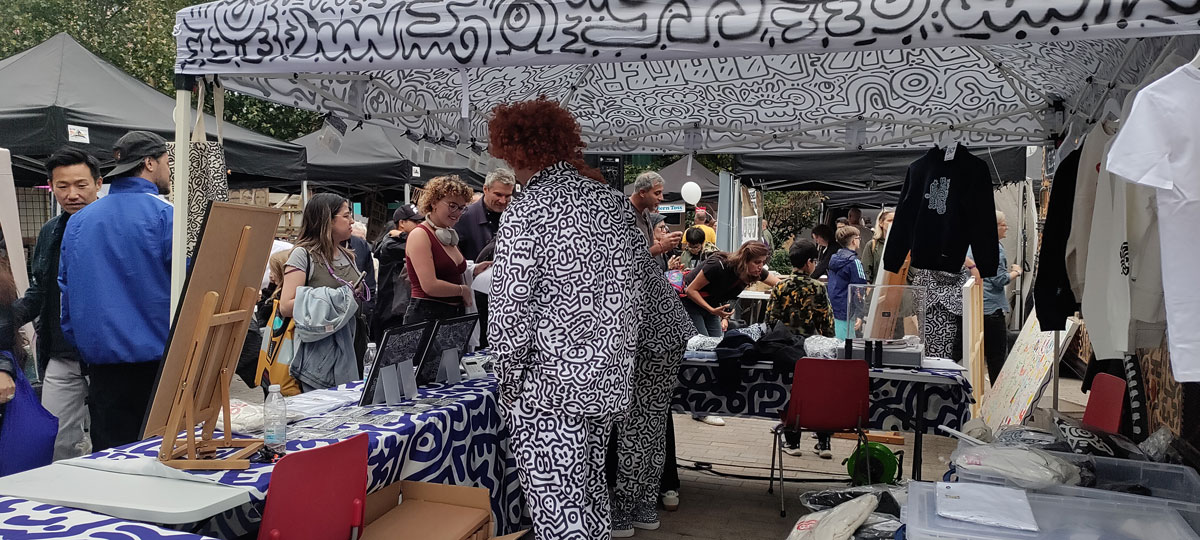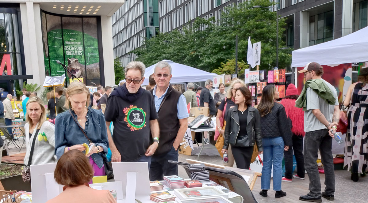So the weather just about held, the wind wasn’t on our side at times, John Lee Bird’s reading of the day’s news from a copy of The Sun was a particular highlight as was his Animal bit that Slapper might know something about? Did Mr Bird get there on a bus (for a bus)? I must admit I did not want to be placed right by the bloody performance stage. I wanted to be as far away from it all as possible, down the other end of the whole damn ditzy scene (still can’t get used to those extra Ditzy Scene layers but that’s a whole other review of something we might once have had skin in the game of as well). No, keep me well away from the Sweet Art stage and whatever the hell John Lee Bird and the rest of them were going to be doing I yelled before hand (even if our old collaborator Marnie Scarlet was threatening a performance). Was that Saddie Hennessey going past dressed as a fly and distracting me just then? yes, I wanted to be at the other end, my request was ignored and I was stuck right next the damn performance stage! The Sweet Art performance stage was brilliant!! All the performers were excellent, I was having pre-fair nightmares about bad stand up comedians, no no no, Sweet Art done really (really) good! They took it back to the days of Brick Lane, they nailed it, well done Sweet Art and the cast of performers we mostly only caught bits of while getting on with the business of selling art (what the hell was Marnie Scarlett doing?!)