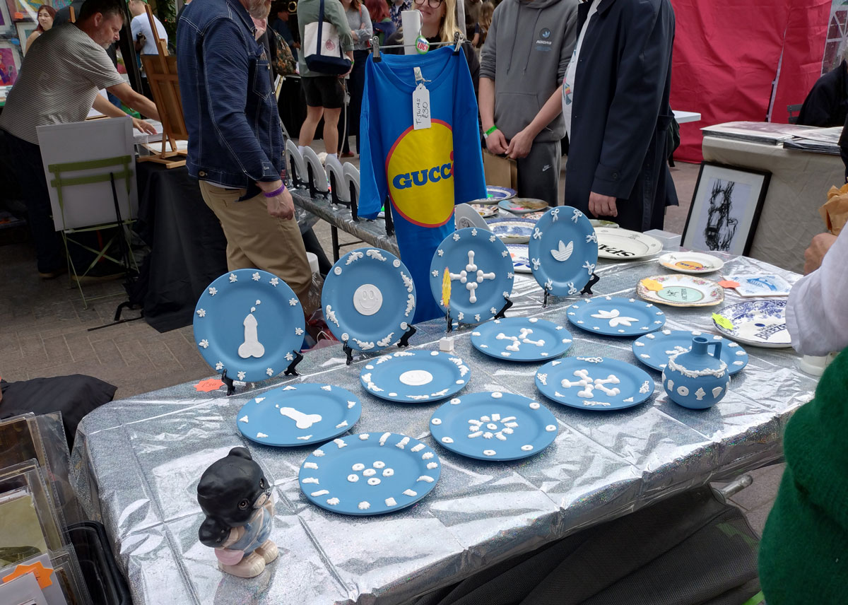 Hey look, I say it every year, can’t be cherry picking, as usual, I didn’t get to see anywhere near half of it and no doubt I’ve offended some artist or other by not mentioning them (it is very easy easy to offend an artist when you write about art so much, life would be far easier if I didn’t). Feels like I missed more then ever this time (hey, I was busy behind my own stall!). The thing about the Art Car Boot Fair is that there is genuinely something for everyone, and I’d be amazed if anyone liked everything? I’d be worried if people liked everything! So yes, I missed most of it, caught a quick glimpse of Vic Reeves was over there with Jim Moir, missed his art, I like Jim’s art. Rankin was somewhere if that’s what you wanted, Mr Doodle parked his big American school bus (that was for real, not imagined), can’t get into all that doodling though, it kind of feels like I might have seen it done before? And yes, there are still too many wordy bits and not every bit of art is my cup of tea and you’ve told that flip off back to London joke at the last three fairs now mate, do something new! But then there was Geraldine Swayne‘s beautiful paintings, there was Alice Herrick, there was Pushka working with his figures, faces, and lived moments that he says explore states of presence and transformation. Smaller versions of his large-scale oils seen of dry land rather then on a canal boat (he also runs the rather busy Canalboat Contemporary), there was Paul Sakoilsky‘s paintings when he could escape the clutches of Kunsty the Clown. I missed whatever Pam Hogg had this year and somehow failed to bump into Dion Kitson all day, was he there? Haus of Lucy‘s Wedgewood look like fun, oh look, it is about the one thing as a whole in much the same way a good group show is. It was about the art, the people, the event, about whatever it was John Lee Bird shouted – he mostly shouted knickers at passers by – it was about the whole thing, I can’t be about picking out artists, I can’t be cherry picking or someone get’s left behind and it really was a big positive collective of a thing, the sum of the whole.