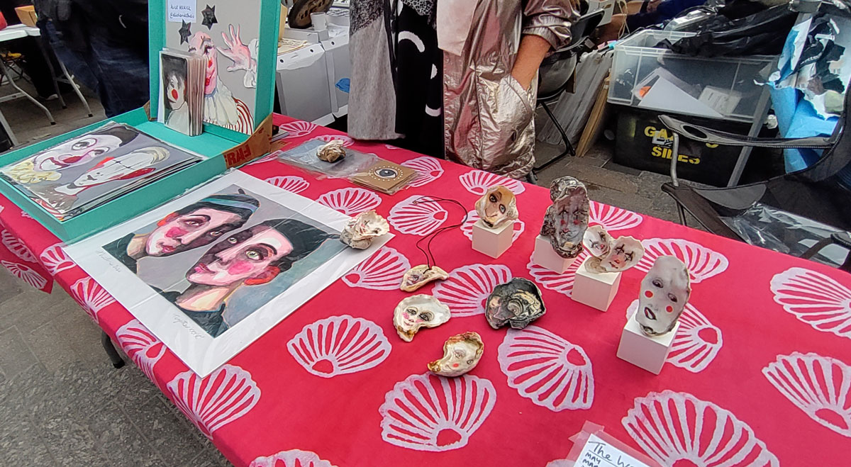 “Art and Comedy got together and had a damn fine time on Saturday” declared founder Karen Ashton on the morning after the day before. Actually she probably didn’t say it on the morning after, she probably slept most of that morning, there a lot of work that goes in to something like this! And yes, before we go any further, if you haven’t got the drift already, yes this is me declaring an interest, yes I was one of the participating artists, yes I am standing on the inside looking at the outside here, I was behind my stall watching people walk by, I was watching the passing dogs, I was talking to those who chose to stop and ask (I like all the interaction, I like the faces I see once a year, the new faces, the old faces, the faces I can’t quite place). Yes, I am writing about something I was taking part in (yet again), yes this is from my point of view, this is direct from the red trunk of my (imaginary) 68 Chevy with pipes on the side (You know she’s my idea of beauty, that’s what I drive) and no, there were none of those bats in the rear view mirror that weren’t noticed somewhere on the edge of the old Coalyard just after the flashback to Bagleys Warehouse and the Mint 400 gigs at the Red Eye over on Copenhagen Street (OK, it wasn’t quite a Chevy boot, this look back at last Saturday is coming via our very basic gazebo and a red cloth covered table in the middle of the fair) and as always, I didn’t get to go too far from my own boot or stall or whatever we want to call it for most of the day (didn’t even get to the damn bar and not one of my fellow artists came over and said hey, thanks for all those countdown previews and all the work you did on the up front publicity, here’s a thank you pint!). What I’m saying here is If you want an objective neutral point of view or review or whatever then this isn’t it, I am not Switzerland here, my observations are from where I was stood, I was involved, I had paint splattered skin in the game (I do hope by now you’ve learn to trust Organ and know that when we do cover things we’re part of we are still being objective, we call it as it is around these parts, hell, the woman who works press and PR for the fair won’t even speak to us, let alone send us a press release, something to do with not liking the way we call things out around here! We are not yes men or women at Organ, we call it as it is and it seems we’re good at pissing people off. If we’re telling you this was a good one I hope you trust us enough to know we’re not just saying so because we were part of it, we’re saying it was a good one because it was!)