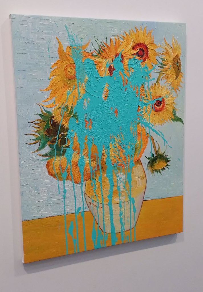And this really is the thing, we’ve been in here getting on for three hours now, we are surrounded on all sides by art, walls to the left, to the right, in front of us, behind us, above us, there’s that big Sgt Pepper album cover painting we already mentioned, what is that doing over there? I’m sure there must be a reason, not really seeing that reason right now though? I’m sure there must be a reason for bringing it all the way over here? It looks like a piece of fan art to me, I must be missing the point? We really should stop for a cup of tea, park that cynical smile, we would stop for a brew if it didn’t cost an arm and several legs. This ain’t no place for the likes of us, art has long since priced most people out, and of course we know that’s long been the case in here, I’m not exactly seeing a bus load of familiar faces from the broke-ass London Art Scene in here, I’m not seeing that many of my fellow artists in here looking at what at times is some, shall we politely say rather average art. Most of the new Young Galleries that are being championed over there in that section of hot new kids on the block galleries, they’re mostly run by rich kids whatever they might try to collectively tell us, a whole load of new middle class rich kid gate keepers with expensive degrees in curating by the book.  Karma Gallery from both New York and Los Angeles are the guilty party in terms of the shipping halfway around the globe of that piece of Beatles fan art and I’m starting to want to be somewhere else, somewhere away from all this ‘stuff’, from all these ‘things’. There another Van Goch sunflower with more paint thrown over it (yet again), “that’s an interesting concept says the man in the expensive shoes stoof next to me.