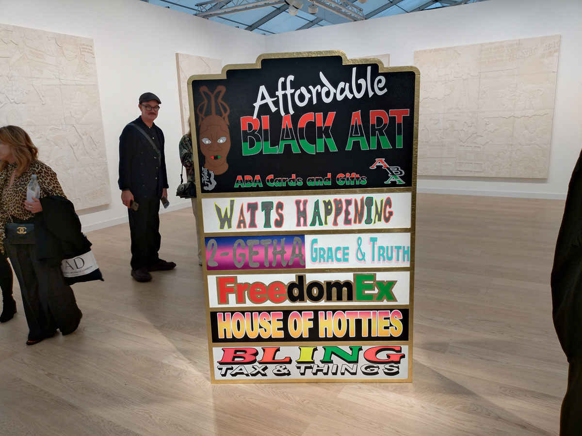 3. […] 3: Lauren Halsey – I almost don’t want to say it about such a part of the establishment gallery (or operation, they are far more than just a gallery now) but what a great big relief it is to to get to the big Gagosian booth and at last find a bit of attitude, a bit of a challenge, a bit of bite, a bit of something. I guess Gagosian don’t have to play it so safe, then again, I do believe the were the first gallery to declare their booth a complete sell out (although once again, who buys it? Where does it all go? It isn’t always that black and white is it?).  Gagosian are presenting “new works by Lauren Halsey at the 2025 edition of Frieze London. Born in South Central Los Angeles and based there, Halsey is known for large-scale works and immersive installations that draw on the histories, architecture, social contexts, and vernacular poetics of her community” – – The Fair itself Part Three; Lauren Halsey brings a bit of attitude, a bit of a challenge, a bit …   […]
