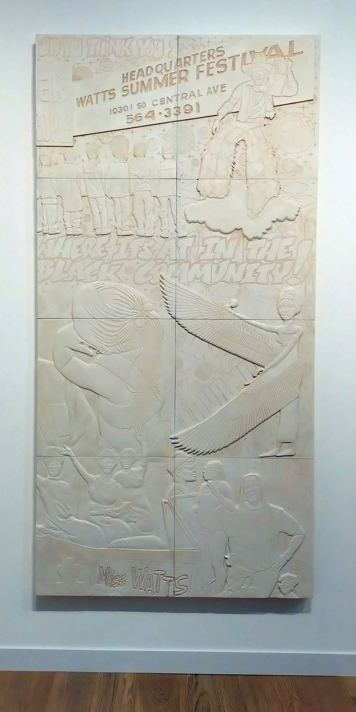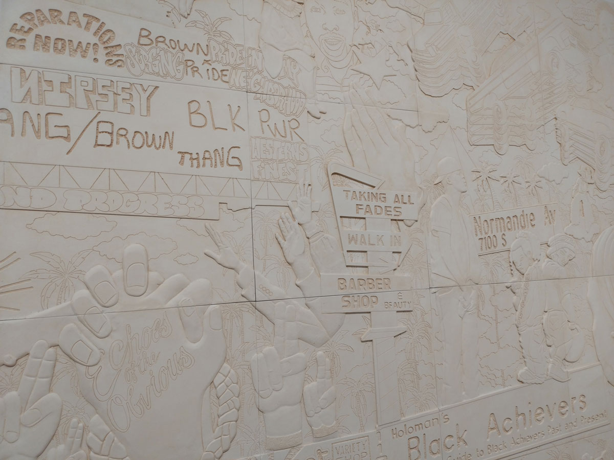 “The installation brings together several components and offers a portal into Halsey’s latest exercise in world-building and fantastical flight: In the centre, a six-foot-tall plaza sign honours the textual iconography, colour palettes, and creative wordplay found on Black-and Brown-owned business signage in working-class neighbourhoods. Surrounding the plaza sign are monochrome protruded engravings (2022 – ), sculptural reliefs that assemble a historical, contemporary, and mythic graphic record of South Central LA. Lastly, dense compositions of wallpaper on the structure’s exterior showcase the multiplicity and abundance of Blackness and Afro-diasporic expressive life via its innumerable forms, colours, textures, bodies, complexions, and frequencies”.