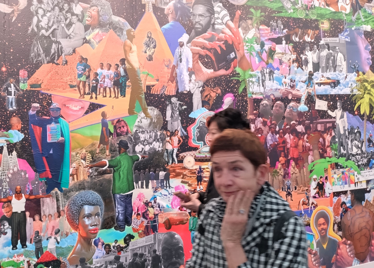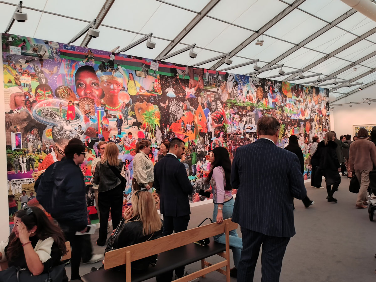 The combination of the three elements are immediately powerful, dynamic, and to some extent, from this London point of view, otherly as in, in some form or other, from another place.  Lauren Halsey’s work feels alive, it feels very now, it feels challenging, engaging, it feels a little bit more exciting than most things have been in here, especially those two identical giant pieces of collaged wallpaper on two of the big exterior walls of the very big booth, that wallpaper is so full of positive life, art, pop, colour…