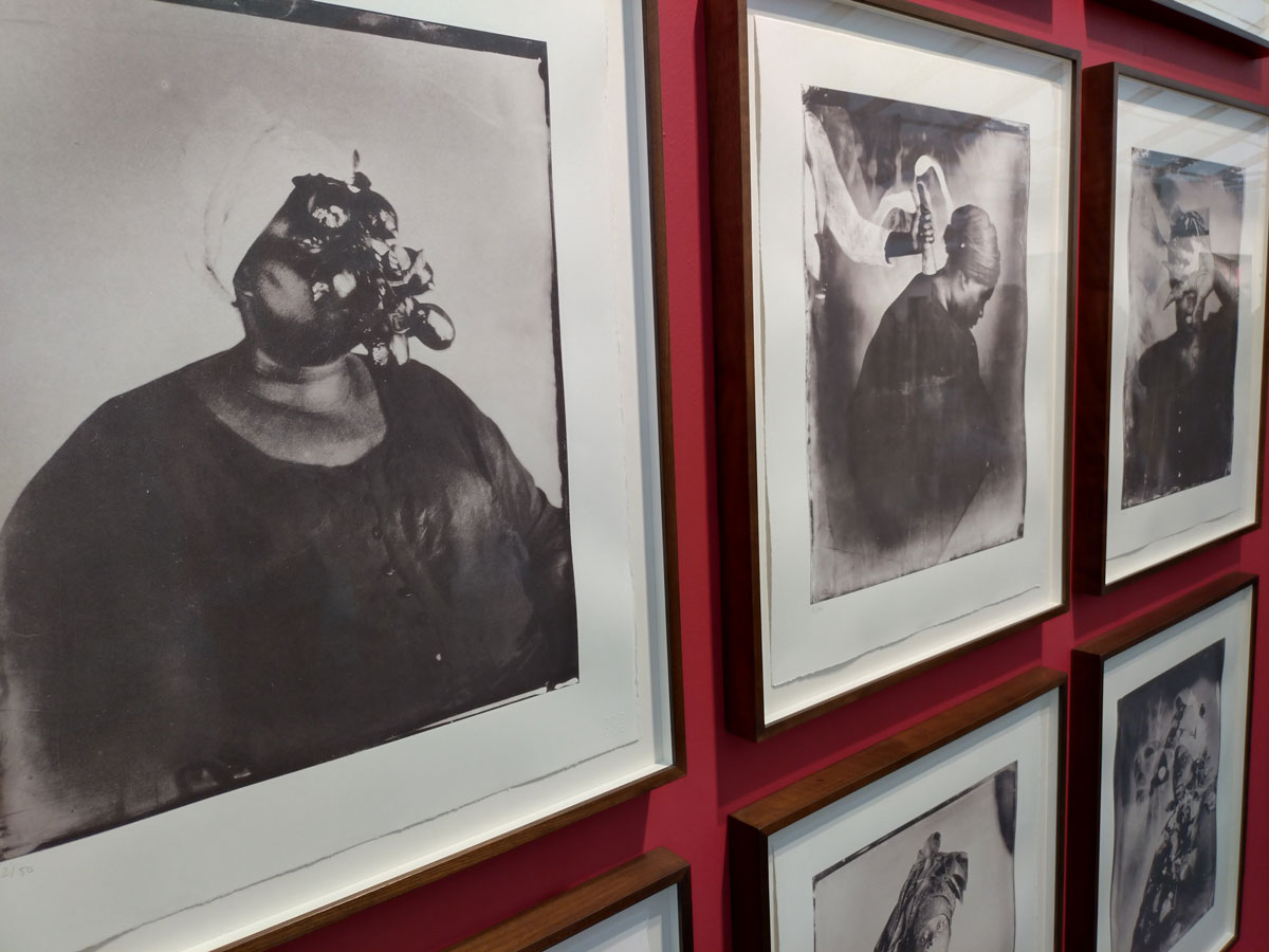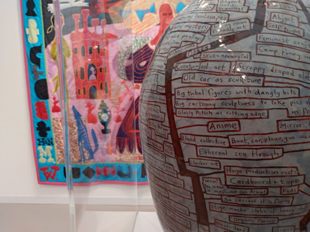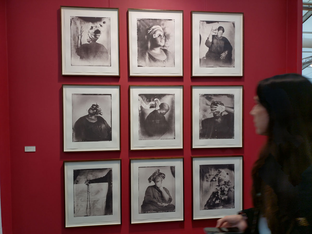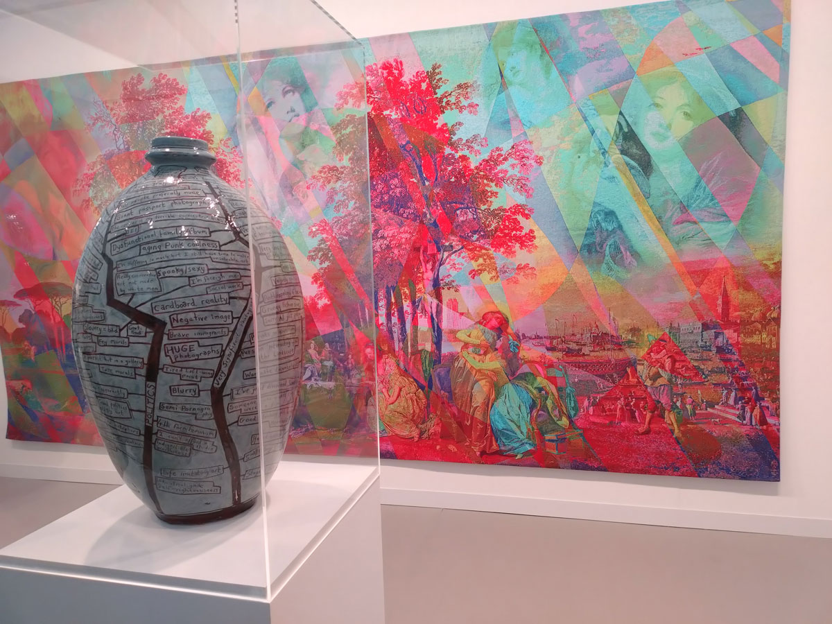Meanwhile alongside the aforementioned wall of Khadija Saye‘s work that’s quietly away from the internal noise on the outside wall of Victoria Miro‘s rich crimson red booth, we find rather a lot of dare we call it entertainment? Must admit I rather enjoyed the big Grayson Perry tapestry as well as his I know Who I Am quilt, wonder if I might have liked it so much if I had looked at the label first? I do find his thoughts rather irritating at times. By the way did I just get berated over a piece of art that I liked, was it really dismissed as not being art and instead just a bit of textile design? Really?