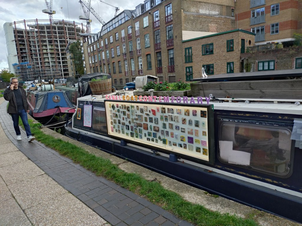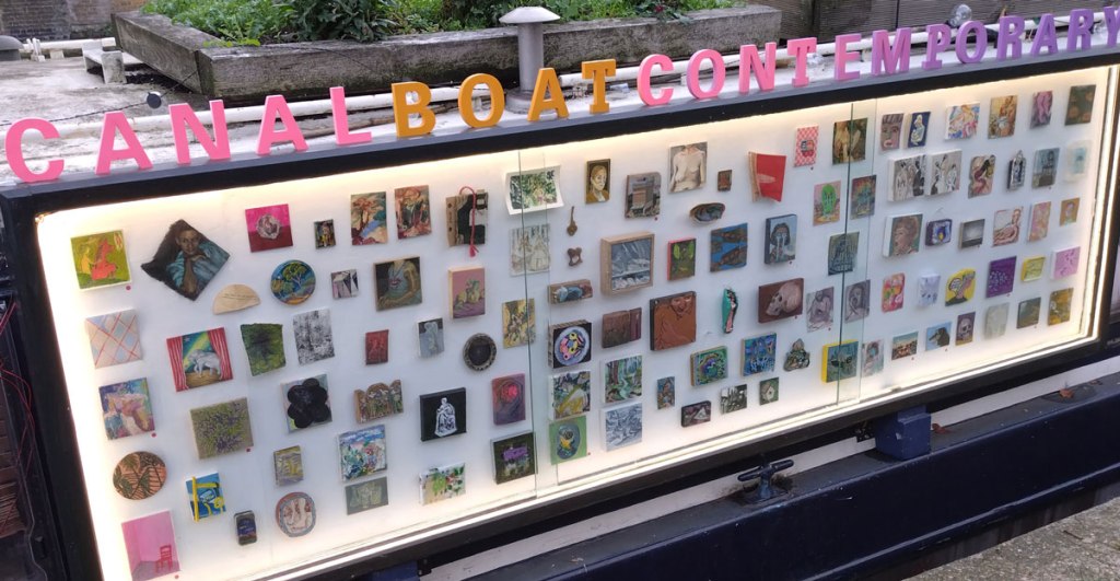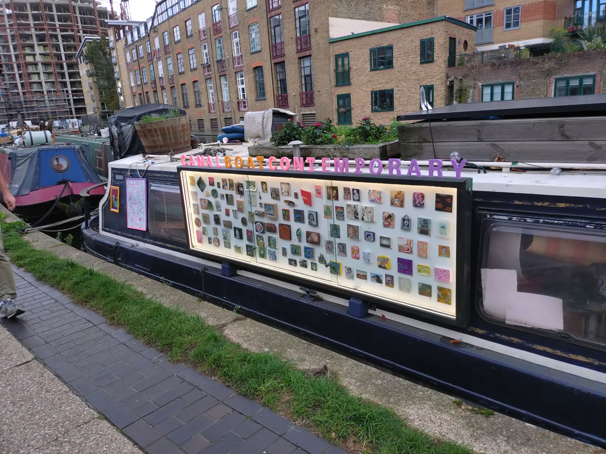 Canal Boat Contemporary, can be found on the towpath by Broadway Market, Hackney, London E8 right now. The boat’s Instagram feed will keep in touch with the constant movement, canal rules mean a more is required every couple of weeks – Canal Boat Contemporary