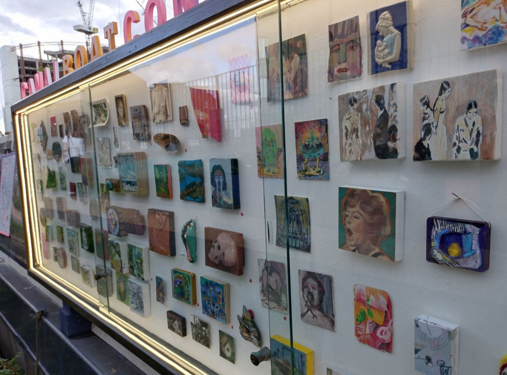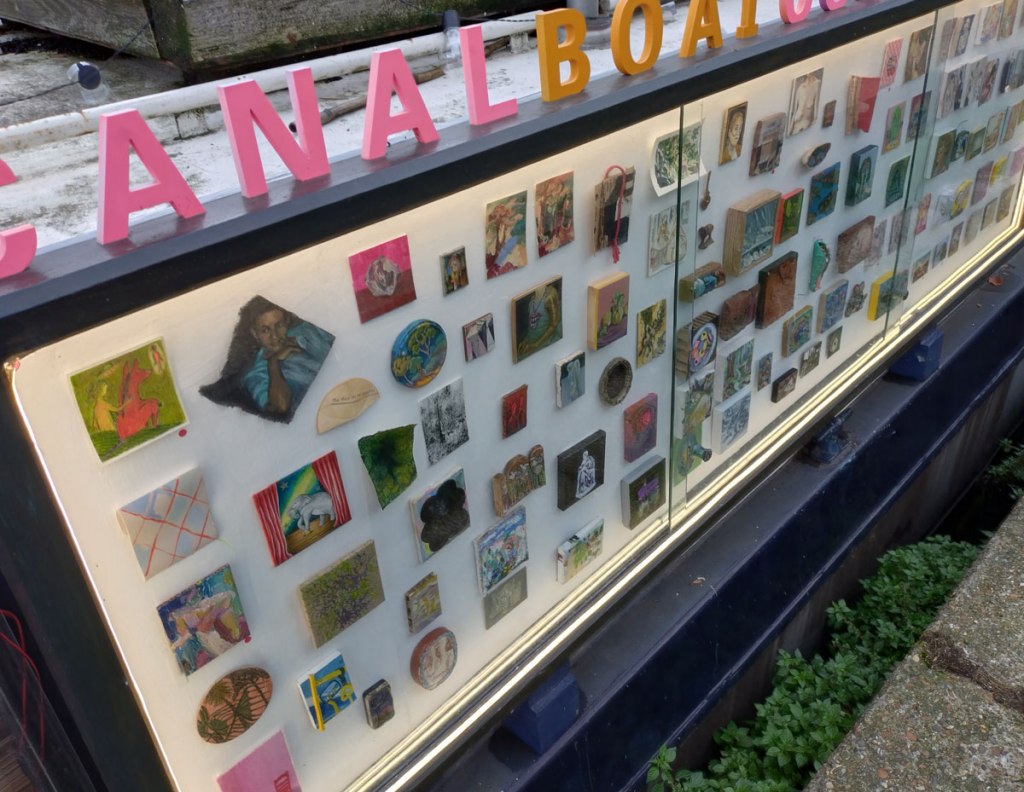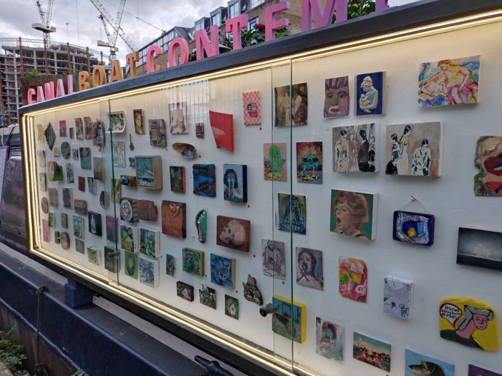 And at some point last week, the Canalboat Contemporary narrow boat slipped through that boat-scrapping tunnel and came back East, she had been over on the West Side of London for a couple of months and it wasn’t that were were being lazy, it just never seemed like there was time to go find it over on the other side of the city where as having the boat back on this side of London means we can just detour a little when hitting the post office or whatever we might need to hit. I mean, as wonderful as that gallery on the side of the boat is (and we have said how wonderful it is a number of times over the last year) and I almost said that “little gallery on the side of the boat”, it might be small in terms of actual size but that’s about all, it is a rather big (hearted) thing and as I was saying, as wonderful as that gallery on the side of the boat is, it hasn’t quite warranted a trek to the other side of the city. The boat is back East now though and east is east as they say. For the last couple of weeks there’s been a rather ambitious group show happening, a show that was on for two weeks. Over a hundred artists and tiny contemporary paintings packed into the cabinet, it started off just down the towpath from Frieze Masters during Frieze week, it has now moved to Hackney and the bit of the canal that’s right by Broadway Market, here’s another #43SecondFilm…
