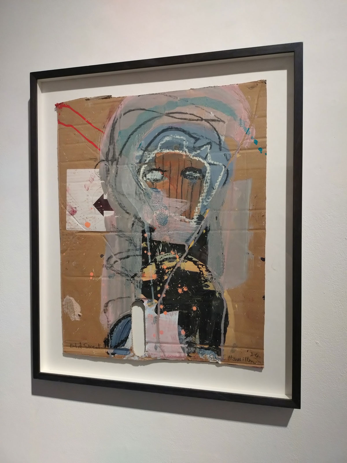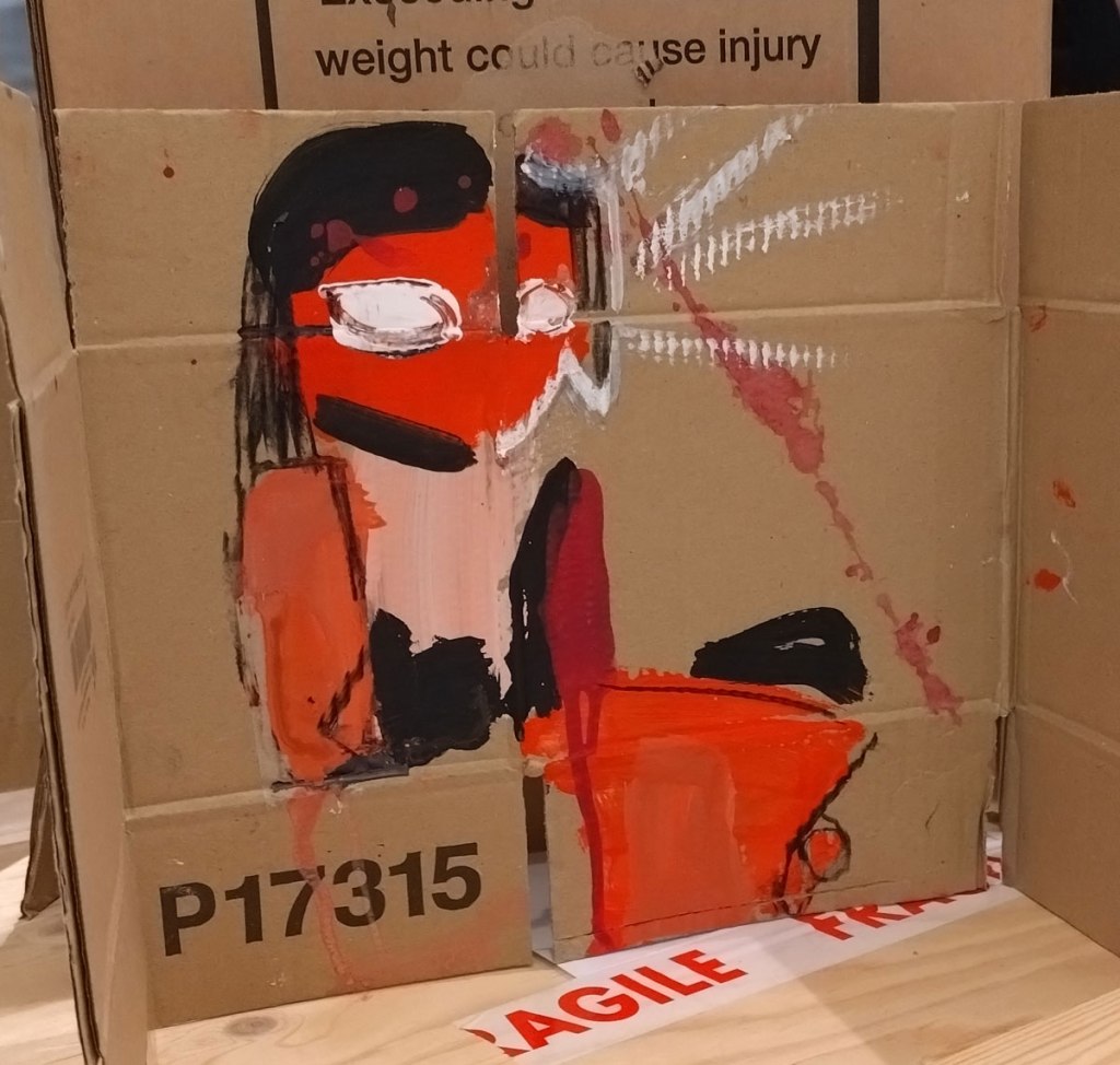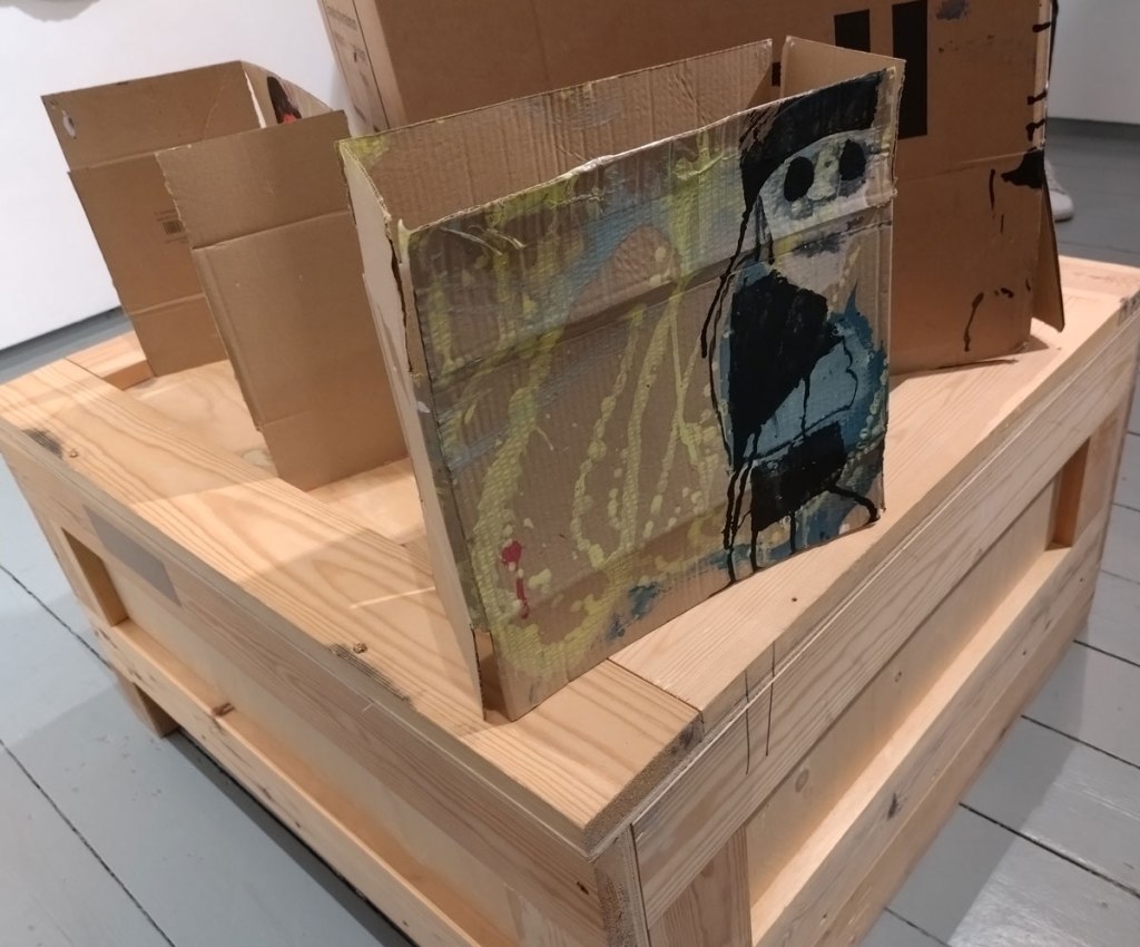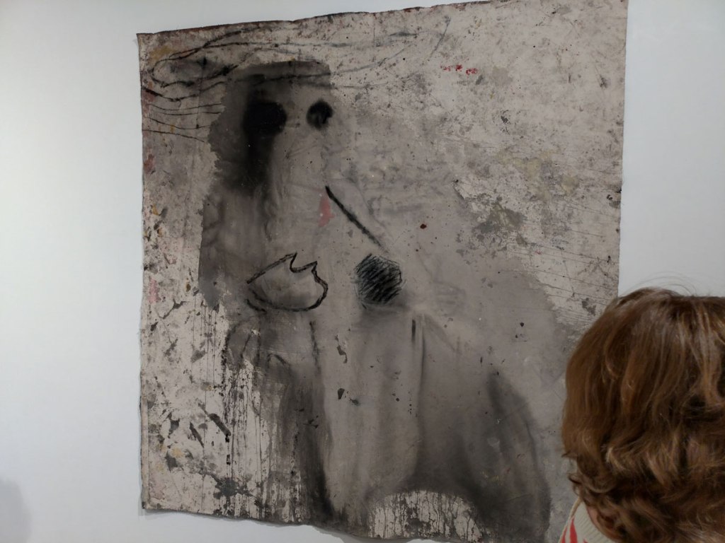I kind of thought I knew what to expect in terms of Susie Hamilton’s Underground drawings and paintings, I kind of expected sketchbook size intensity, her washes of brushwork, I got far more than that though. These big pieces are exciting, the immediacy of the drawing and painting on scrap cardboard, the mark making on pieces of canvas, it feels like she taken the urgency and the no time to really think about it you have to have when drawing on the tube or on a short bus ride and retained all that spontaneous decision making in her studio when taking these peices further. These big paintings look exciting together in here on the gallery wall, I like that most of the work hasn’t been tamed by a frame, that the cardboard is as feral as the marks on them and yes the play on underground from tube trains to the literary underworld.