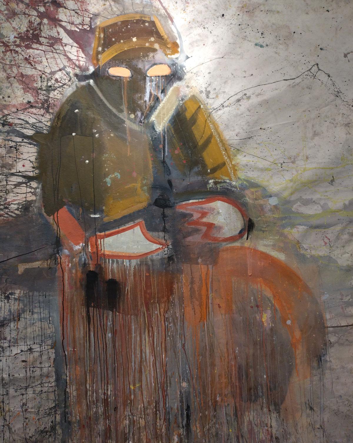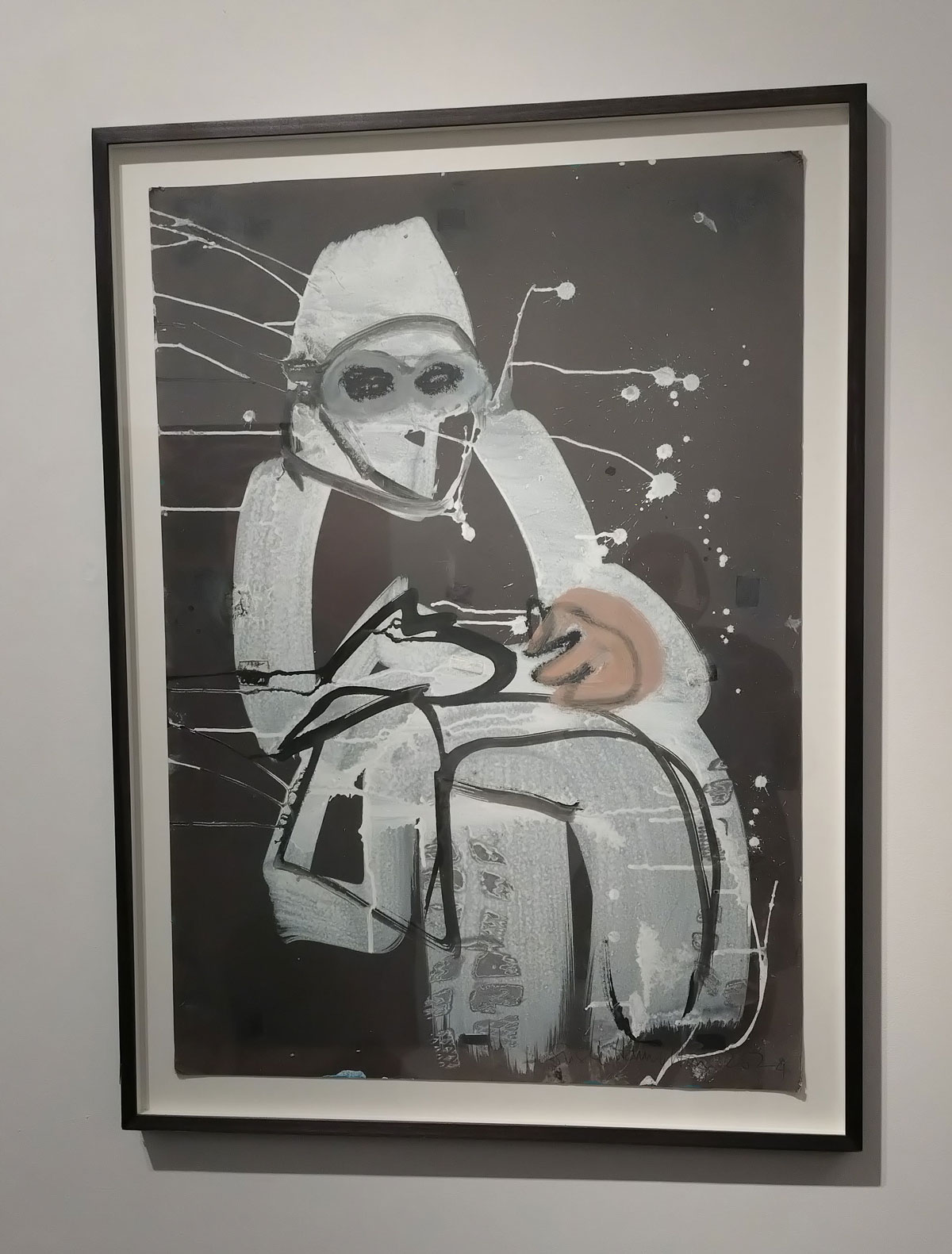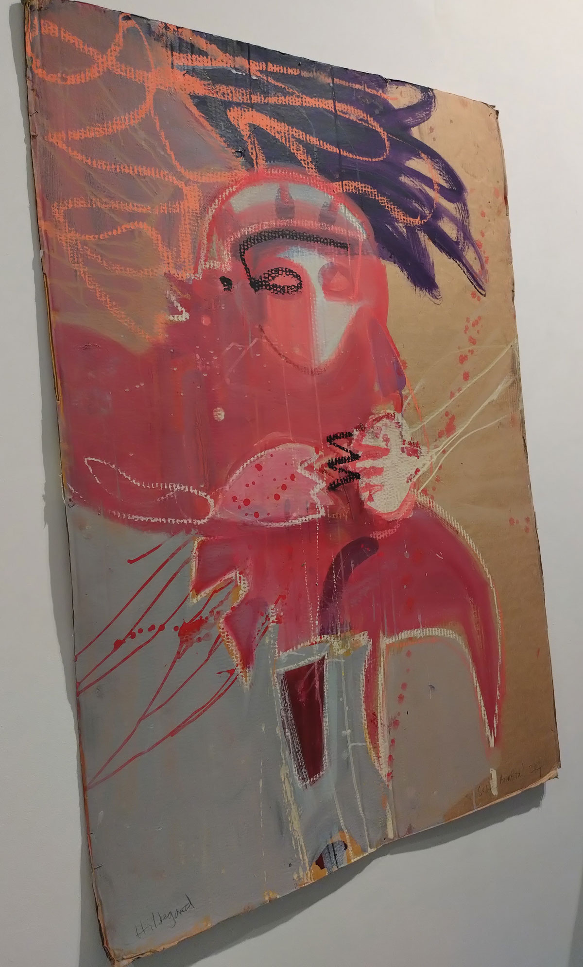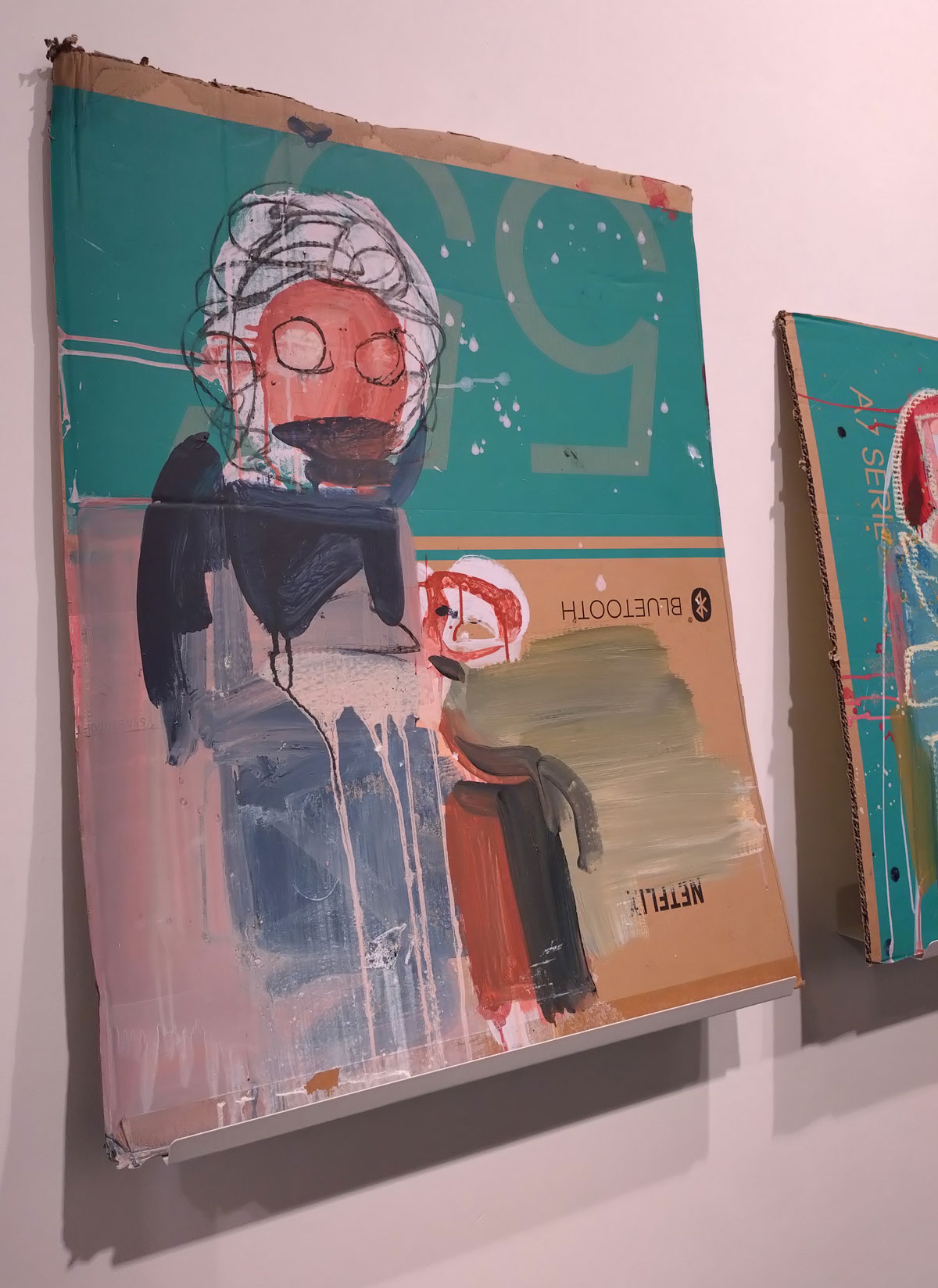 I kind of thought I knew what to expect in terms of Susie Hamilton’s Underground drawings and paintings, I kind of expected sketchbook size intensity, her washes of brushwork, I got far more than that though. These big pieces are exciting, the immediacy of the drawing and painting on scrap cardboard, the mark making on pieces of canvas, it feels like she taken the urgency and the no time to really think about it you have to have when drawing on the tube or on a short bus ride and retained all that spontaneous decision making in her studio when taking these peices further. These big paintings look exciting together in here on the gallery wall, I like that most of the work hasn’t been tamed by a frame, that the cardboard is as feral as the marks on them and yes the play on underground from tube trains to the literary underworld.