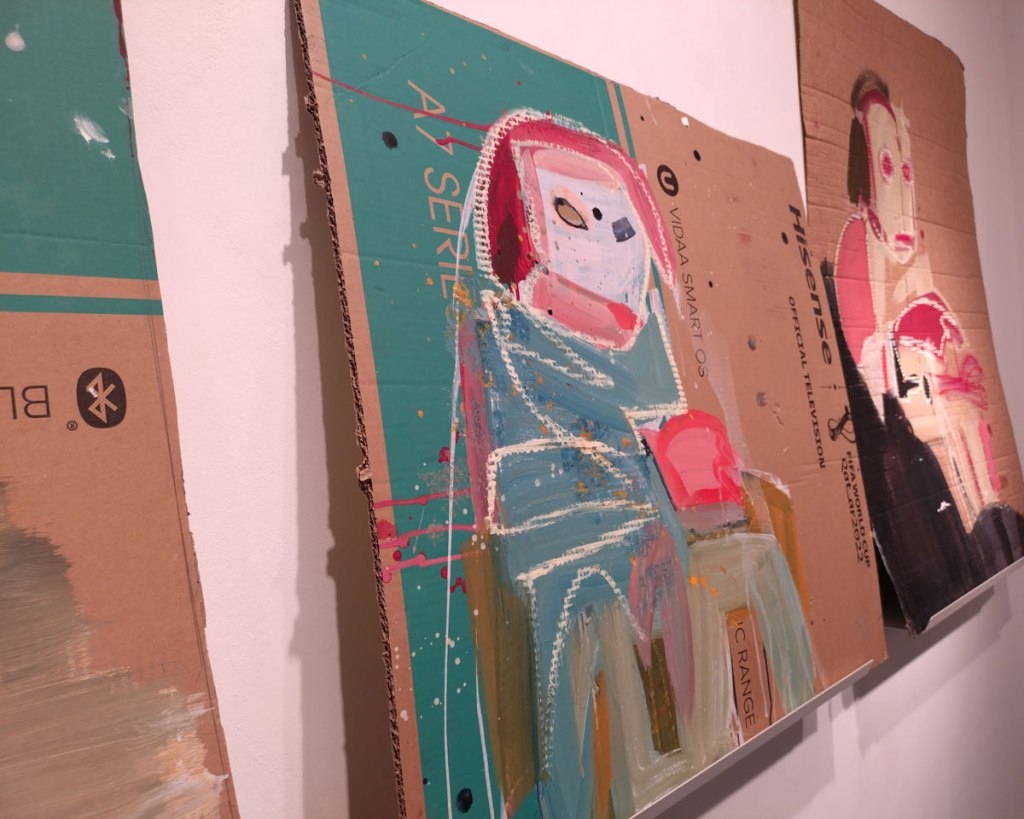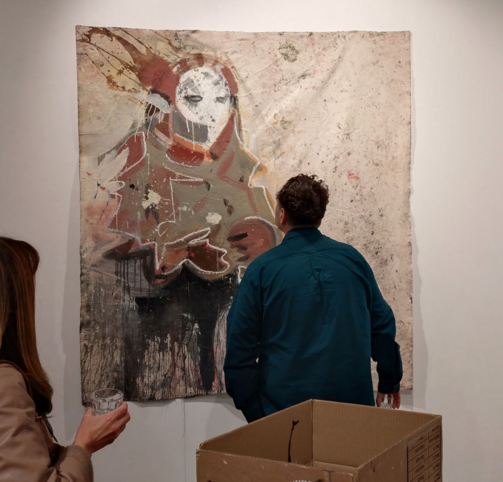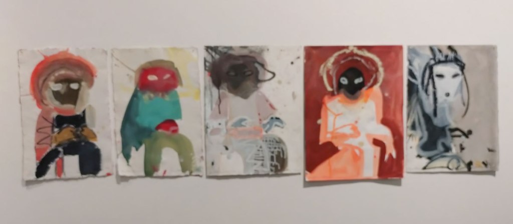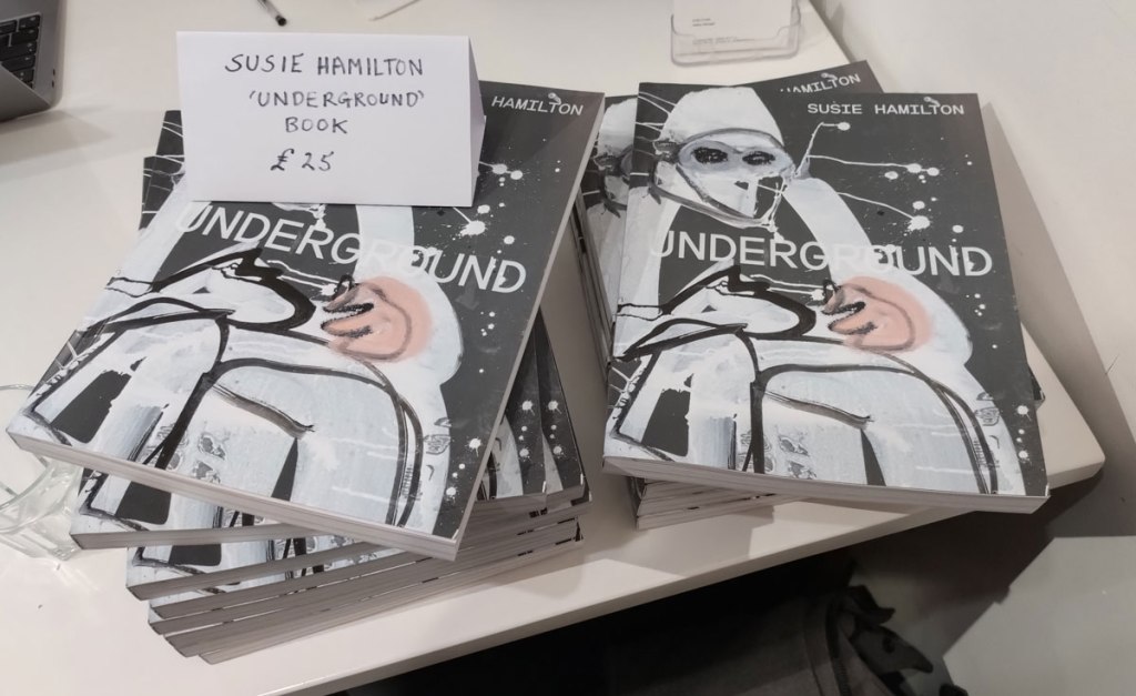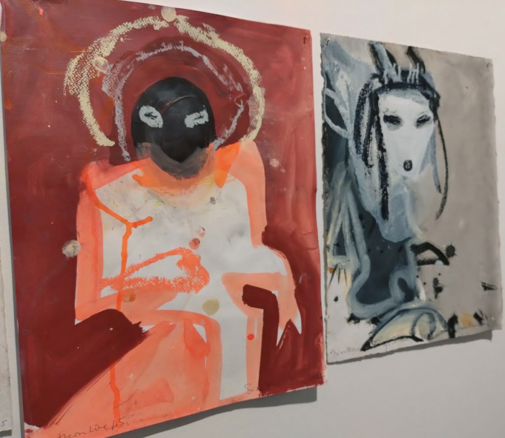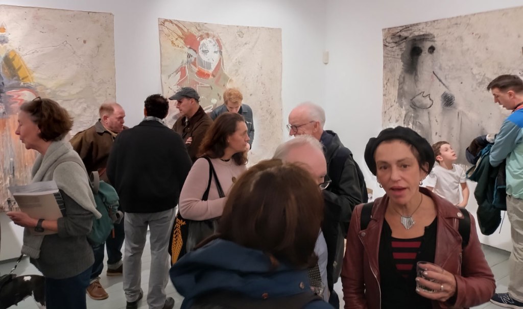 Susie Hamilton, Underground at Paul Stolper Gallery, London WC1 – October 2025 – Off on the train from Hackney again, East London to West End although mostly on the Lizzy line rather than the actual underground. The Elizabeth Line is fast, way too fast when it comes to drawing, them beautifully slow old tube trains are far better when it comes to drawing people, sneaking out a ever present sketchbook while your subject is lost in a book or more likely these days a phone. How many stops have you got them for? No don’t get off yet!  I like Susie Hamilton’s style, the way she paints, the energy of her work, the marks that pull her pieces together, I was particularly keen to see these pieces birthed from drawings on London’s tube trains, a practice that interests me immensely…