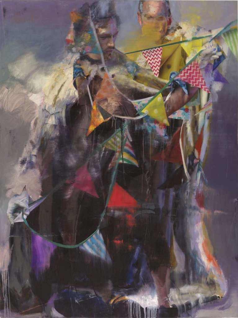 Two recurring motifs – bunting and ermine – cloak the shadowy protagonists of this series. Bunting, once a naval signal and now a token of festivity, functions as a hollow signifier of unity. Where national flags proclaim allegiance, bunting gestures only towards generic celebration. Its physical lightness and ephemerality become, in Harrington’s hands, emblems of the fragility and vacuity of such symbols. By contrast, ermine cloaks – ceremonial garments historically reserved for European monarchs and long associated with purity and prestige – carry the heavy residue of inherited authority. Their opulent weight bears down upon the figures, offering a visual counterpoint to the insubstantiality of the bunting. The tension between these two materials crystallises Harrington’s critique of power as theatre – a spectacle in which the rituals of grandeur persist, even as their ideological substance has long since disintegrated