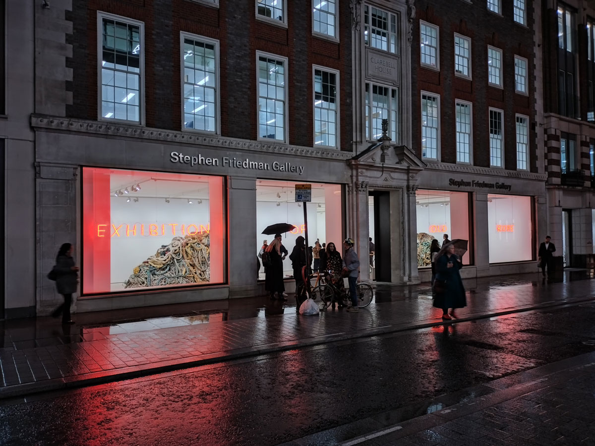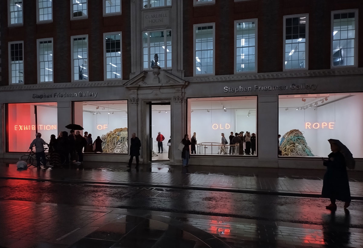 David Shrigley, Exhbition of Old Rope, Stephen Friedman Gallery, Cork Steet, London, 13th November 2025 – Nuffin’ but a pile of old rope mate! Money for what? You’re having a giraffe. Opening night of the new David Shrigley show, and it really is a show, great big art show. the ongoing circus of it all, at the rather plush West End gaff of the global beast that is Stephen Friedman Gallery and all on a cold wet Cork Street on a November Thursday night (well the reflection of his orange neon looked good on the wet street if nothing else). Apparently he wants a million quid for his old rope, well that’s what’s made the headlines before hand, that tedious (macho?) thing about the price of art and my price tag it bigger than yours or just his mocking of it? Must admit, cynical smile aside, this one had me curious, I must admit I rather like the idea of a pile of old rope, and yes, I kind of wanted to see who would turn up on the opening night. Mostly I do rather like the idea of a pile of unwanted old rope in an art gallery and the questions that might ask, the points it might make, it wouldn’t be the first time it has been done but some people get more attention that others when they do this kind of thing (ditto the Brian Eno opening attended this evening just before this one).