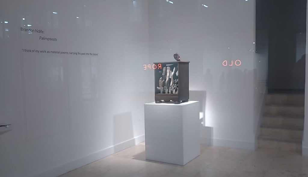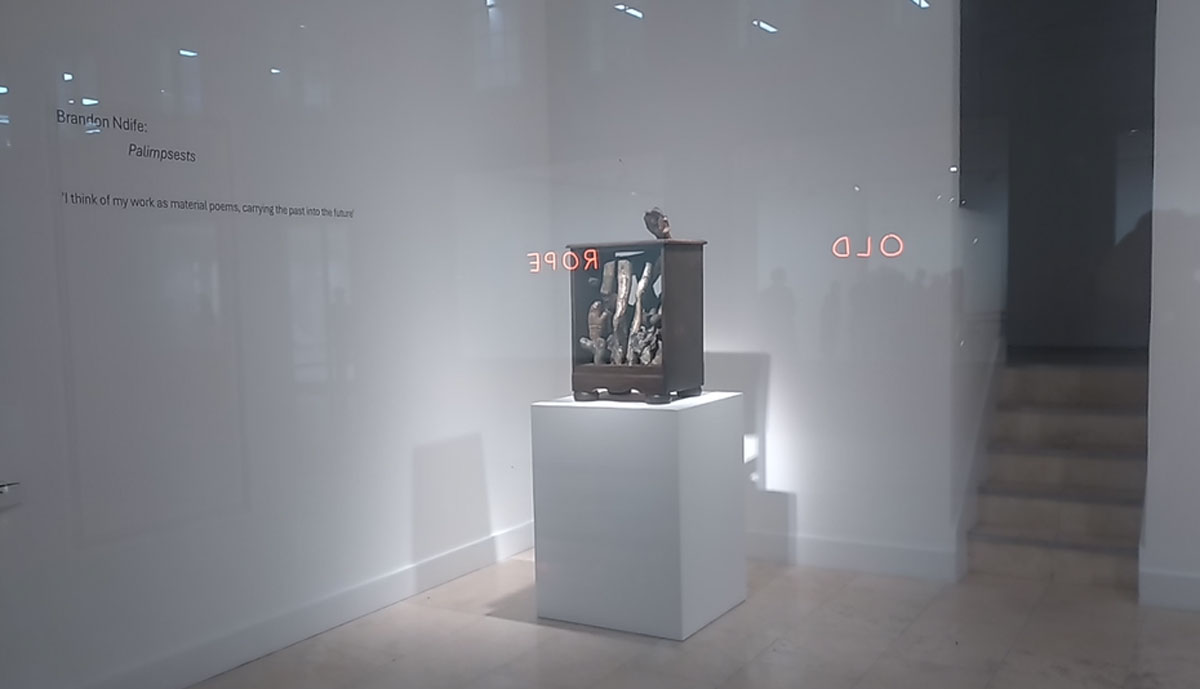 Oh and there’s Shrigley’s neon reflecting in window of Brandon Ndife’s excellent Palimpsests exhibition, currently on show at London’s Holtermann Fine Art, a exhibtion of piece of art made from unwanted disguarded bits of old furniture picked up of the street, make ofthat what you will. (sw)