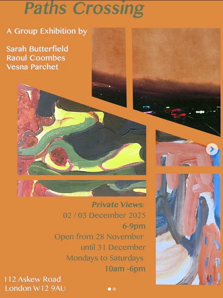 Paths Crossing happens at 112 Askew Road, Shepherd’s Bush, London W12 9AU. Mondays to Saturdays, 10am until 6pm. For ,ore go explore the Instagram feed the three artists – Raoul Coombes / Sarah Butterfield / Vesna Parchet