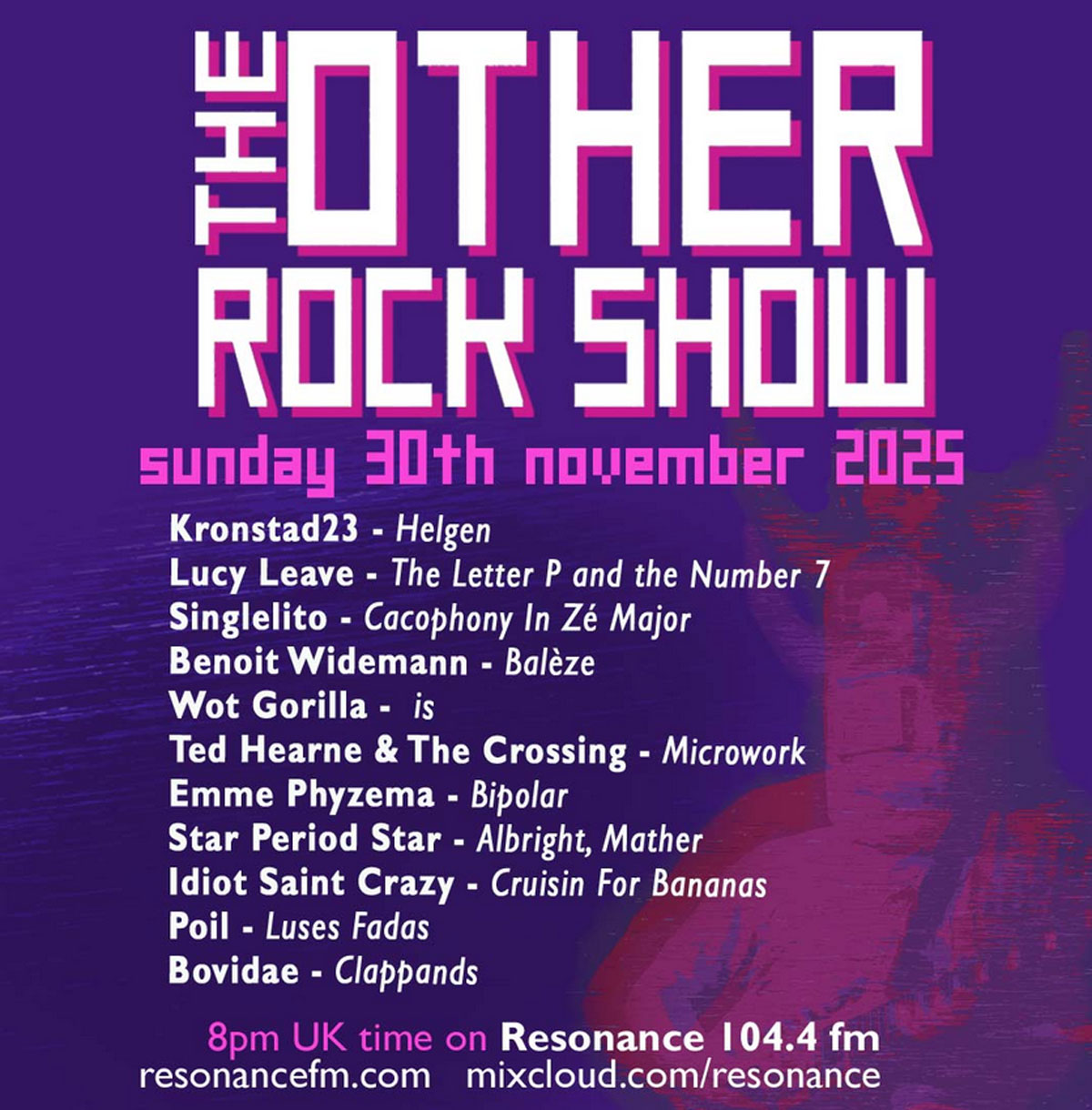 Last night’s Other Rock Show featured, well you can see who it featured on the playlist just down there, last night being Sunday 7th December. The show is currently on air every Sunday night via London Art radio station Resonance FM, it goes out live (no re-records here, live radio is where things are at) via 104.4FM in London, and worldwide on line. if you missed the show then listen back via the Mixcloud embedded just down there…