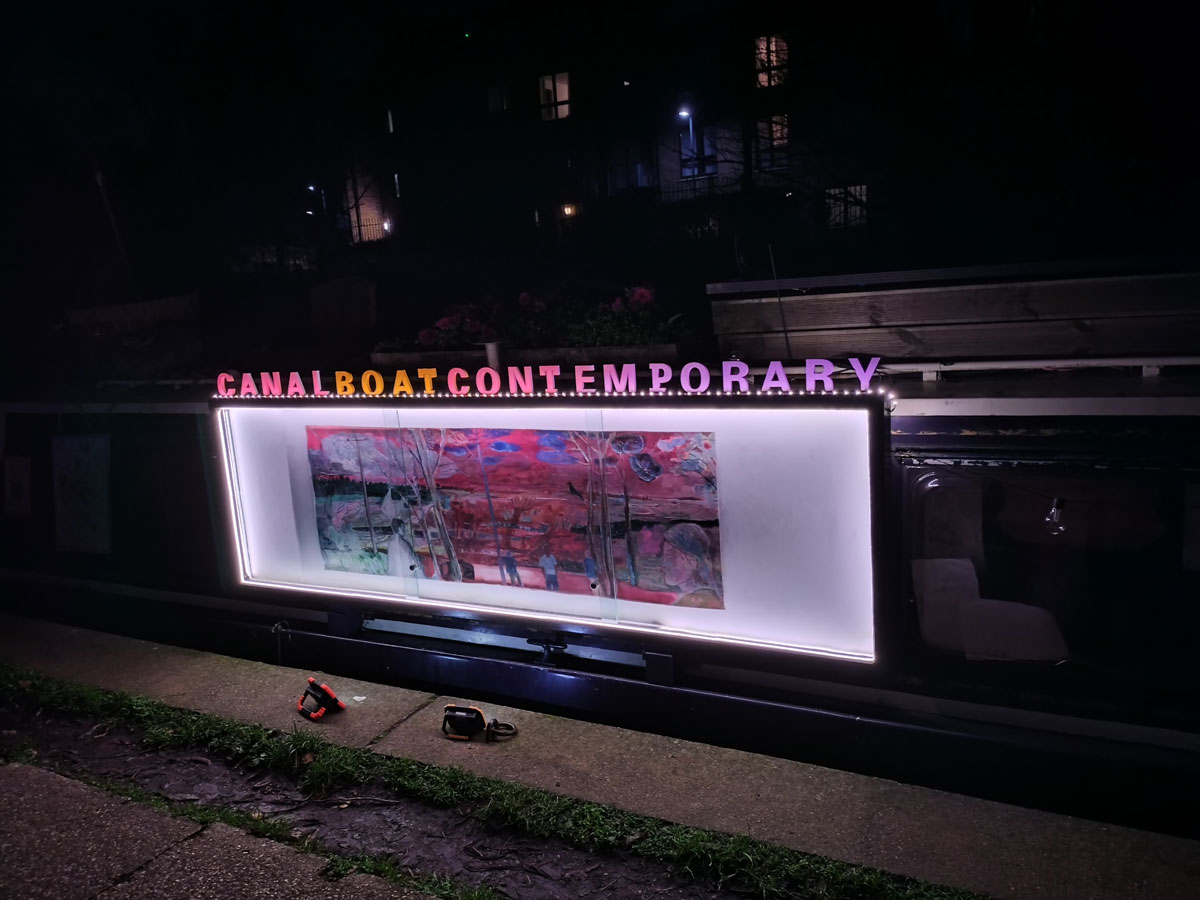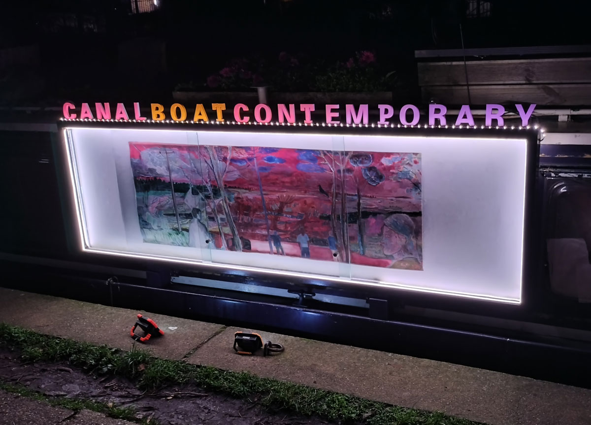 A quick catch up with the boat floats on, the non-stop thing that is the Canalboat Contemporary, weekly exhibitions in that box on the side of the canal boat that floats up and down Regent’s Canal here in London as it has been doing all year and for quite a bit longer than that now. For the last three or four weeks the floating gallery has been tied up first in Hackney by Broadway Market and now a little further on down by the greenery of Victoria Park. This week we find a Dan MacCarthy exhibition happening in the December gloom of East London, it would be fair to say the weekly gatherings for the openings aren’t quite so much fun or indeed quite as busy in the darkness of winter as they are in the bright light of Summer, it was rather cold down on the the footpath last week for Dan’s opening and the unveiling of his rather lyrical painting Will ‘O the Wisp.