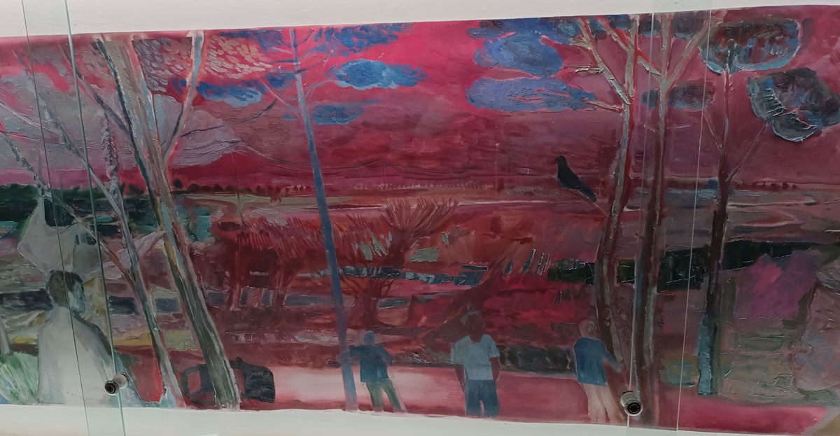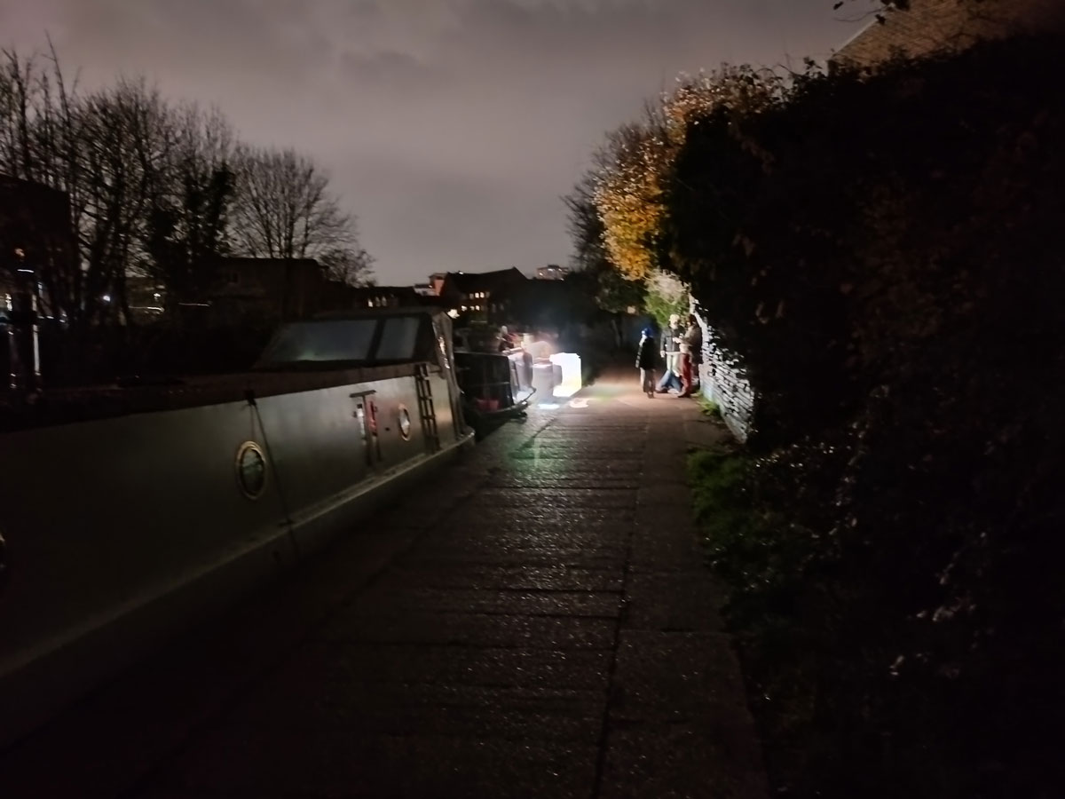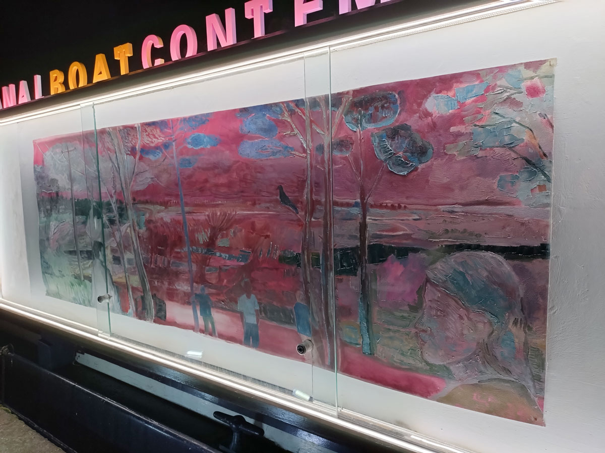 Will O’ the Wisp, a large piece for the boat, 180×60cm, oil on canvas, a piece painted recently, a piece that rather dramatically takes up the whole of that now familiar box on the side of the boat. It is, so we are told, “MacCarthy’s modern interpretation of the folklore surrounding ghostly lights seen across wetlands — natural bioluminescence once thought to lure, guide, or mislead travellers. In his version, the lantern becomes a pair of car headlamps” and here we are trying to view what looks to be a rather intriguing interpretation of the piece in the darkness of the towpath and the harsh lights of the canal boat. I like it, I like the movement, I like the flow of the painting, or at least of what I can see of the painting in this light (really need ot come back in the daylight)