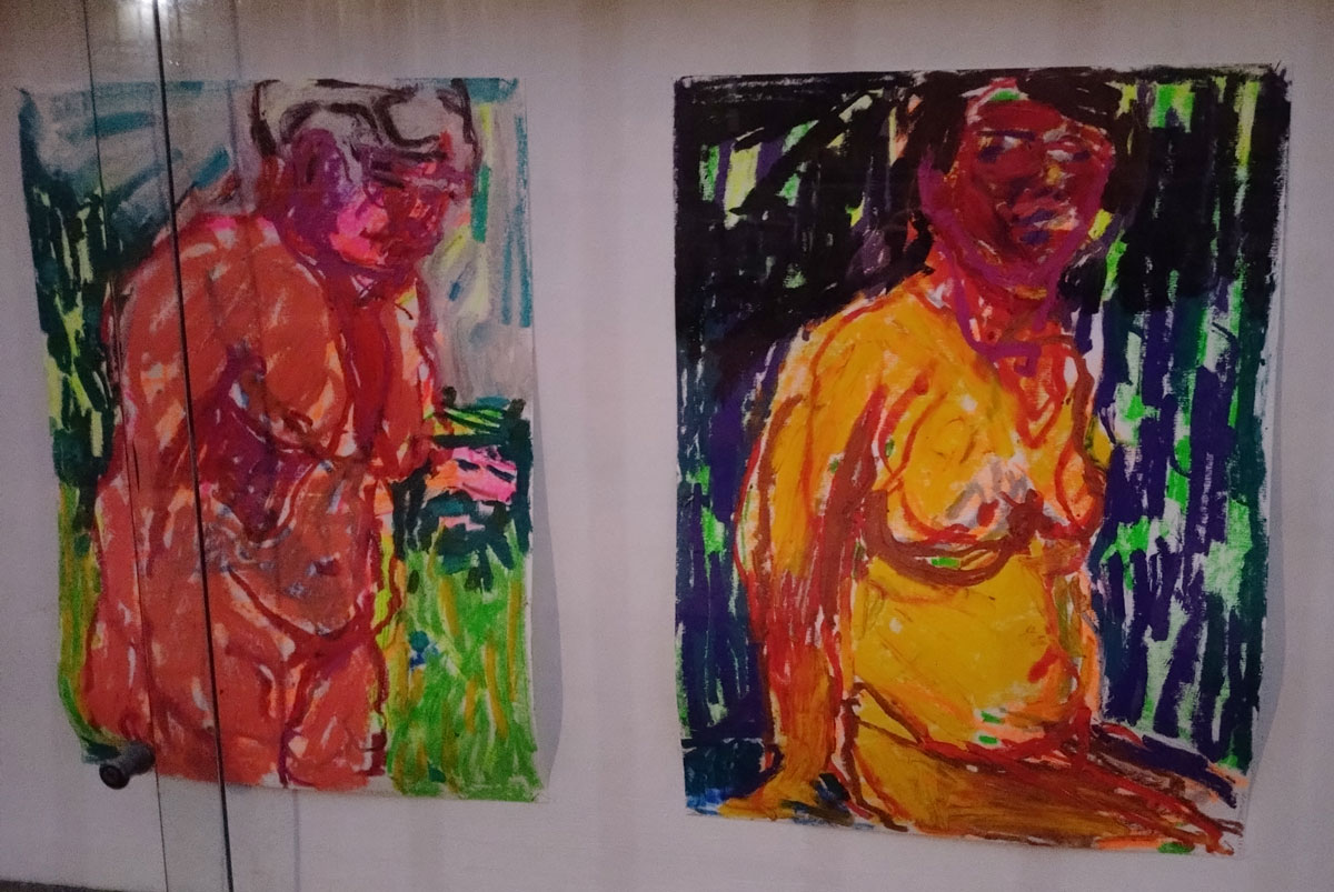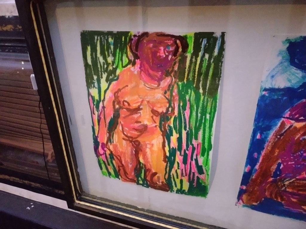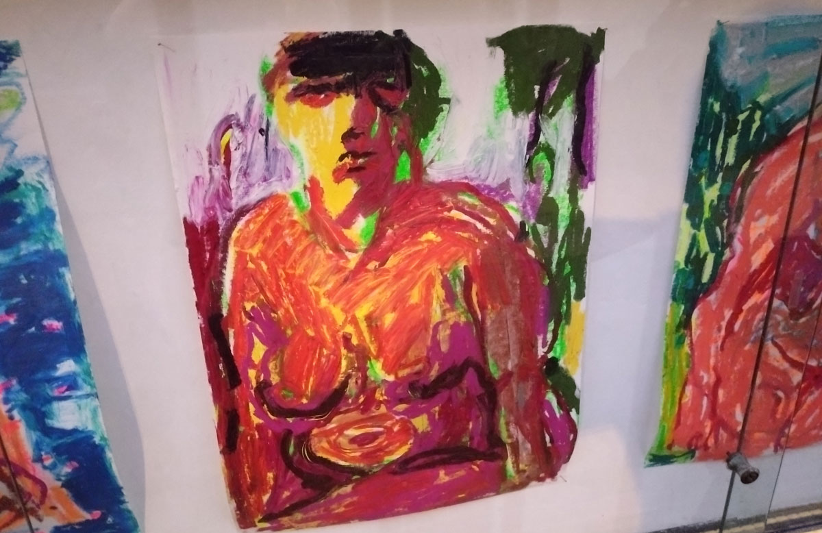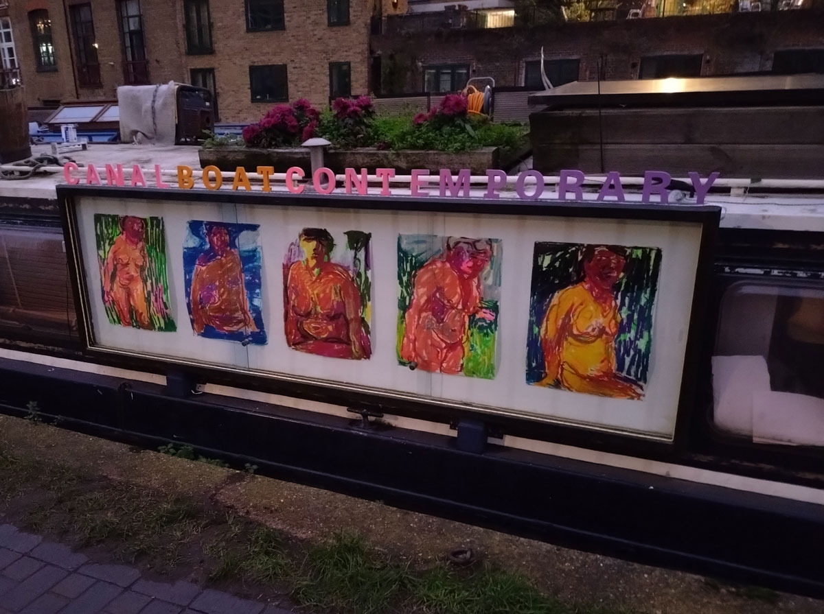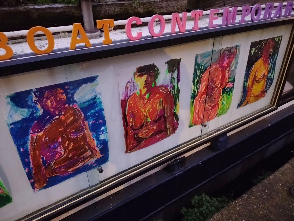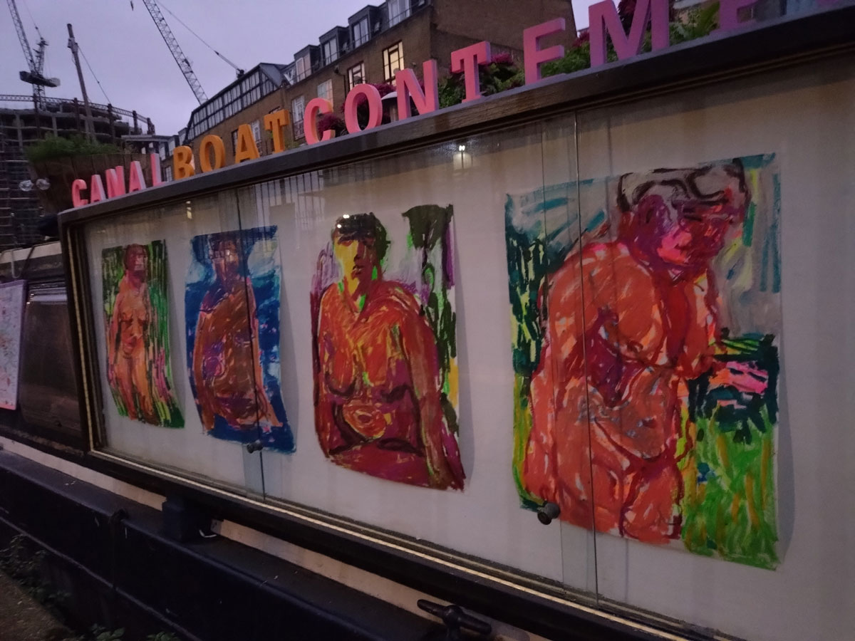 “such a pleasure to welcome Jennifer Pochinski to London last week – and to host her fabulous riot of colour Five Nudes, which has been bringing zing and energy and a slice of Mediterranean sunshine to the towpath all week. Last couple of days to see the show in person…it’s a treat not to miss” shouted the captain of the boat. We caught it late on a rather dull Sunday afternoon, the European-based American-born painter certainly brought some rather energetic colour to the proceedings. Five works apparently created at the end of a six-month period of transition, when the artist was moving back and forth between Greece and Paris; “Working with oil sticks and pastels allowed me to keep working without a studio, and to let my habits dissolve so the environment could enter by osmosis. These works were made in the final days before I left Greece in October: a burst of urgency before settling for good in France. Something shifted in the process. Voilà…”