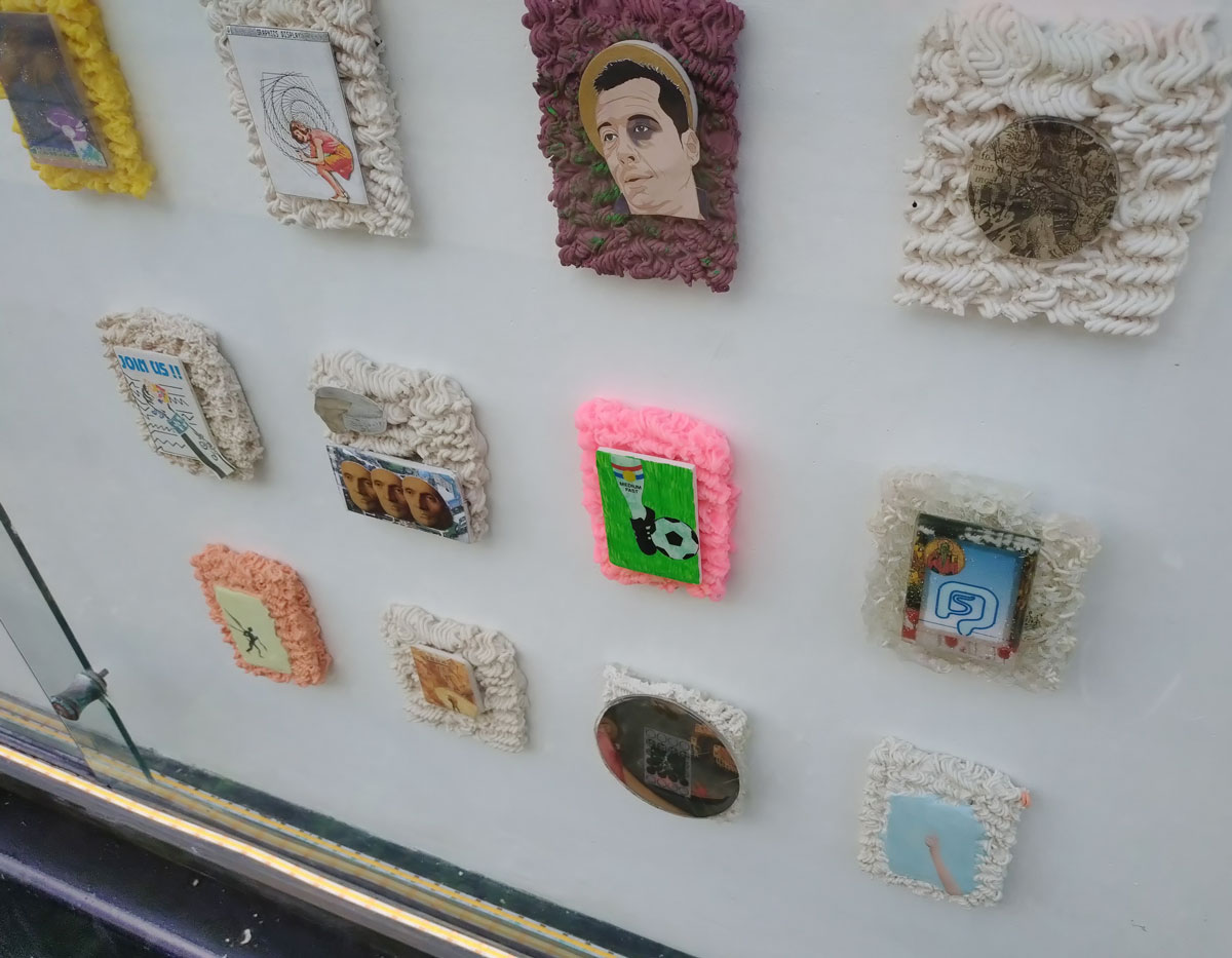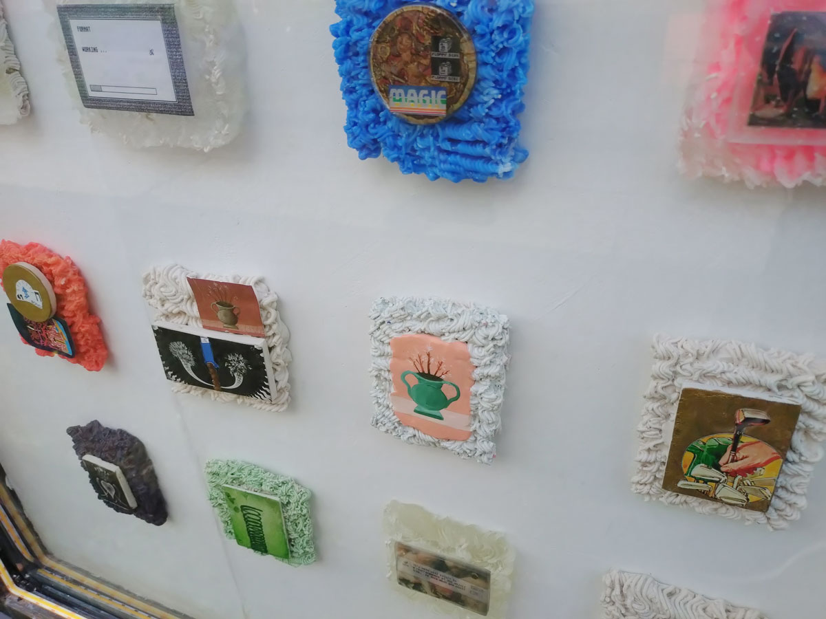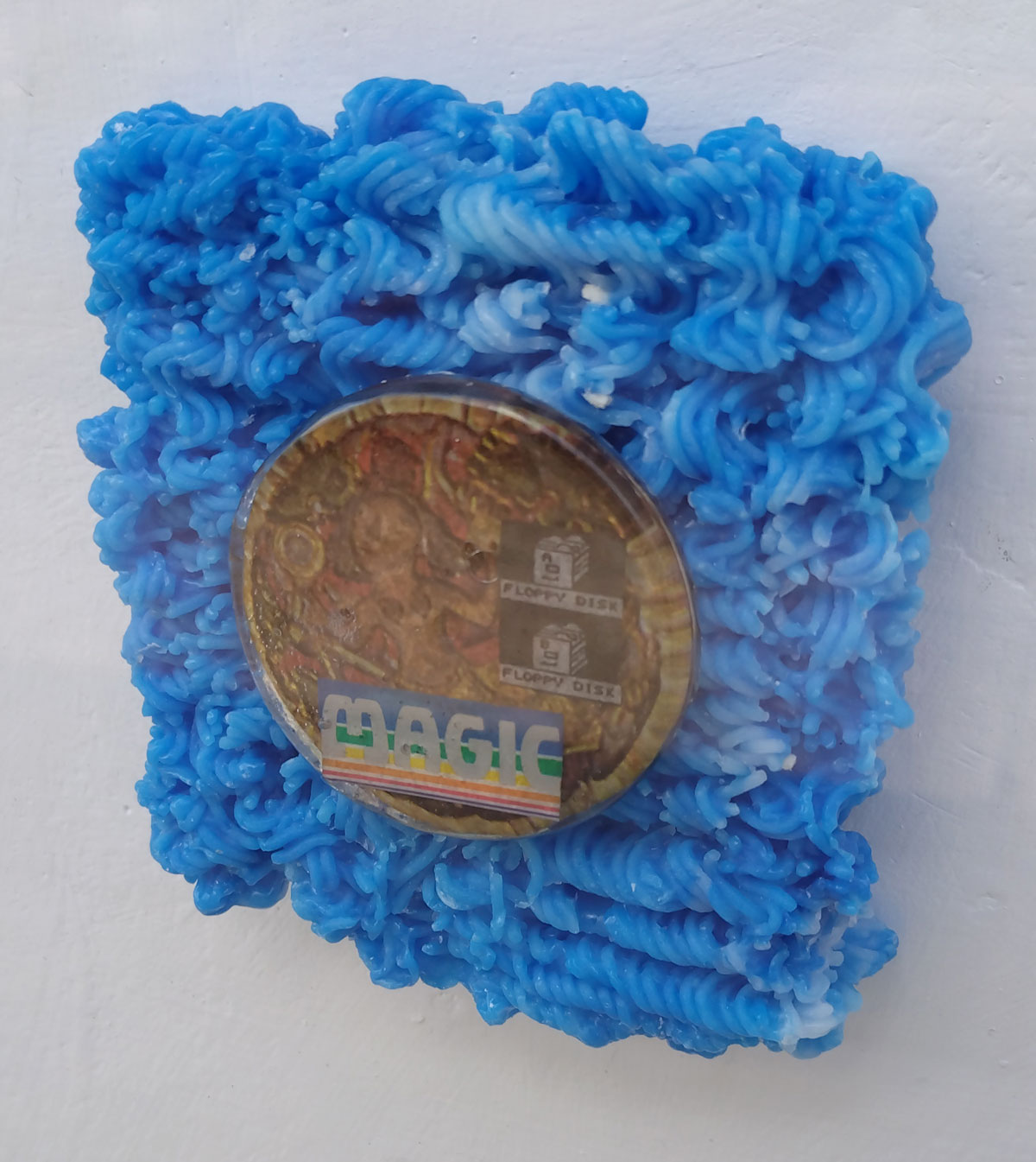 Liam Mertens was part of that rather busy Miniature Masters group show at Canalboat Contemporary back in August during Frieze Week and as a result was “chosen by the judges to have a solo show in our travelling glass cabinet of art”. I’m never a fan of judges and winners and pitching artists against each other like we’re at some kind of sports event, nor indeed am I a fan of entering and certainly not a fan of having to pay a fee to just enter some kind of on-line selection process, I have said this many times, I just don’t like it, art isn’t a competition. Liam on the other hand did pay his entry fee and as a result he has himself the prize of a solo show called Pull Gently. And yes, we’ll let Pushka, curator of the gallery on the side of the boat and indeed the man at the helm of his floating studio tell us about Liam’s work. I can’t say I was quite so enthusiastic about Liam’s paintings mounted playfully of hardened noodle backgrounds as Pushka or his judges were but hey, I guess there were kind of playful, here’s what the gallery said about the work; “an intriguing, humorous, playful, and somehow meaningful show. These techno-meets-renaissance vibes speak very much to our present – that kind of hauntological forever history we find ourselves in – yet in a way that doesn’t feel pastiche. More like a remix. They also just look really good!”