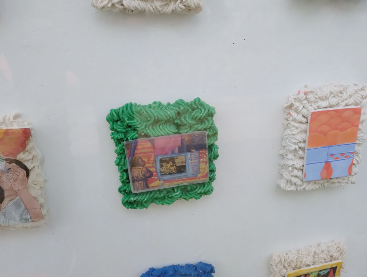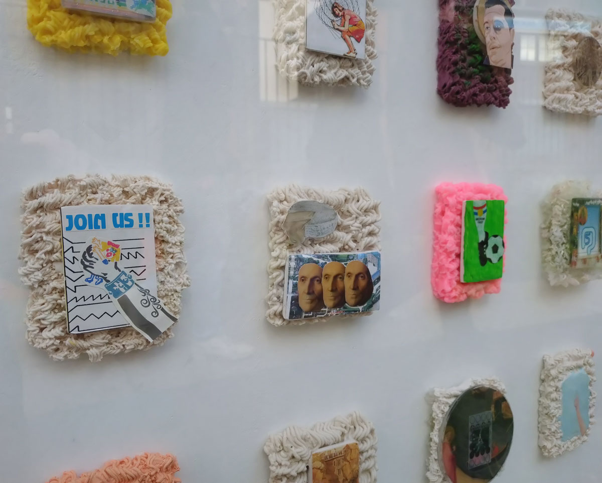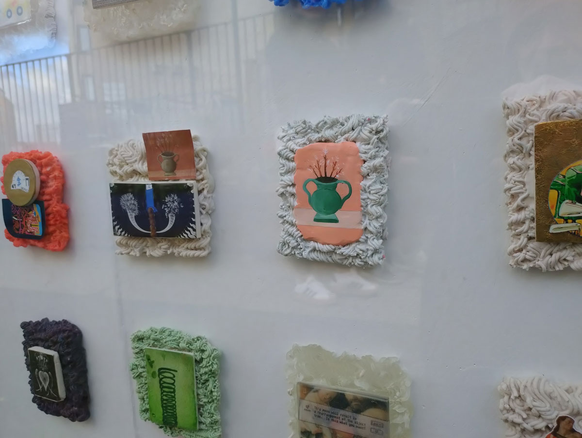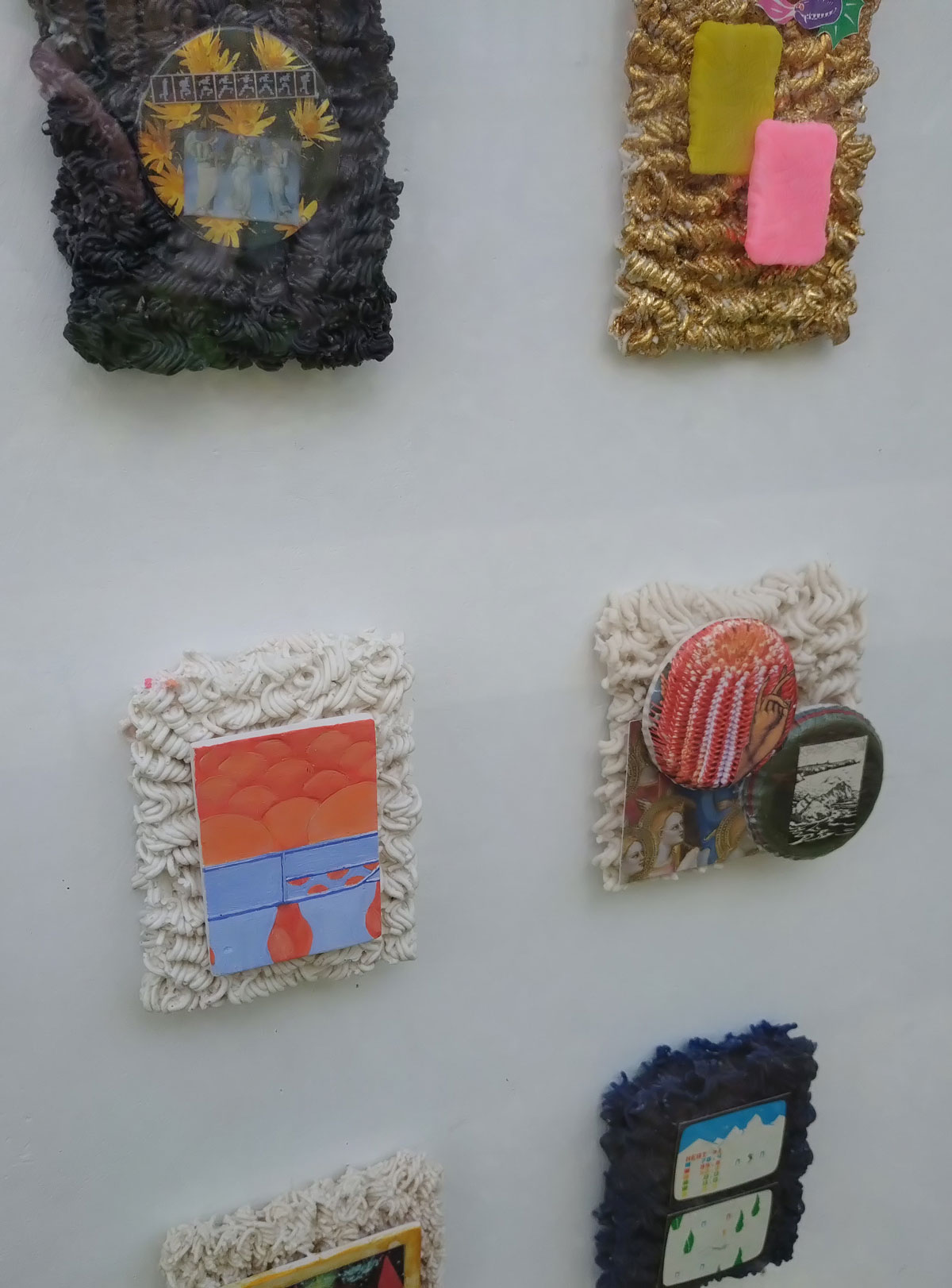 Liam Mertens was part of that rather busy Miniature Masters group show at Canalboat Contemporary back in August during Frieze Week and as a result was “chosen by the judges to have a solo show in our travelling glass cabinet of art”. I’m never a fan of judges and winners and pitching artists against each other like we’re at some kind of sports event, nor indeed am I a fan of entering and certainly not a fan of having to pay a fee to just enter some kind of on-line selection process, I have said this many times, I just don’t like it, art isn’t a competition. Liam on the other hand did pay his entry fee and as a result he has himself the prize of a solo show called Pull Gently. And yes, we’ll let Pushka, curator of the gallery on the side of the boat and indeed the man at the helm of his floating studio tell us about Liam’s work. I can’t say I was quite so enthusiastic about Liam’s paintings mounted playfully of hardened noodle backgrounds as Pushka or his judges were but hey, I guess there were kind of playful, here’s what the gallery said about the work; “an intriguing, humorous, playful, and somehow meaningful show. These techno-meets-renaissance vibes speak very much to our present – that kind of hauntological forever history we find ourselves in – yet in a way that doesn’t feel pastiche. More like a remix. They also just look really good!”