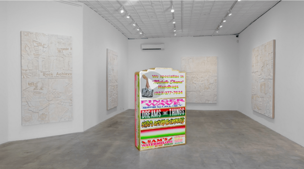 “The six-foot-tall sculpture from the plaza sign series (2024 – ) pays homage to the iconography, colour palettes, and creative wordplay commonly found on Black- and Brown-owned business signage in working-class neighbourhoods. Whereas signs like “Watts Happening” are tributes to artist – and community – run cultural centres, others like “Dreams and Things” and “Sisters Serving the Community” are a call to action and a reminder of the historic and current roles that community members and institutions play in stewarding Black and Brown neighbourhoods amid conditions of economic inequality, systemic racism, state violence, gentrification, and displacement.