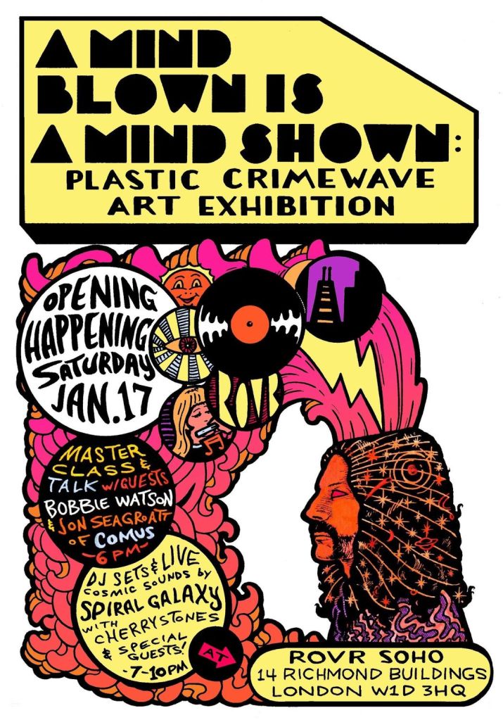 4: Plastic Crimewave, A Mind Blown Is A Mind Shown at ROVR SOHO – Opening Saturday 17th Jan 2026, 6pm until 11pm – An “exhibition and masterclass talk with Steven Krakow (aka Plastic Crimewave), with special guests Bobbie Watson and Jon Seagroatt of Comus and live cosmic sounds and DJ sets from Plastic Crime Wave, Spiral Galaxy, Cherry Stones, and special guest Gary The Tall”