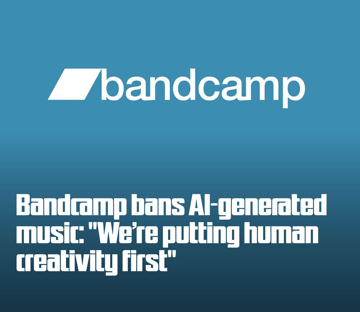 This bit of rather interesting news just in, or this just stolen bit of news: In a statement published yesterday, as just reported by Mixmag (nice graphics), Bandcamp, the music distribution service, have announced that it will be “fortifying its mission” around AI-generated music to “Keep Bandcamp Human.”