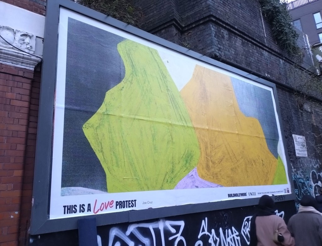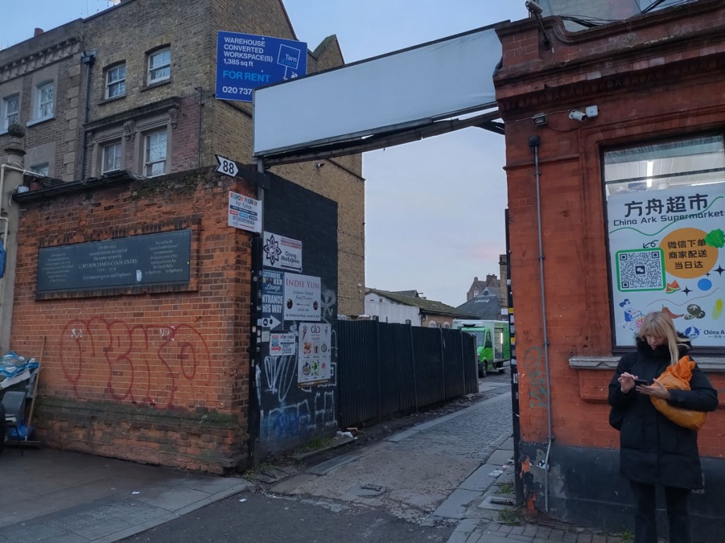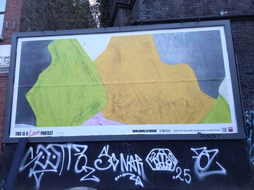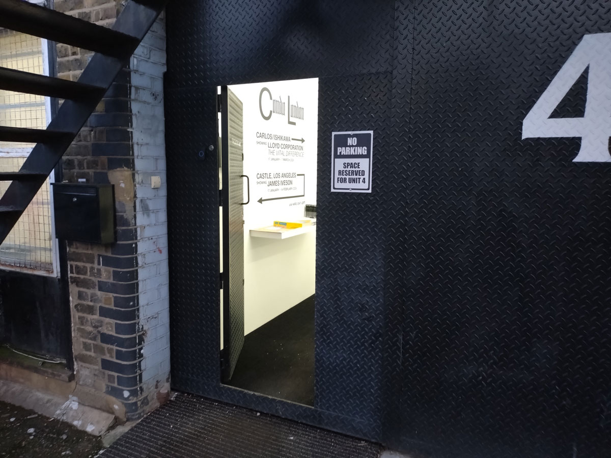 On we go once more, on past that Joe Cruz This is Love billboard from Build Hollywood – those Build Hollywood pieces really do need to stay on actual billboards like this one has and not impose themselves on the wild feral street art that doesn’t need the hand of a corporate advertising agency lording it like they have elsewhere in East London. Really not sure what I think or indeed what I want to think about Build Hollywood, do rather prefer it when the corporate street art stays on on those advertising billboards and doesn’t infringe of the real street art. We’re heading for the Mile End Road now and that yard behind the Chinese supermarket where Carlos/Ishikawa hide. Let’s hope they’re actually open this time, they didn’t bother for Frieze London’s East End Day even though they were loudly listed as being part of it on the Frieze website, annoyingly they weren’t open a couple of weeks later when their own website said they would be, haven’t bothered making the effort again until today. The gallery seems to have quite a few fingers in the Condo pie though, surely they’re not going to let us down again today? Carlos/Ishikawa are another of those galleries who don’t like to tell you where they are, no sign besides the “no parking” sign on the door, I thought No Parking was out in the wilds of Walthamstow or was it Leytonstone. It is getting rather cold and wet now, if we are to commit to walking up the Mile End Road they damn well better be open! They are.