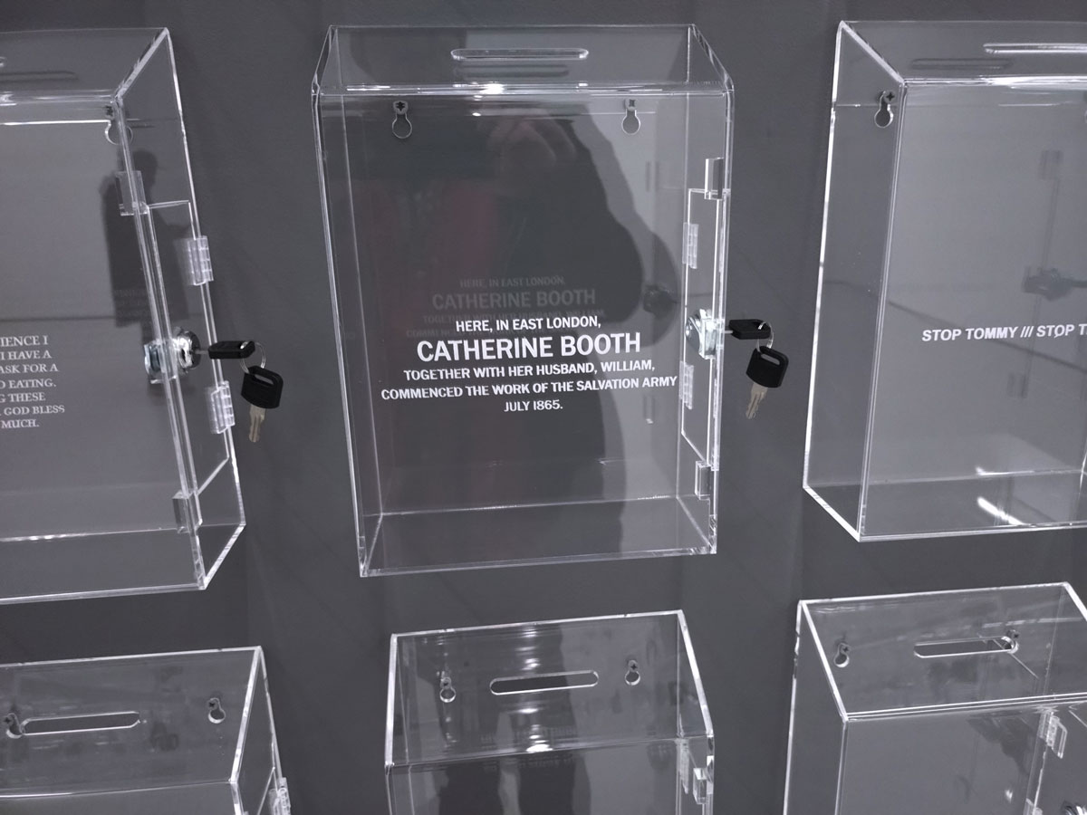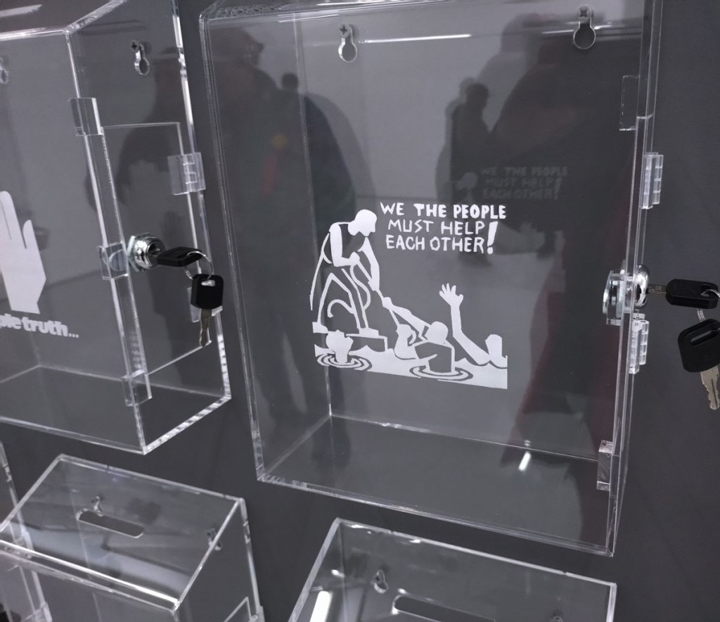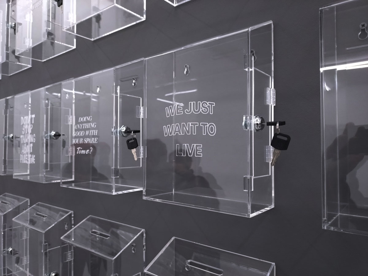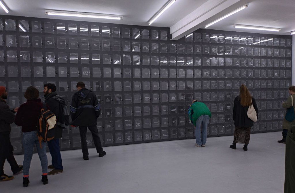 Lloyd Corporation are in the Carlos/Ishikawa main space with a giant piece of installation and a show calledVital Difference that certainly looks impressive as you walk in, as does the glossy black and white A6 booklet that comes with the exhibition. Lloyd Corporation is a collaborative project from artists Ali Eisa and Sebastian Lloyd Rees, an evolving collaboration that takes various forms of co-produced sculptural objects as well as a “less well-defined relationship between two individual practices – of assembling, reshaping, re-contextualising and translating each other’s ideas and forms. Typically manifesting in the format of site-specific installation, it also includes the production of short texts, sculpture, prints and appropriated objects” so we’re told. Here, rather intriguingly we find a wall of, well, see-through post boxes all with some kind of reference to something or someone who does make that vital difference on the front of each box, which in turn begs the question about any of this art making any kind of vital difference, especially if only those in the know and part of the small art bubble know the piece and indeed the gallery is actually here, a sign out of there on the Mile End Road might well make a vital difference don’t you think? Why does East London art appear to never want to actually engage with the people of the East End? The people not part of their cosy little (and it really is rather little) art bubble? Vital? Certainly different, certainly powerful, powerfully filling the big back wall of the big space like that. Although most people in here on this opening afternoon seem more interested in talking to each other than reading what’s on the boxes; there’s a rather over-loud conversation about the merits of the Oasis comeback (of all things) going on over there, while someone else it telling someone else (and everyone else within earshot) about his Christmas mishaps and no one seems that concerned that someone needs $400 by Friday or that someone wants their country back or that failure doesn’t sell. What is actually going on here? What is the art or indeed what is art itself asking of us as we walk in here? Why have we walked up the Mile End Road on a cold wet Saturday afternoon to see this? I mean I like it, I like that I have, then again it is rather annoying me almost as much as I am liking it and no one ever helped me when I wanted to be an astronaut (or for that matter an artist). Bit up itself isn’t it? But then isn’t everything dear, what is art anyway? What is the point?