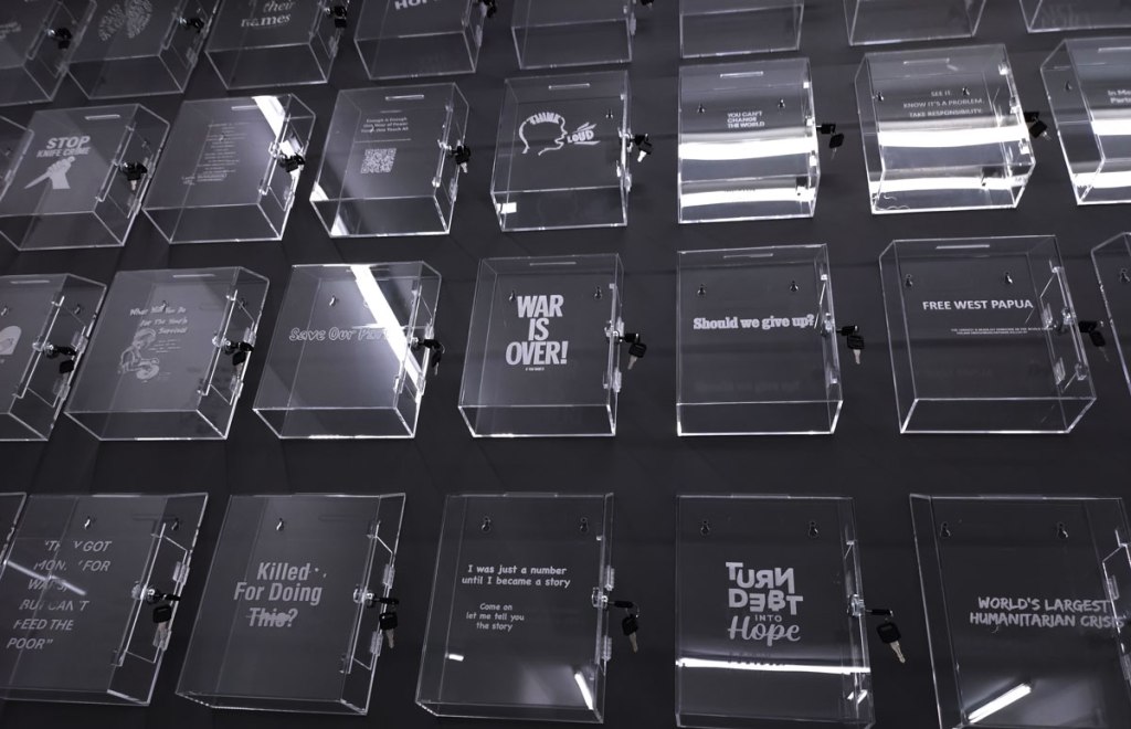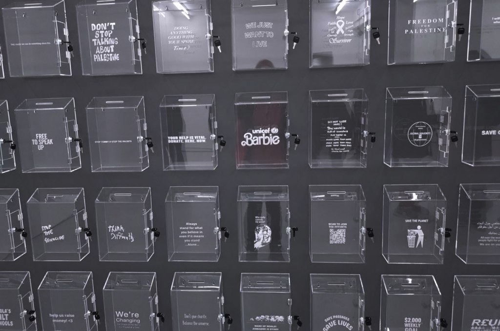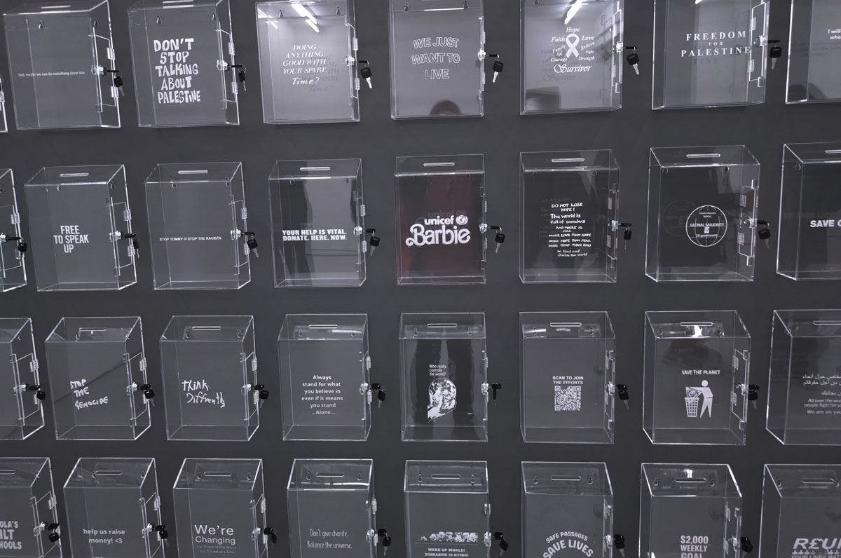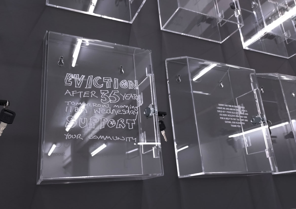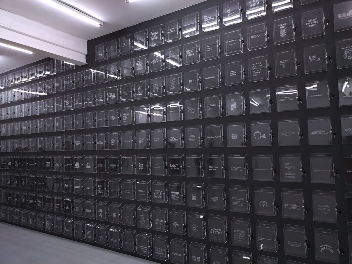 Lloyd Corporation are in the Carlos/Ishikawa main space with a giant piece of installation and a show calledVital Difference that certainly looks impressive as you walk in, as does the glossy black and white A6 booklet that comes with the exhibition. Lloyd Corporation is a collaborative project from artists Ali Eisa and Sebastian Lloyd Rees, an evolving collaboration that takes various forms of co-produced sculptural objects as well as a “less well-defined relationship between two individual practices – of assembling, reshaping, re-contextualising and translating each other’s ideas and forms. Typically manifesting in the format of site-specific installation, it also includes the production of short texts, sculpture, prints and appropriated objects” so we’re told. Here, rather intriguingly we find a wall of, well, see-through post boxes all with some kind of reference to something or someone who does make that vital difference on the front of each box, which in turn begs the question about any of this art making any kind of vital difference, especially if only those in the know and part of the small art bubble know the piece and indeed the gallery is actually here, a sign out of there on the Mile End Road might well make a vital difference don’t you think? Why does East London art appear to never want to actually engage with the people of the East End? The people not part of their cosy little (and it really is rather little) art bubble? Vital? Certainly different, certainly powerful, powerfully filling the big back wall of the big space like that. Although most people in here on this opening afternoon seem more interested in talking to each other than reading what’s on the boxes; there’s a rather over-loud conversation about the merits of the Oasis comeback (of all things) going on over there, while someone else it telling someone else (and everyone else within earshot) about his Christmas mishaps and no one seems that concerned that someone needs $400 by Friday or that someone wants their country back or that failure doesn’t sell. What is actually going on here? What is the art or indeed what is art itself asking of us as we walk in here? Why have we walked up the Mile End Road on a cold wet Saturday afternoon to see this? I mean I like it, I like that I have, then again it is rather annoying me almost as much as I am liking it and no one ever helped me when I wanted to be an astronaut (or for that matter an artist). Bit up itself isn’t it? But then isn’t everything dear, what is art anyway? What is the point?
