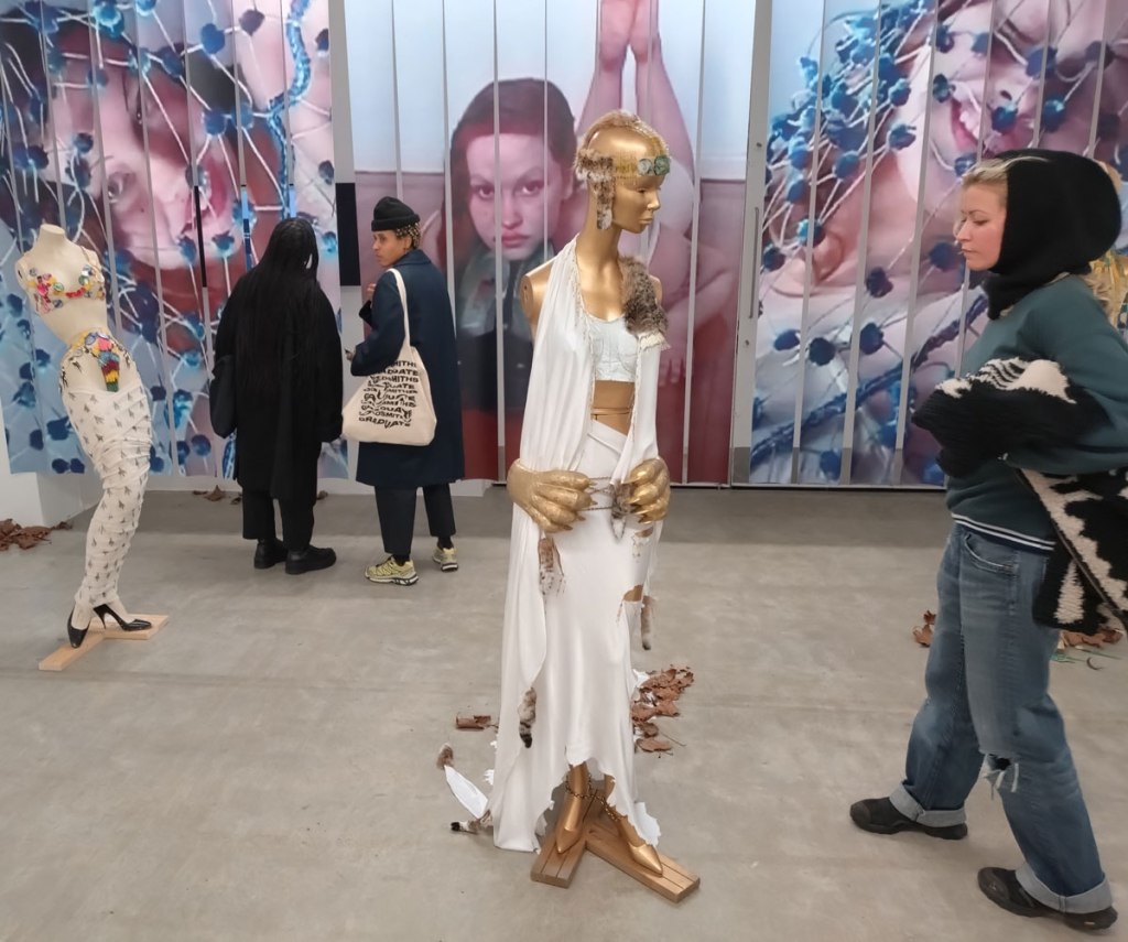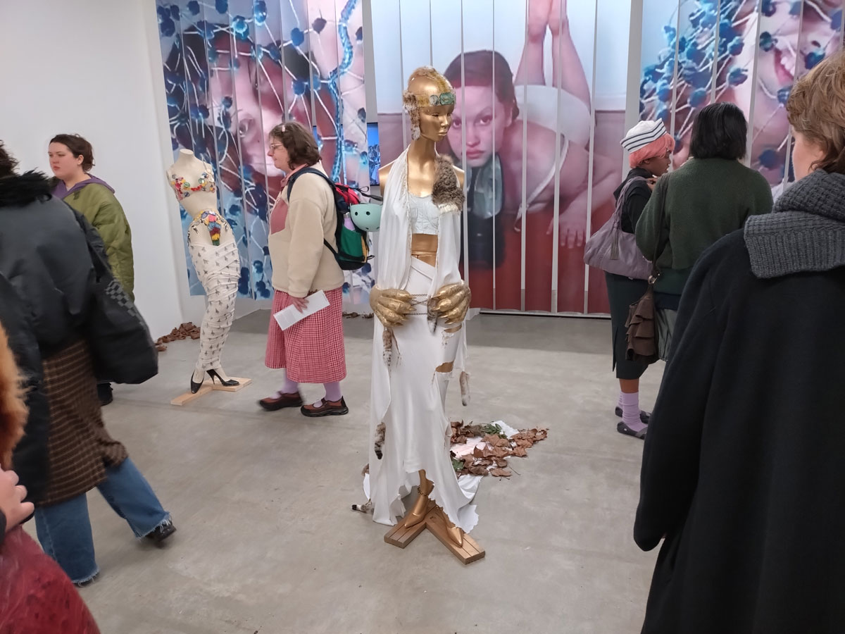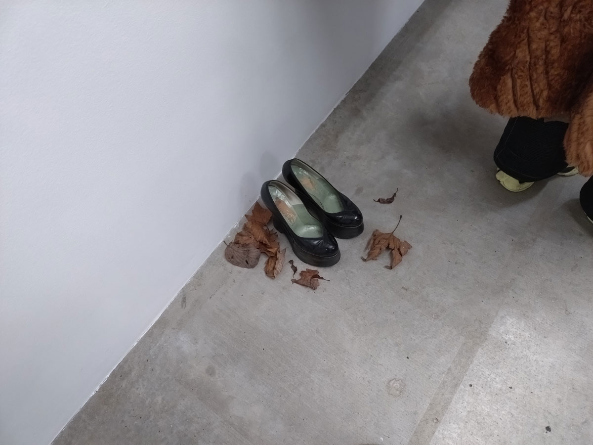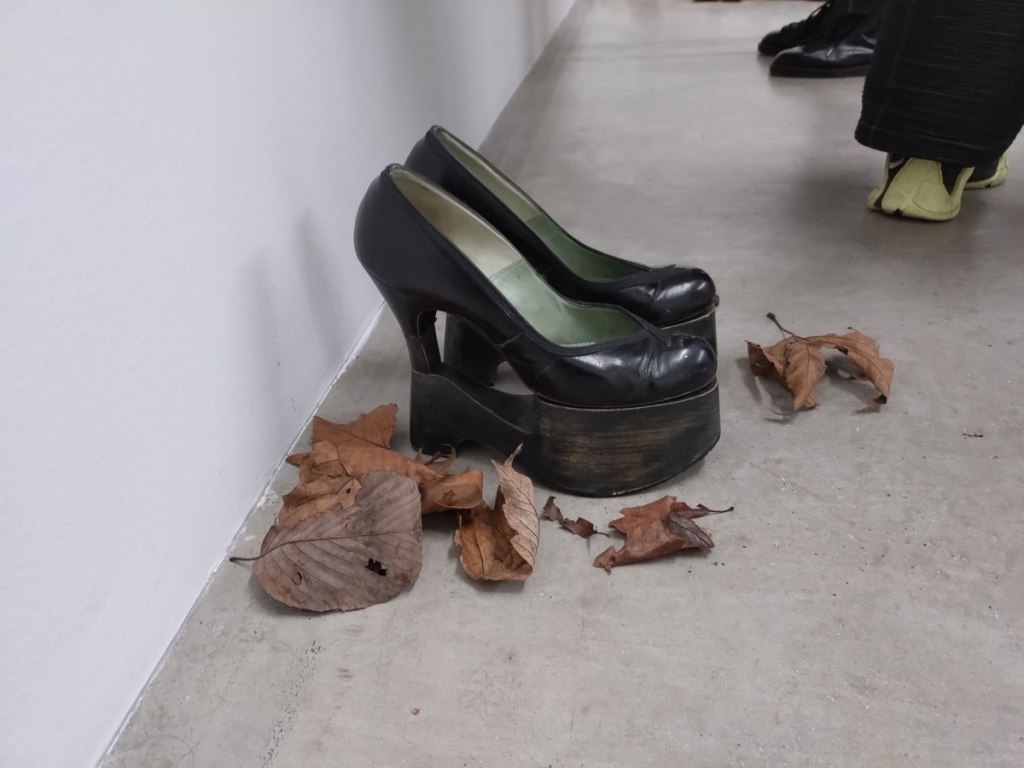 We left Part One, halfway through exploring the gallery known as Soft Opening, we were about to make that very short walk from that rather rewarding Sam Lipp exhibition to the smaller second hardly-ever-used room in the East London space just off the Hackney Road. For Condo 2026, and if you don’t know what Condo 2026 is maybe read Part One of this feature first – Condo 2026 Pt.1 – Exploring East London’s part in Condo, that and Sam Lipp at Soft Opening, Hana Miletić at The Approach alongside New York’s Margot Samel Gallery presenting the work of Leroy Johnson and Olivia Jia… – for Condo 2026 Soft Opening is hosting New York’s Company Gallery and their presentation of Needle Trades, the first solo exhibition in London by Women’s History Museum. The entry is guarded intriguingly or maybe enticingly by a pair of high heel shoes sitting quietly in a small pile of Autumn leaves on the gallery floor. Apparently the slightly strangely named artist duo came together in 2015; two artists, Mattie Barringer and Amanda McGowan, a self declared fashion-art duo who came together out of “the desire to create novel and previously unseen images of beauty”. Not sure if we’re seeing anything previously unseen or indeed that novel, it is rather intriguing though, it does make for an instant sugar hit in terms of the eye candy and the art rush although what’s left once the hit wares off I’m not really sure?