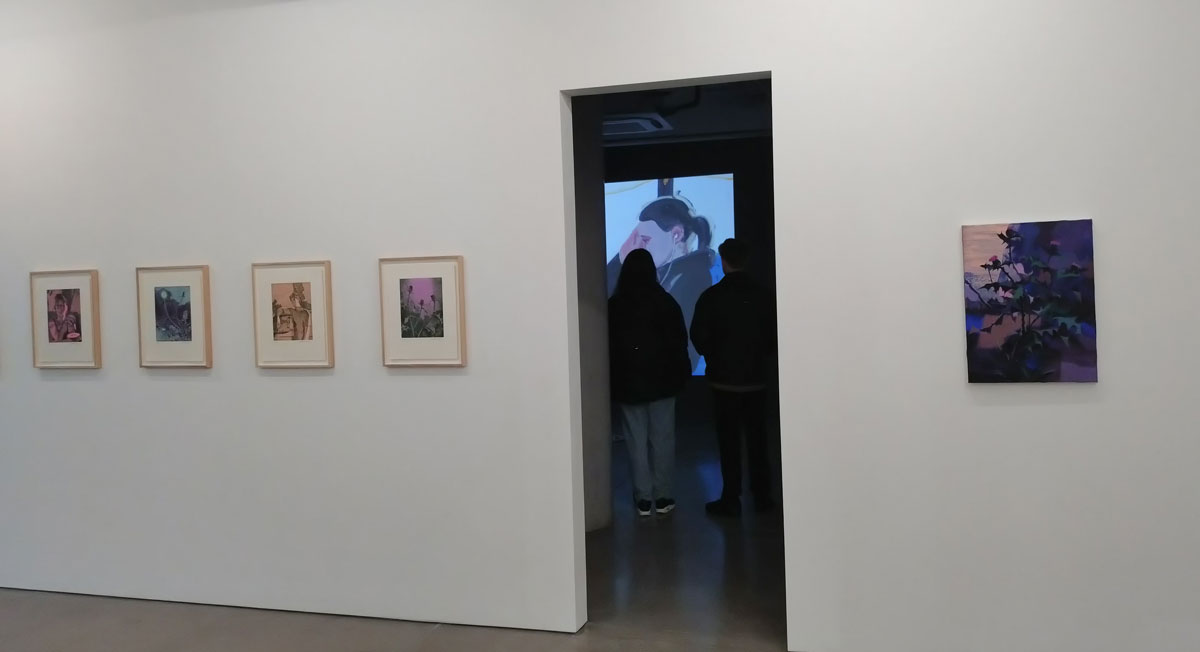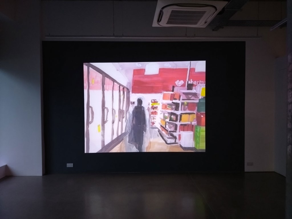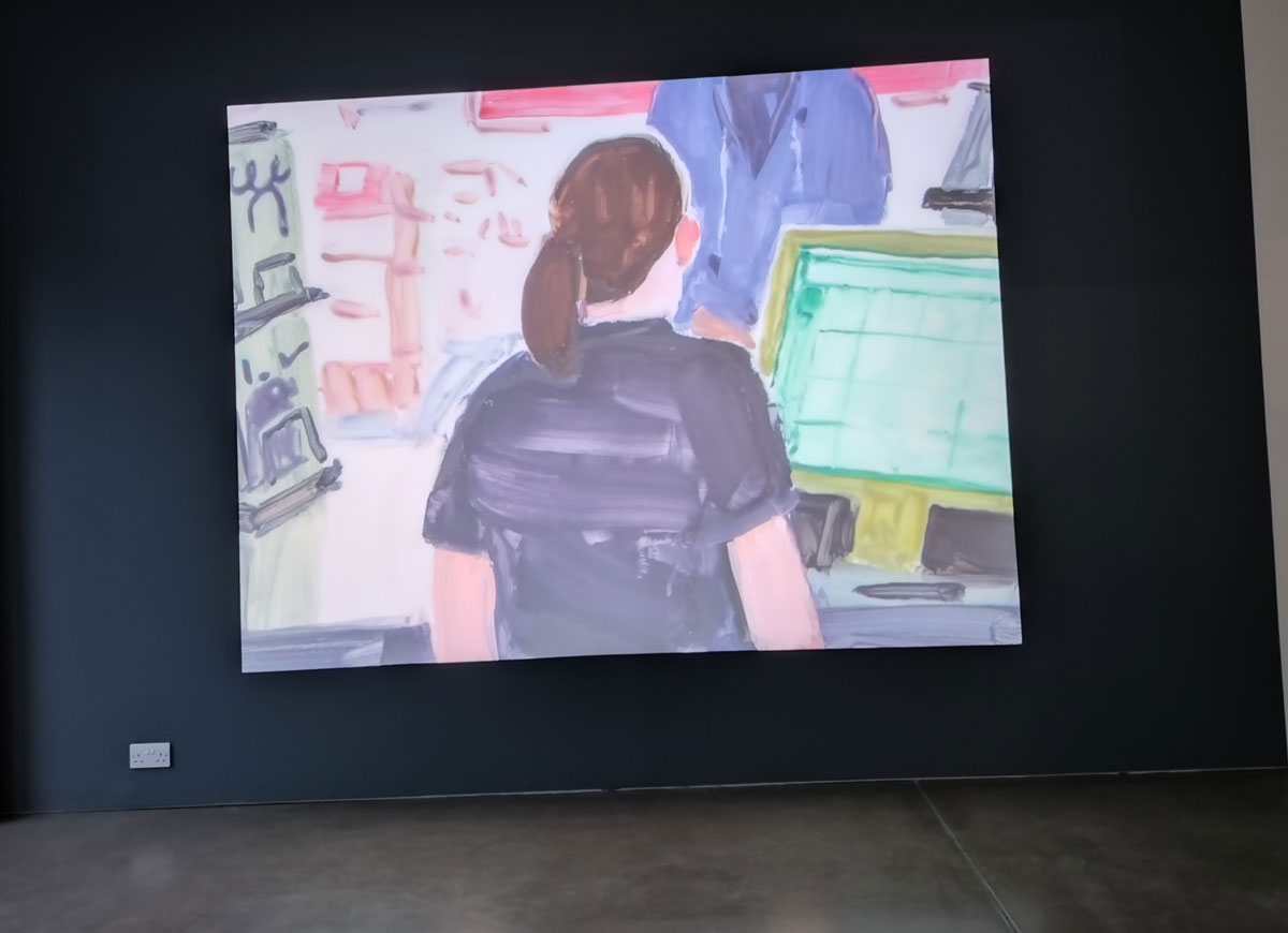 This time the centre point of this latest rather engaging Matt Bollinger exhibition is a rather fine hand-painted piece of animation, a piece that took the artist the best part of four years to complete so we’re told. Hand painted frames, not sure if he’s gone for the full-on old school proper twenty-four frames per second? It is an impressive piece; “In Bollinger’s novelistic reality there are sufficient plot variations, randomly sequenced to the projector, so that the viewer should never experience a repeat narrative. Dawn, an ordinary young American woman, has been sleeping in her car for some time. In an attempt to carry on life as normally as possible under pressing circumstances, she has not told anyone, but wakes, and intends to head to work at an ubiquitous CVS pharmacy, sometimes she makes it, in various different ways, and sometimes she does not. Projected at scale (also viewable from the street) – in a manner whereby time seems to suspend in a CVS store, the unending tale is suspended in a sociological quagmire that not only speaks to and of middle-America, but a hypothetical, middle-everywhere. In a changing world of hard realities, Bollinger’s tone is never caustic, sardonic or judgemental, yet tender, thoughtful and sensitive to the mirrored realities of the fiction he draws, paints, animates…”
