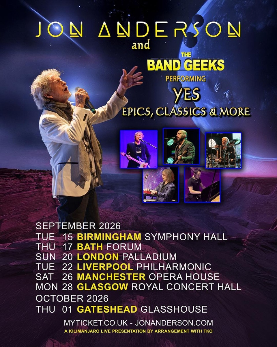“The celebrated tour of Jon Anderson and The Band Geeks is to come to the UK this September and October. Met with great gusto throughout their tours of the US, this unique combination of one of the most recognisable vocals in music, with the house band of a podcast will be playing YES epics, classics and more”.