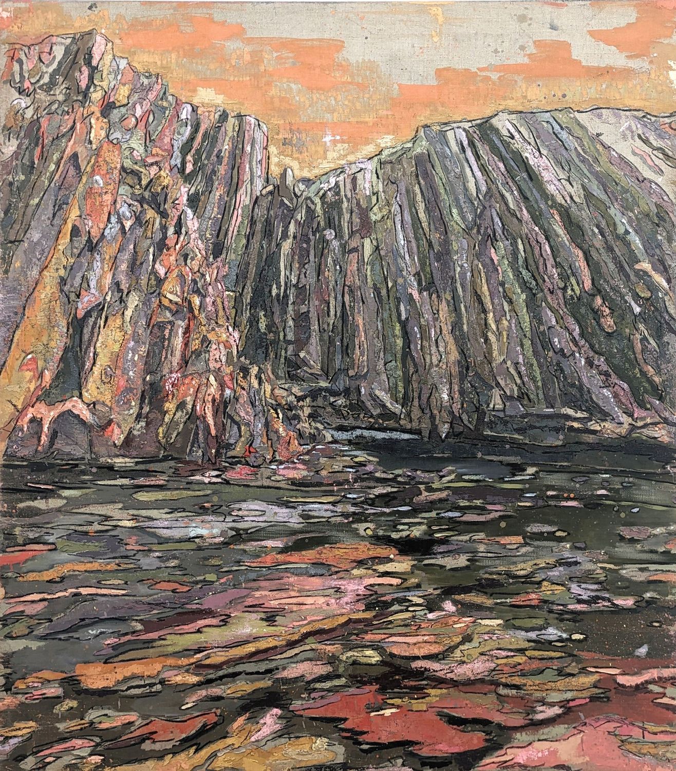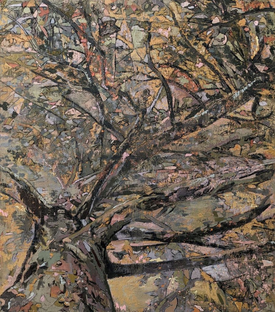 The physical nature of paint is just as important as what is being described. Ben’s works emerge from layers of impasto built up and worked back like geological strata. This lends the paintings considerable weight and substance. Graphic hard-edge marks echo the rocks and branches they describe; colour patches float and combine like camouflage, partly hiding, partly revealing their subject. Reading the mark making becomes a matter of delving into layers of paint that are packed tight like muscle, to be pried apart in order to reveal the hidden histories within. It is lush, physical, meaty painting, appropriate to its subject”.