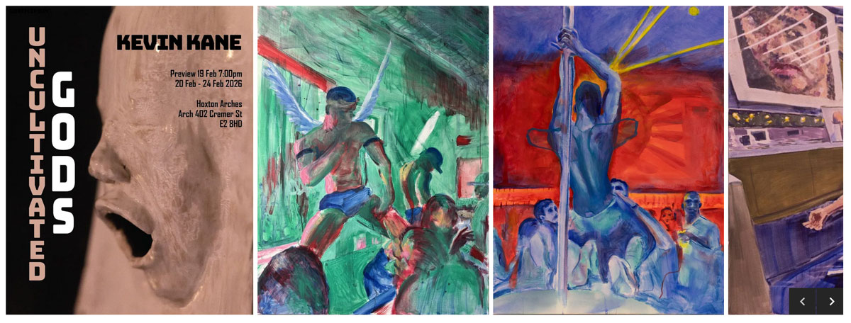 3: Kevin Kane, Uncultivated Gods at Stomach – 20th Feb until 24th Feb 2026 with an opening on Thursday 19th Feb, 7pm until 10pm – “Uncultivated Gods is an exhibition by Kevin Kane exploring modern forms of worship through painting, sculpture, installation and performance, examining power, devotion and belief in contemporary life”.