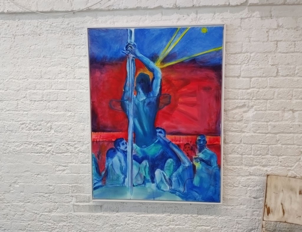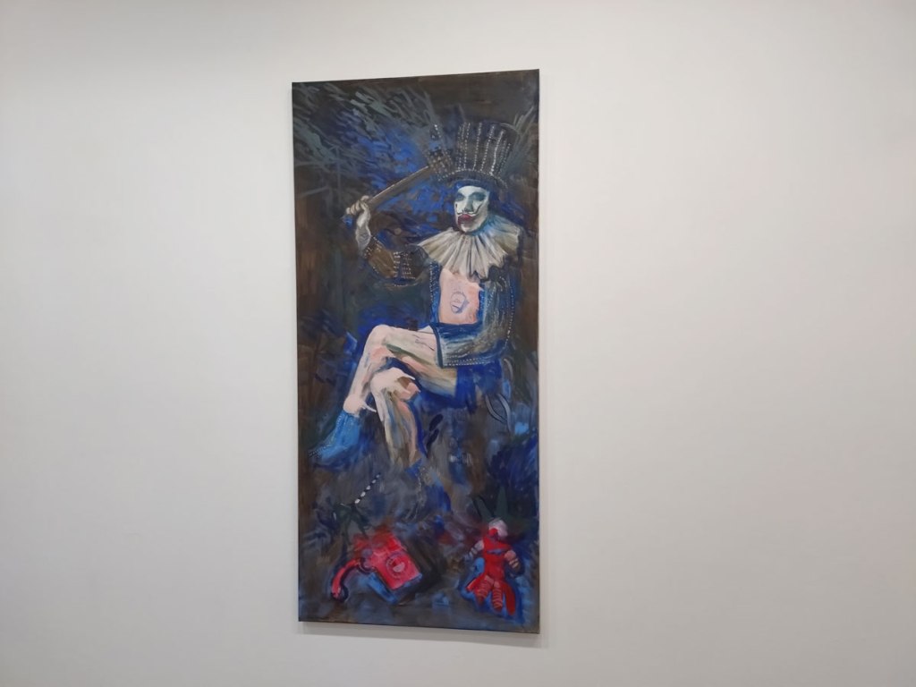 The exhibition presents a series of paintings, sculpture, installation and performance that approach worship not as a fixed belief, but as a psychological and social condition. it is the paintings that are taking the eye is here, my painterly bias for which I don’t apologise. The work explores power, visibility, identity, aspiration and control so we are told, there are many ways to read it all, to read each piece or the body of work as a whole. The altar at which to pay homage to the world of celebrity, power I guess was more to do with the opening night and the performance, and where the natural world can be transgressed. the three metre-high inflatable sculpture is un-inflated, that afternoon after the night before feeling I was talking about (a very tall creature in black boots does offer to inflate things as she asks if I have any questions).