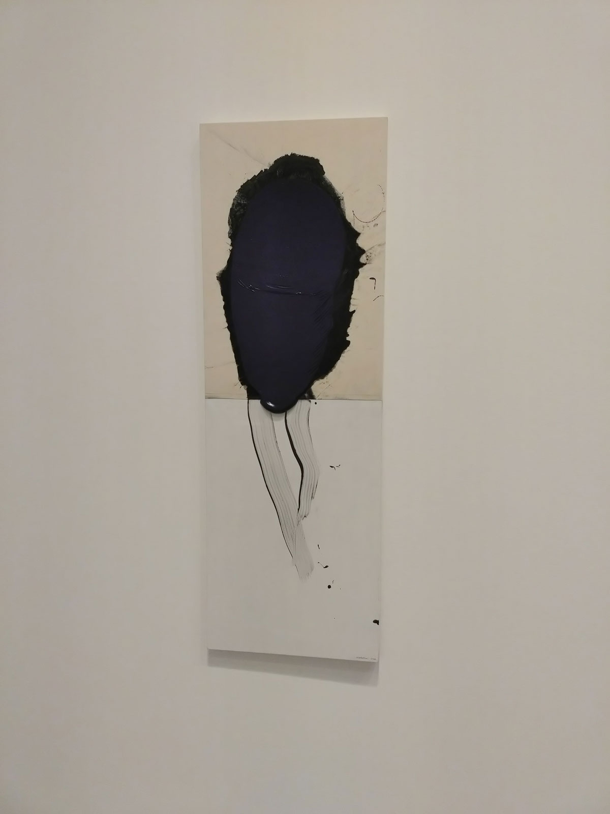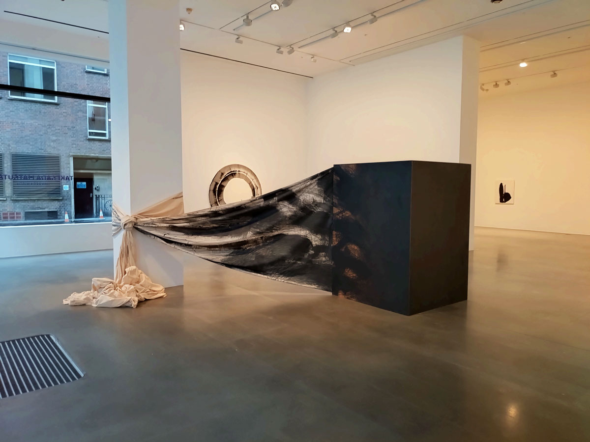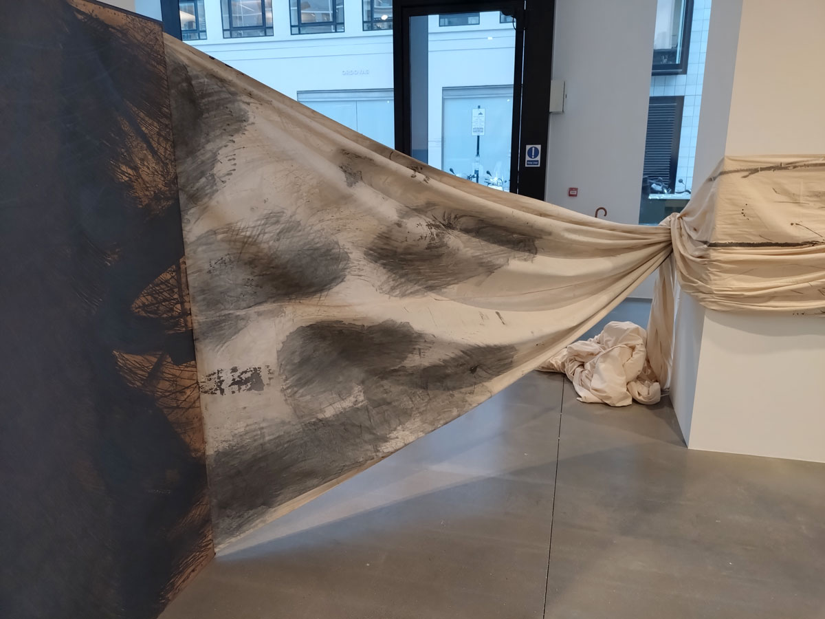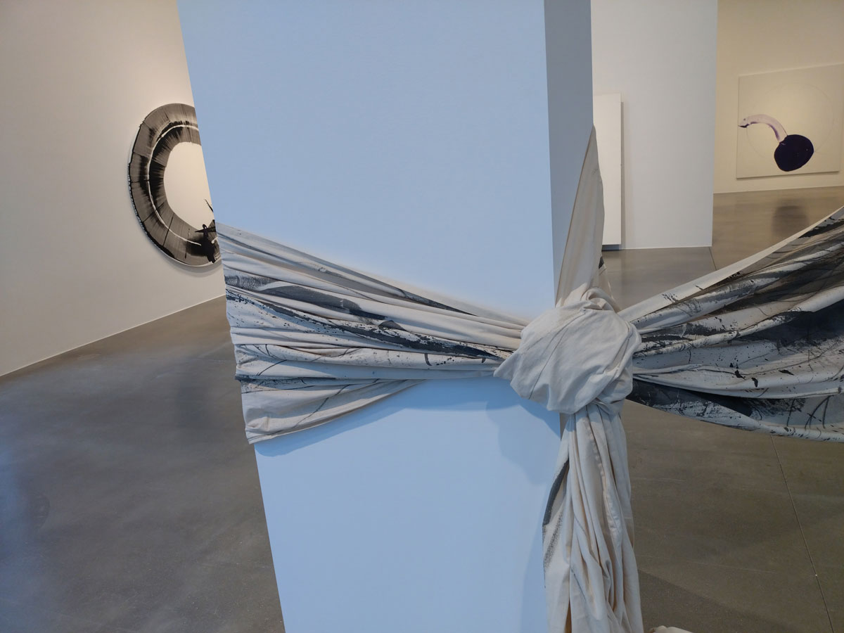 The Ōsaka-born artist Takesada Matsutani has taken over one of the two almost adjacent Savile Row Hauser and Wirth Gallery spaces for his first exhibition in London for over a decade, a show coinciding with his 60th year of living and working in Paris and something to do with his concern with the reshaping of matter, namely his signature materials of vinyl glue and graphite. The material used isn’t immediately obvious, you are, unless you know already, looking at the shapes, the textures, the way the fabric or the paper is wrapped around the walls, although once you do figure it out and start to focus on what has been used to make the marks, the shapes, the textures, it does rather add to the conversations in the two white rooms of the big space. The conversations the pieces have with each other, with the viewer, the unspoken conversations between viewers slowly walking around, there maybe only three or four of us in here on a cold grey Friday afternoon in Mid February but there are nods and knowing silence as we stand there in the quiet of the room taking in the way the pieces wrap around the walls and especially the concrete support in the middle of the room, without being forceful, there’s something very powerful about the work in here, about being in here with the work.
