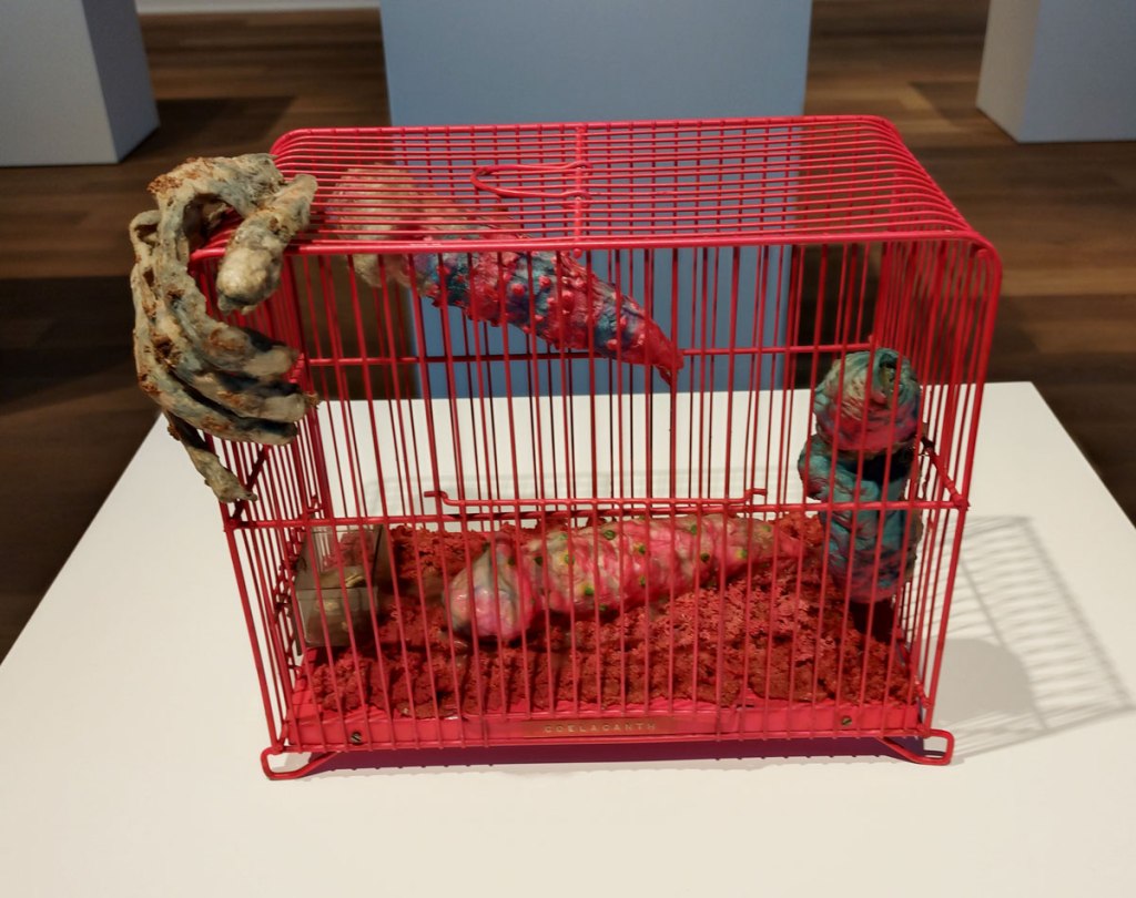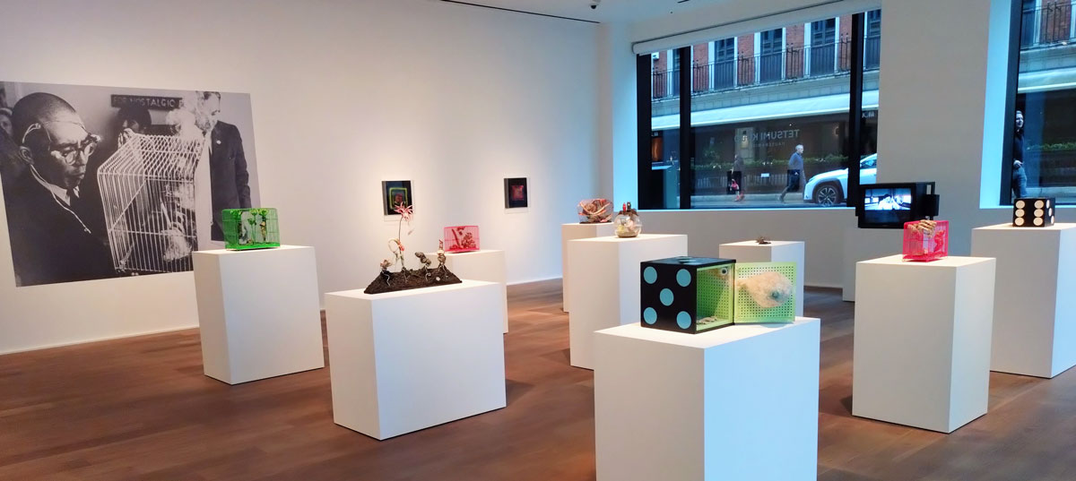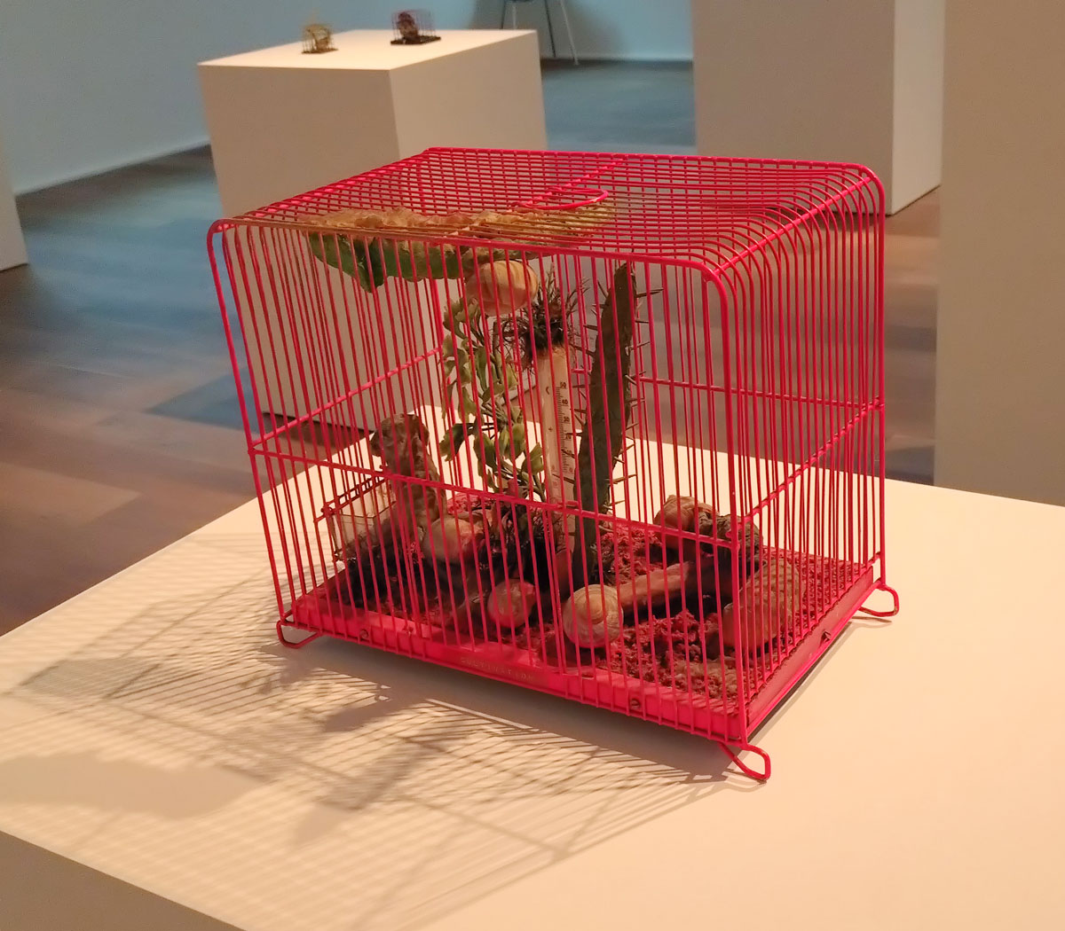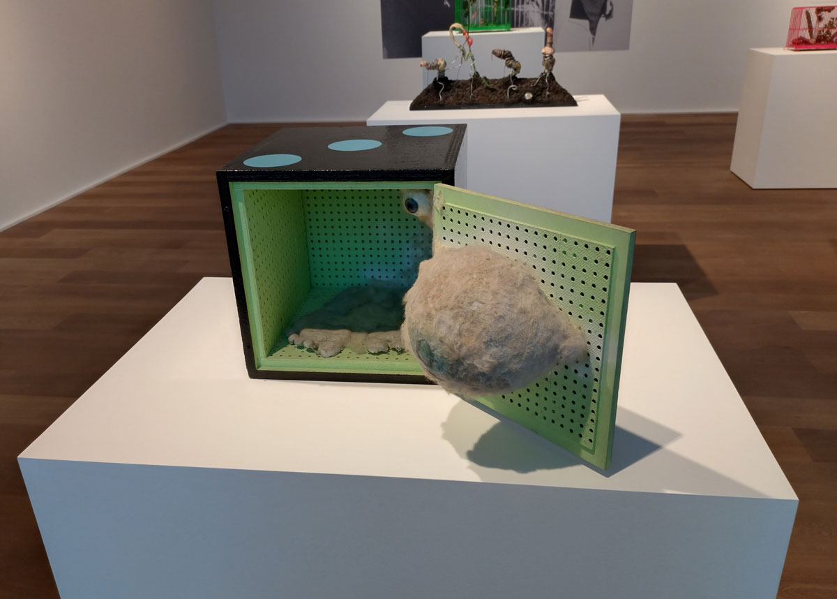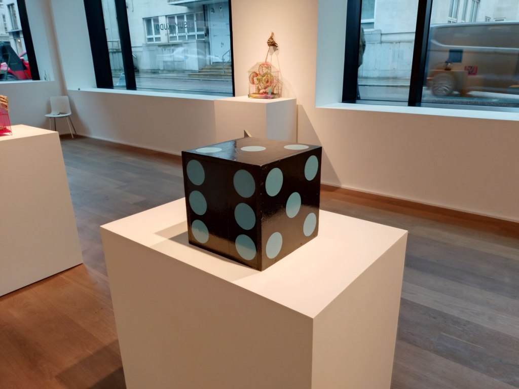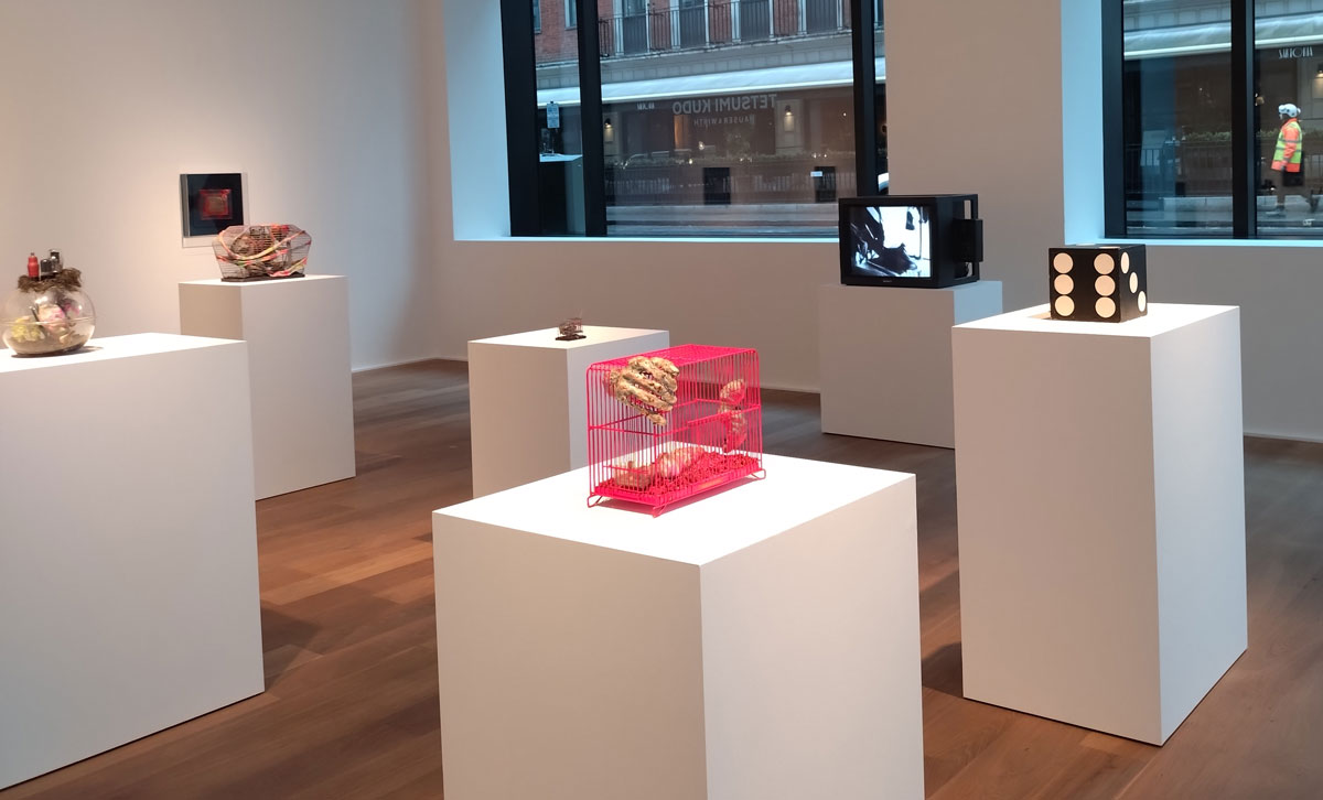 And here in this room full of on these regimented plinths and the noise of the films running in the space alongside the noise of the pinks and the greens of those busy bird cages and before we get to what might be in them or inside that dice over there and what is going on in that film and…