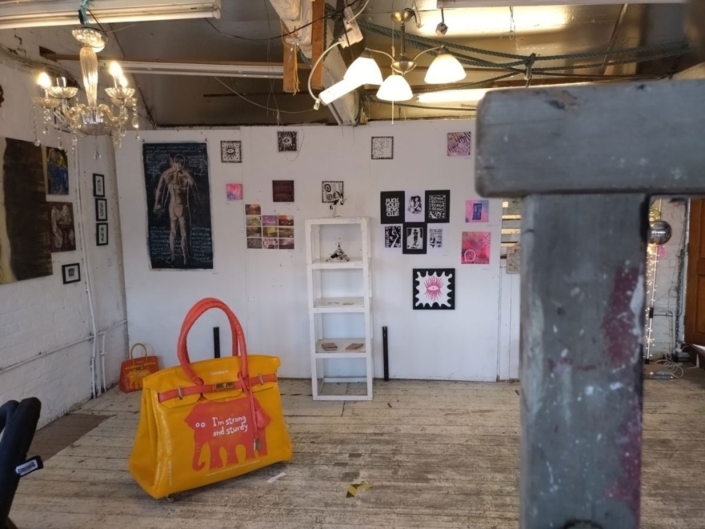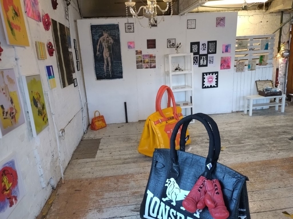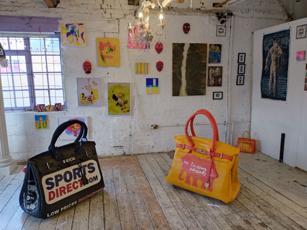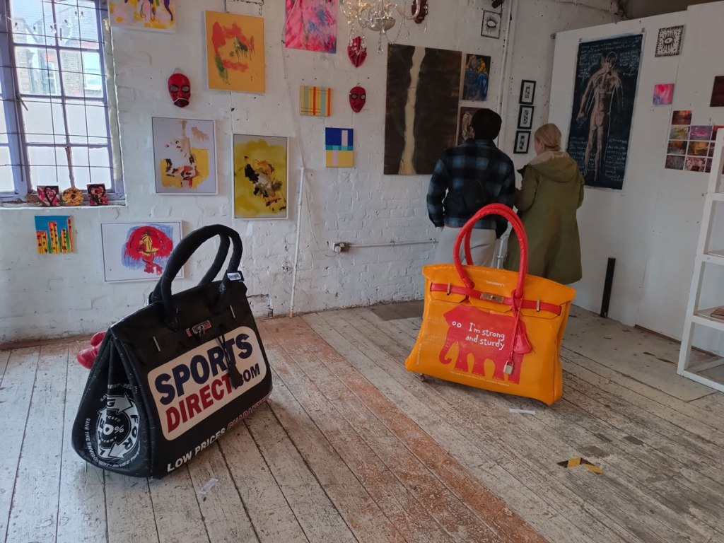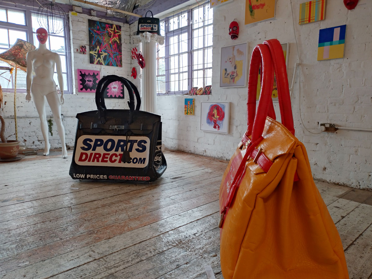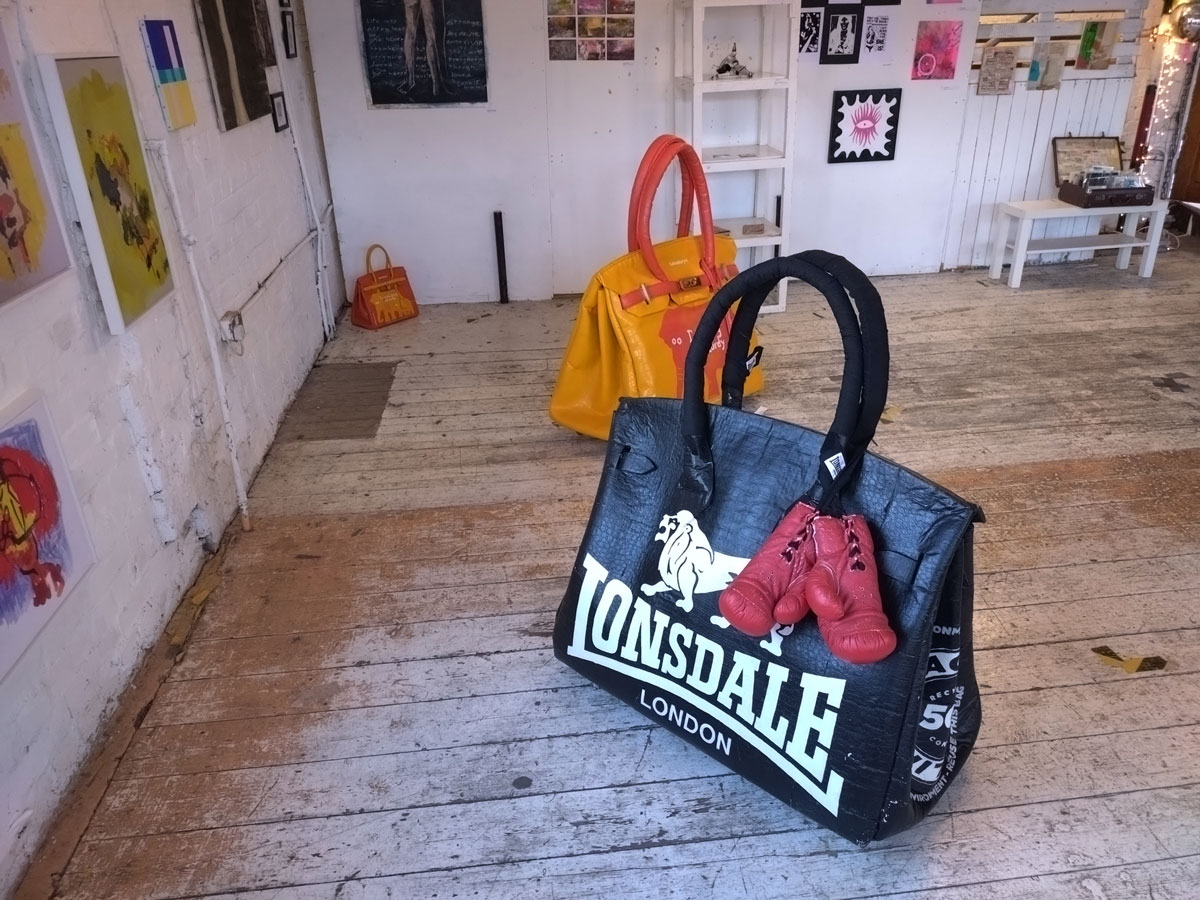 There’s a couple of shelves with two new Mia Jane Harris pieces, more of her manipulation of those found china figures that only she can find and that are always rather intriguing; that (slightly) gothy slant that come with a hint of a fetish flavoured undertone that her work always comes with. And what can we say about those big bags of Vinay Hathi‘s? Those big pop art pieces. They have figured in Cultivate shows before, I think we first showed one of his giant bags in a show something like ten years ago (that big office building just off Hackney Road we took over for a weekend in 2015). Those two bags were always going to loudly fit in with this group show in this particular space with this cross section of art and artists. In our heads this was always going to be a busy show, there was always going to be a lot of noise on the walls, lots of demands for attention and the thing about putting an exhibition like this together is you kind of have to know who is going to come in, to know what’s going to engage with the audience over the weekend. We have done shows in this space before, every time you do something in a space you learn about it, you learn about the people, the audience who come, we do not want to put on shows and that are just about the art crowd and the gang of artists who turn up at each other’s shows on the opening night – that is not what Cultivate is about, that is what we see so often at London shows these days, shows that all about the open night and a gang of London art students (or recent art students) happily showing their art to each other and seemingly not wanting to reach beyond their cosy bubble. Surely art needs to engage a little more than that? Vinay Hathi‘s bags certainly engage with people, he does like to encourage people to pick them up, to take photos with them, walk around them, we wanted that to happen in this show, we wanted people to relax and talk to us on the Saturday and Sunday, those bad were the bridge, well they were more than just the bridge but they were a positive ice breaker. The bags or pieces, the two big ones don’t function as bags (the two small ones do) are made out of found recycled material, they play with the notions of waste, of high end fashion bags and Prada and a world of waste and they are proper pieces of Pop Art, they are certainly talking points and I do rather like how once the ice was broken, conversations flowed in terms of the other art in the room all weekend, I enjoyed sitting in the space and engaging with people (or leaving them to engage with the art, personally I hate been talked to at an art exhibition, if I need to ask then I will but please don’t start talking to me, let the art do that itself.)