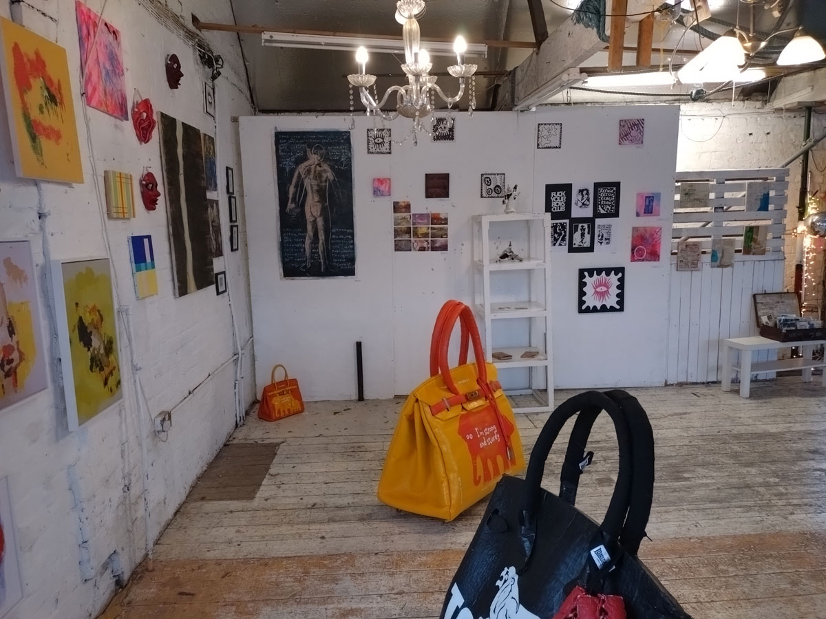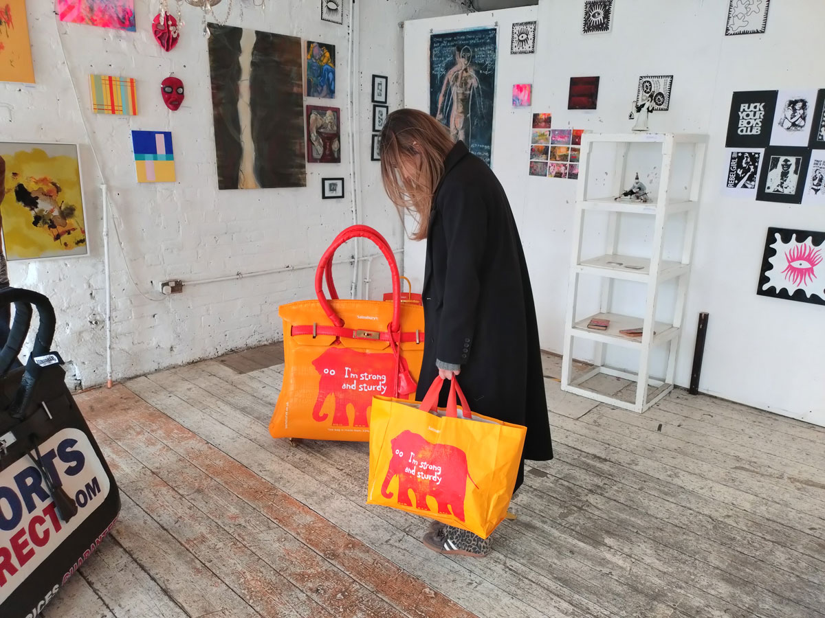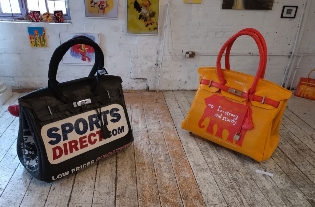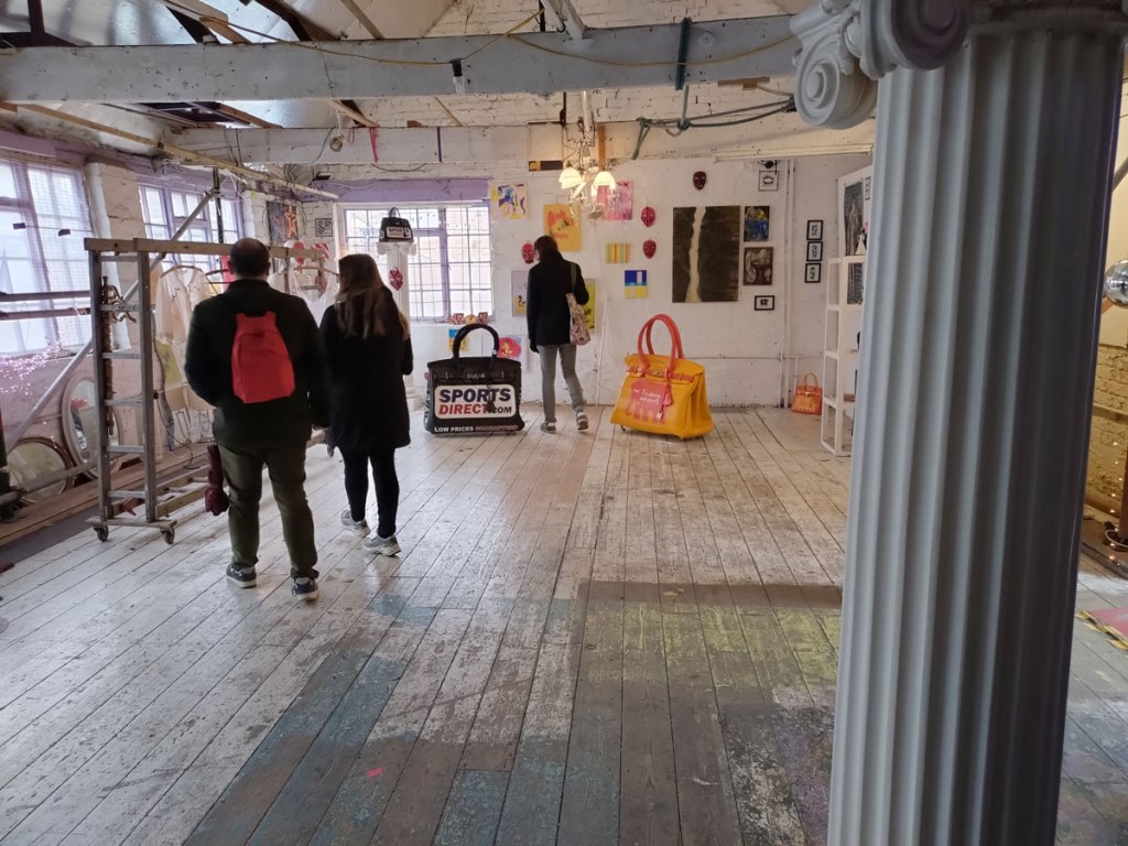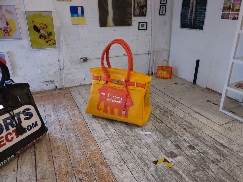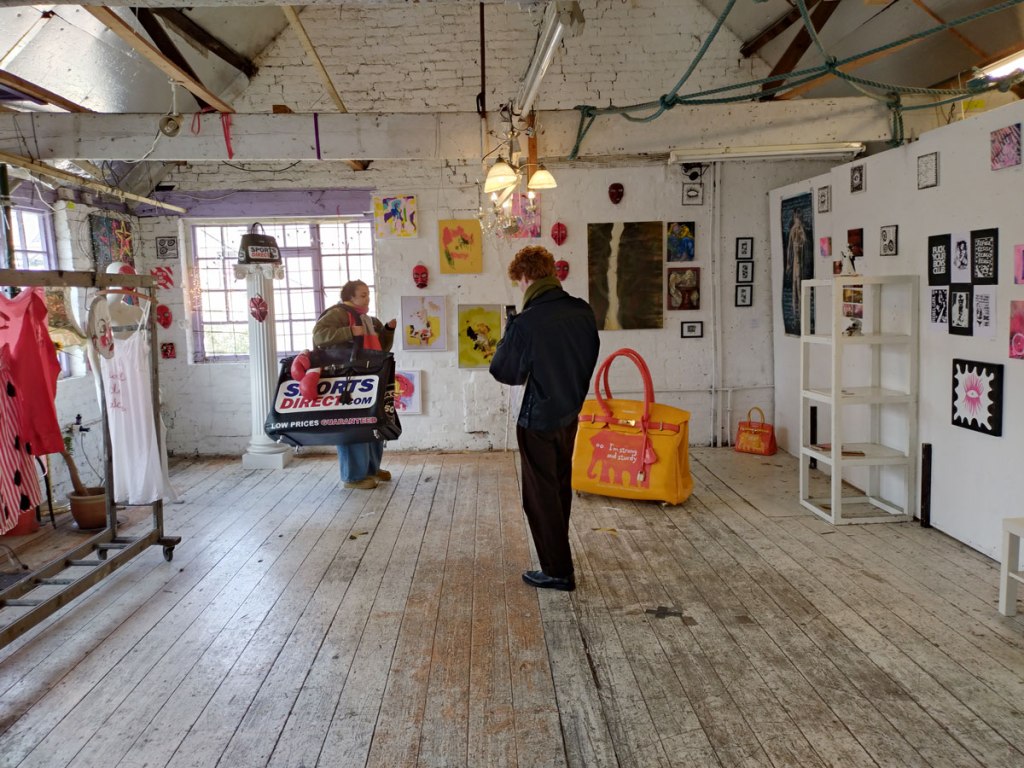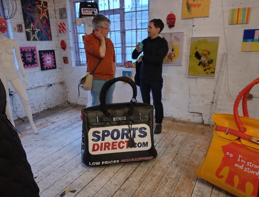 There’s a couple of shelves with two new Mia Jane Harris pieces, more of her manipulation of those found china figures that only she can find and that are always rather intriguing; that (slightly) gothy slant that come with a hint of a fetish flavoured undertone that her work always comes with. And what can we say about those big bags of Vinay Hathi‘s? Those big pop art pieces. They have figured in Cultivate shows before, I think we first showed one of his giant bags in a show something like ten years ago (that big office building just off Hackney Road we took over for a weekend in 2015). Those two bags were always going to loudly fit in with this group show in this particular space with this cross section of art and artists. In our heads this was always going to be a busy show, there was always going to be a lot of noise on the walls, lots of demands for attention and the thing about putting an exhibition like this together is you kind of have to know who is going to come in, to know what’s going to engage with the audience over the weekend. We have done shows in this space before, every time you do something in a space you learn about it, you learn about the people, the audience who come, we do not want to put on shows and that are just about the art crowd and the gang of artists who turn up at each other’s shows on the opening night – that is not what Cultivate is about, that is what we see so often at London shows these days, shows that all about the open night and a gang of London art students (or recent art students) happily showing their art to each other and seemingly not wanting to reach beyond their cosy bubble. Surely art needs to engage a little more than that? Vinay Hathi‘s bags certainly engage with people, he does like to encourage people to pick them up, to take photos with them, walk around them, we wanted that to happen in this show, we wanted people to relax and talk to us on the Saturday and Sunday, those bad were the bridge, well they were more than just the bridge but they were a positive ice breaker. The bags or pieces, the two big ones don’t function as bags (the two small ones do) are made out of found recycled material, they play with the notions of waste, of high end fashion bags and Prada and a world of waste and they are proper pieces of Pop Art, they are certainly talking points and I do rather like how once the ice was broken, conversations flowed in terms of the other art in the room all weekend, I enjoyed sitting in the space and engaging with people (or leaving them to engage with the art, personally I hate been talked to at an art exhibition, if I need to ask then I will but please don’t start talking to me, let the art do that itself.)