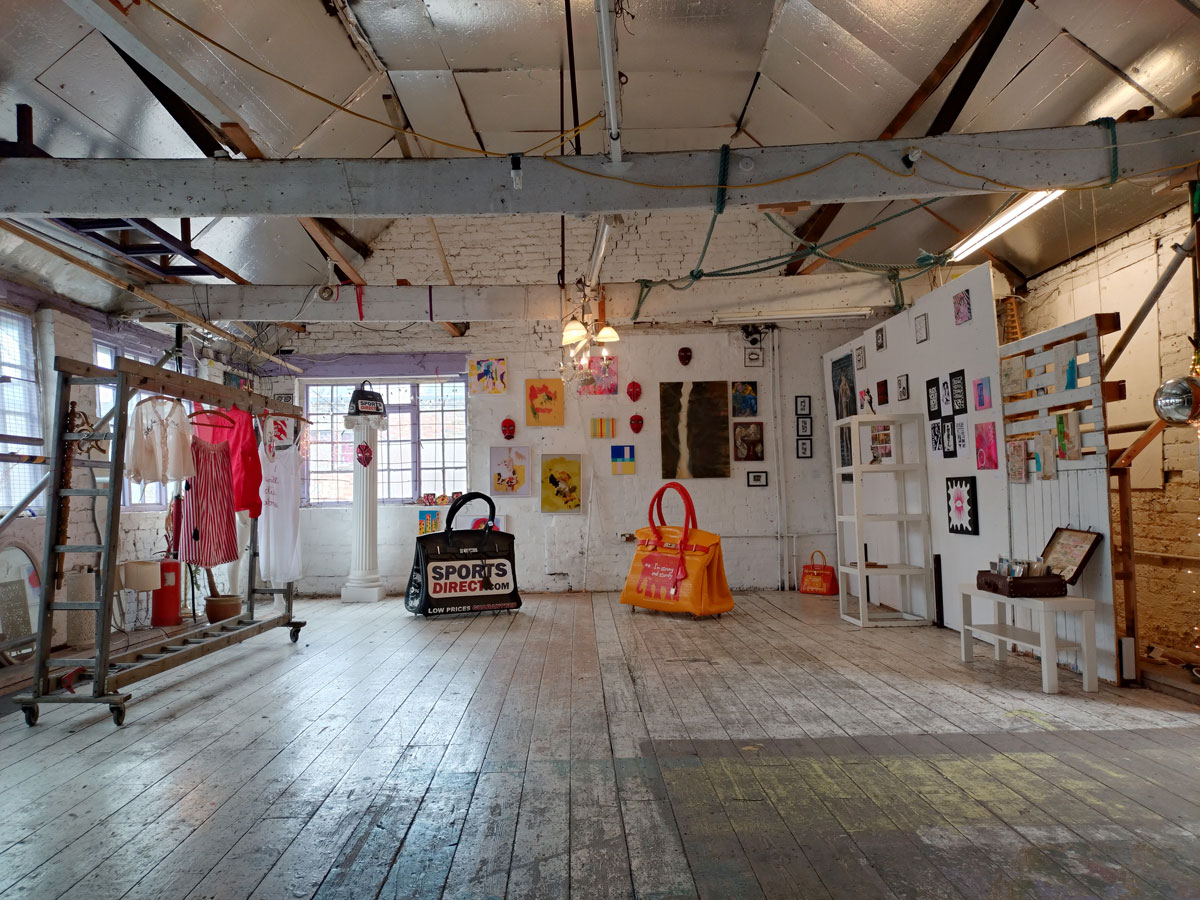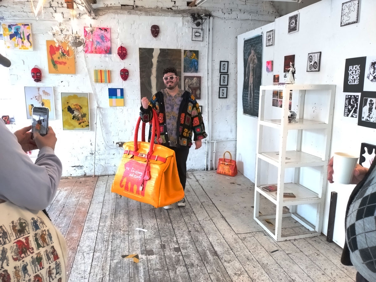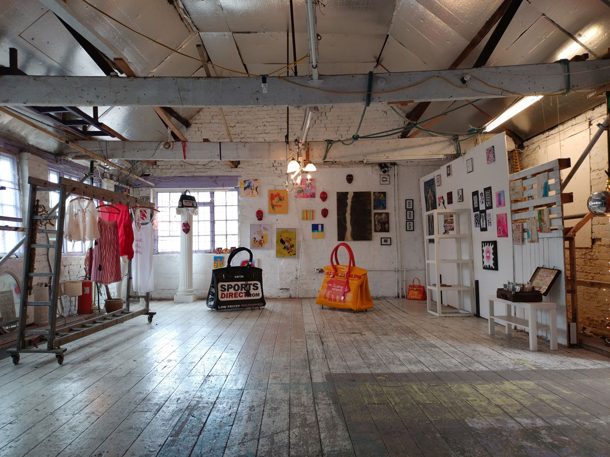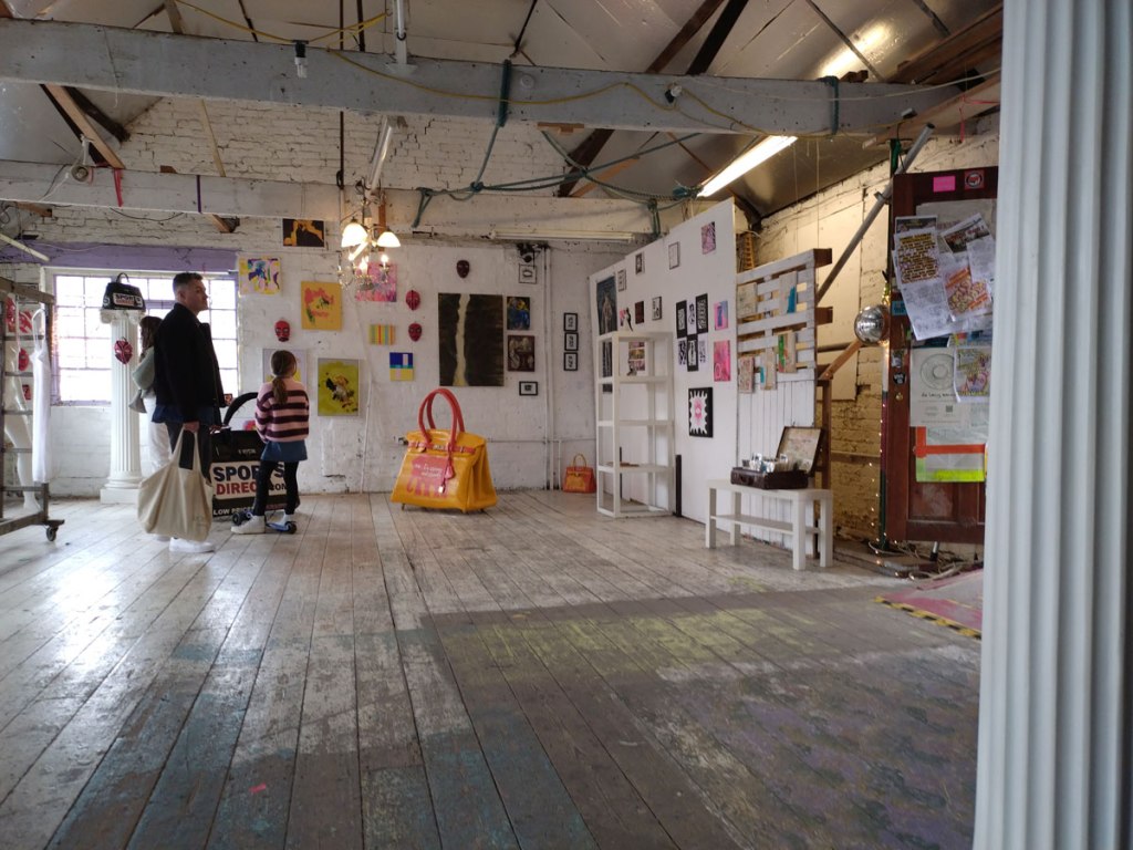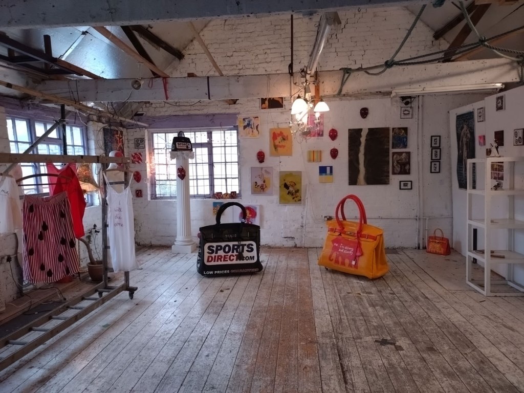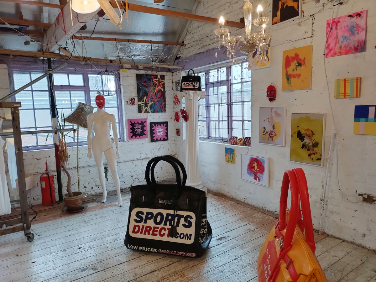 There’s a couple of shelves with two new Mia Jane Harris pieces, more of her manipulation of those found china figures that only she can find and that are always rather intriguing; that (slightly) gothy slant that come with a hint of a fetish flavoured undertone that her work always comes with. And what can we say about those big bags of Vinay Hathi‘s? Those big pop art pieces. They have figured in Cultivate shows before, I think we first showed one of his giant bags in a show something like ten years ago (that big office building just off Hackney Road we took over for a weekend in 2015). Those two bags were always going to loudly fit in with this group show in this particular space with this cross section of art and artists. In our heads this was always going to be a busy show, there was always going to be a lot of noise on the walls, lots of demands for attention and the thing about putting an exhibition like this together is you kind of have to know who is going to come in, to know what’s going to engage with the audience over the weekend. We have done shows in this space before, every time you do something in a space you learn about it, you learn about the people, the audience who come, we do not want to put on shows and that are just about the art crowd and the gang of artists who turn up at each other’s shows on the opening night – that is not what Cultivate is about, that is what we see so often at London shows these days, shows that all about the open night and a gang of London art students (or recent art students) happily showing their art to each other and seemingly not wanting to reach beyond their cosy bubble. Surely art needs to engage a little more than that? Vinay Hathi‘s bags certainly engage with people, he does like to encourage people to pick them up, to take photos with them, walk around them, we wanted that to happen in this show, we wanted people to relax and talk to us on the Saturday and Sunday, those bad were the bridge, well they were more than just the bridge but they were a positive ice breaker. The bags or pieces, the two big ones don’t function as bags (the two small ones do) are made out of found recycled material, they play with the notions of waste, of high end fashion bags and Prada and a world of waste and they are proper pieces of Pop Art, they are certainly talking points and I do rather like how once the ice was broken, conversations flowed in terms of the other art in the room all weekend, I enjoyed sitting in the space and engaging with people (or leaving them to engage with the art, personally I hate been talked to at an art exhibition, if I need to ask then I will but please don’t start talking to me, let the art do that itself.)