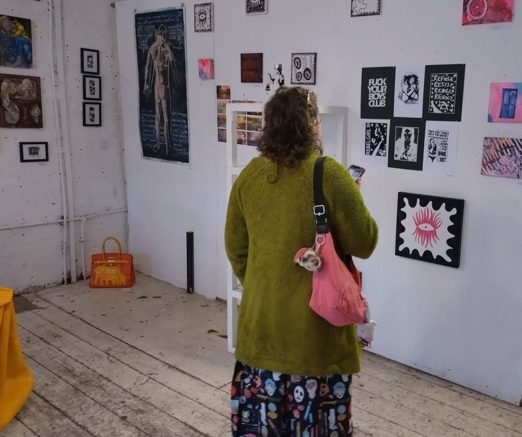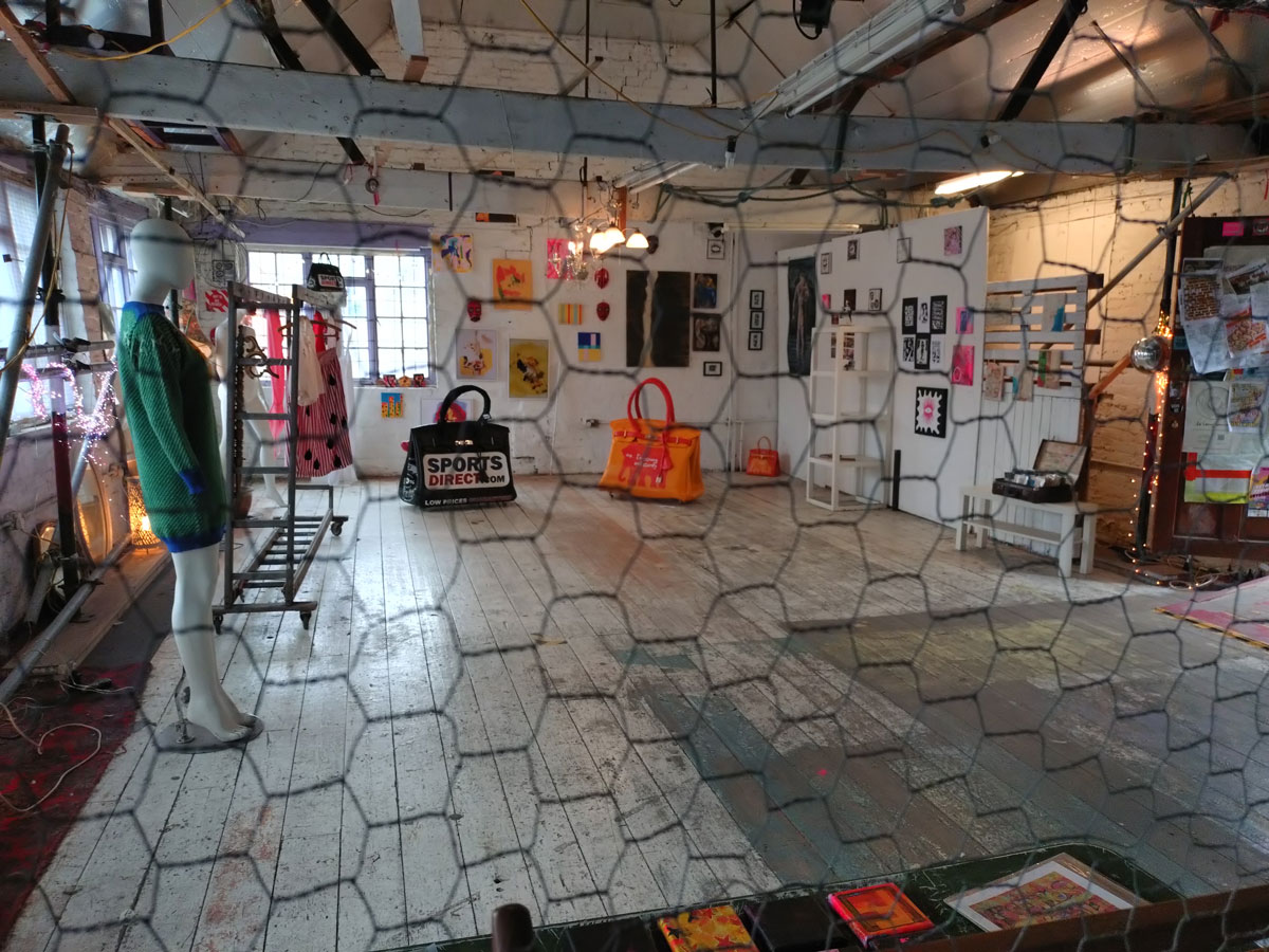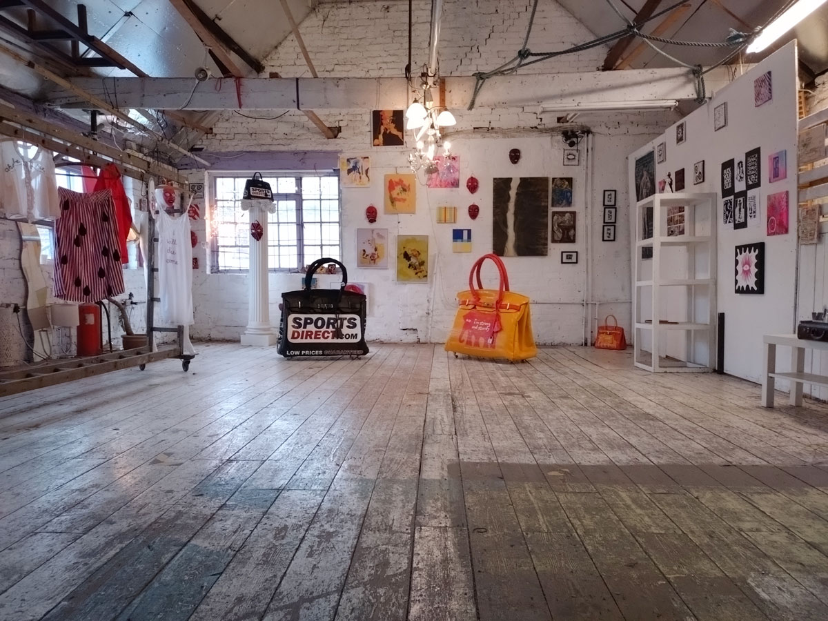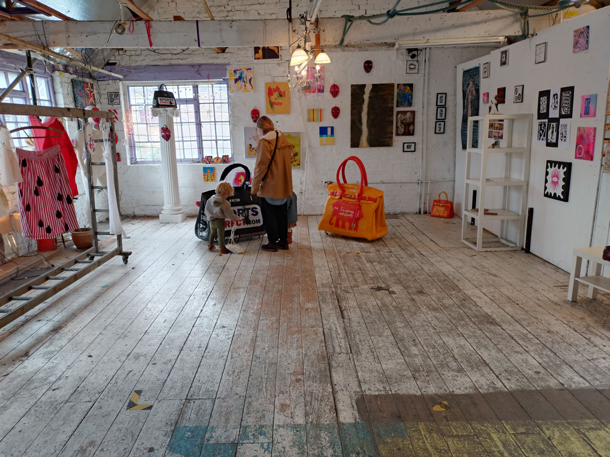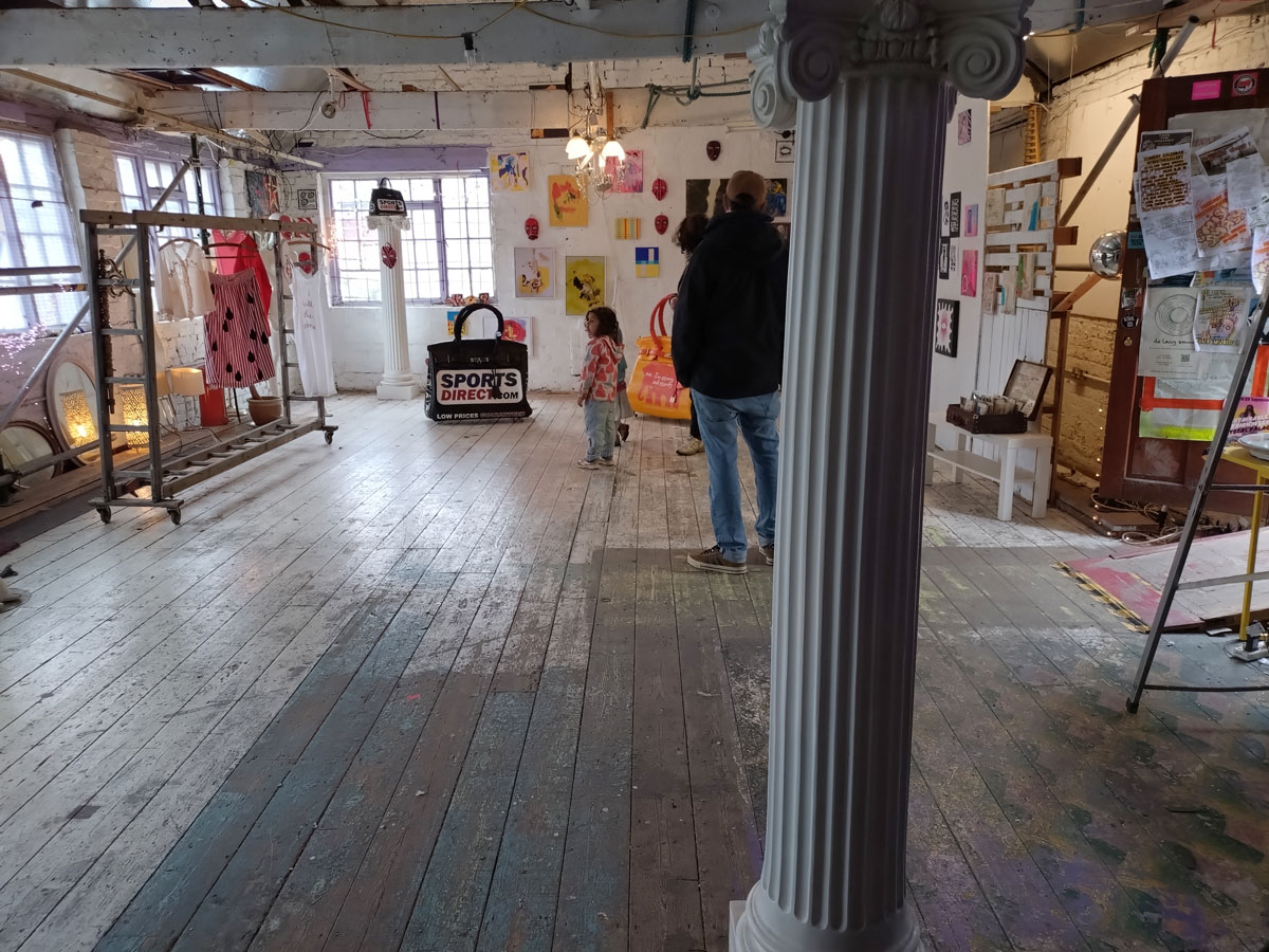 There’s a couple of shelves with two new Mia Jane Harris pieces, more of her manipulation of those found china figures that only she can find and that are always rather intriguing; that (slightly) gothy slant that come with a hint of a fetish flavoured undertone that her work always comes with. And what can we say about those big bags of Vinay Hathi‘s? Those big pop art pieces. They have figured in Cultivate shows before, I think we first showed one of his giant bags in a show something like ten years ago (that big office building just off Hackney Road we took over for a weekend in 2015). Those two bags were always going to loudly fit in with this group show in this particular space with this cross section of art and artists. In our heads this was always going to be a busy show, there was always going to be a lot of noise on the walls, lots of demands for attention and the thing about putting an exhibition like this together is you kind of have to know who is going to come in, to know what’s going to engage with the audience over the weekend. We have done shows in this space before, every time you do something in a space you learn about it, you learn about the people, the audience who come, we do not want to put on shows and that are just about the art crowd and the gang of artists who turn up at each other’s shows on the opening night – that is not what Cultivate is about, that is what we see so often at London shows these days, shows that all about the open night and a gang of London art students (or recent art students) happily showing their art to each other and seemingly not wanting to reach beyond their cosy bubble. Surely art needs to engage a little more than that? Vinay Hathi‘s bags certainly engage with people, he does like to encourage people to pick them up, to take photos with them, walk around them, we wanted that to happen in this show, we wanted people to relax and talk to us on the Saturday and Sunday, those bad were the bridge, well they were more than just the bridge but they were a positive ice breaker. The bags or pieces, the two big ones don’t function as bags (the two small ones do) are made out of found recycled material, they play with the notions of waste, of high end fashion bags and Prada and a world of waste and they are proper pieces of Pop Art, they are certainly talking points and I do rather like how once the ice was broken, conversations flowed in terms of the other art in the room all weekend, I enjoyed sitting in the space and engaging with people (or leaving them to engage with the art, personally I hate been talked to at an art exhibition, if I need to ask then I will but please don’t start talking to me, let the art do that itself.)