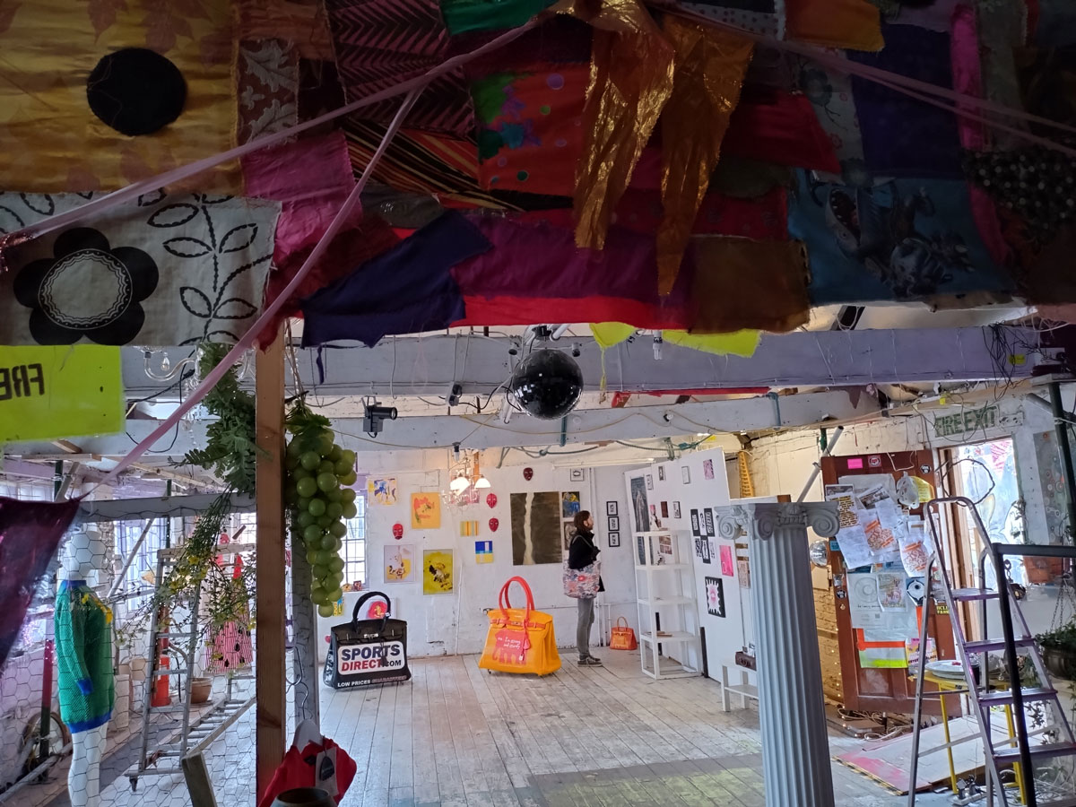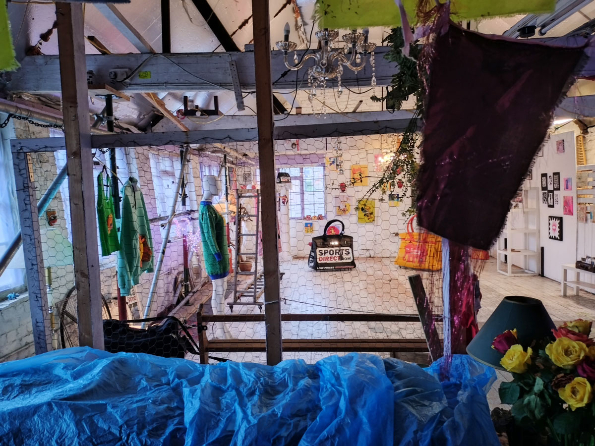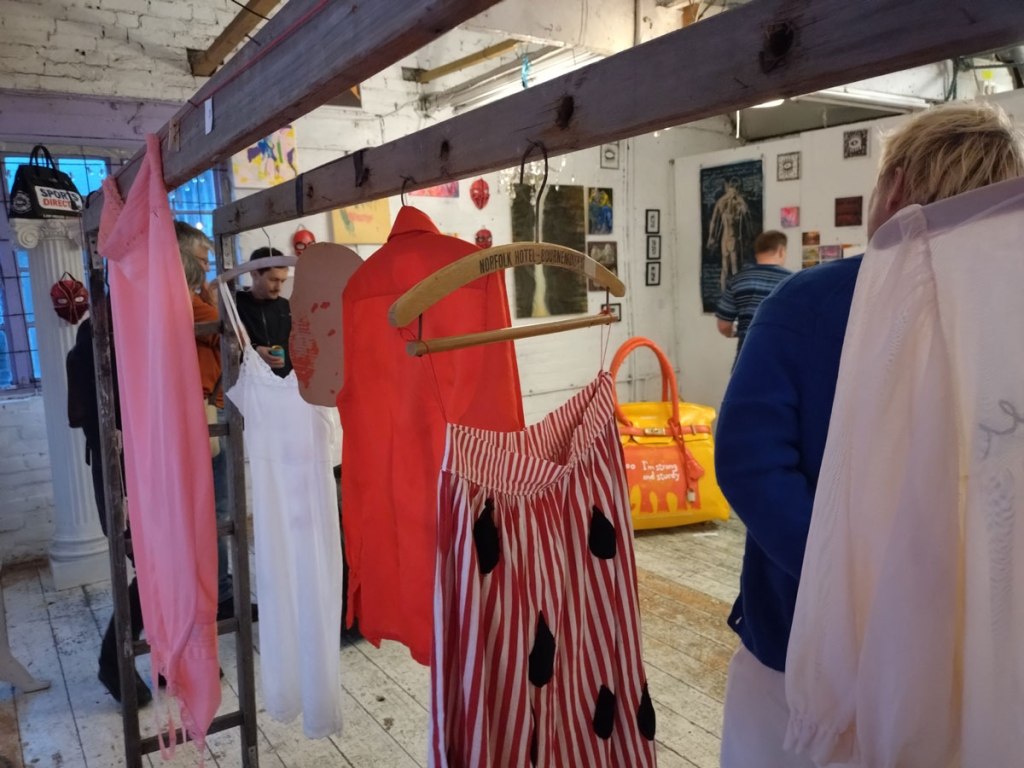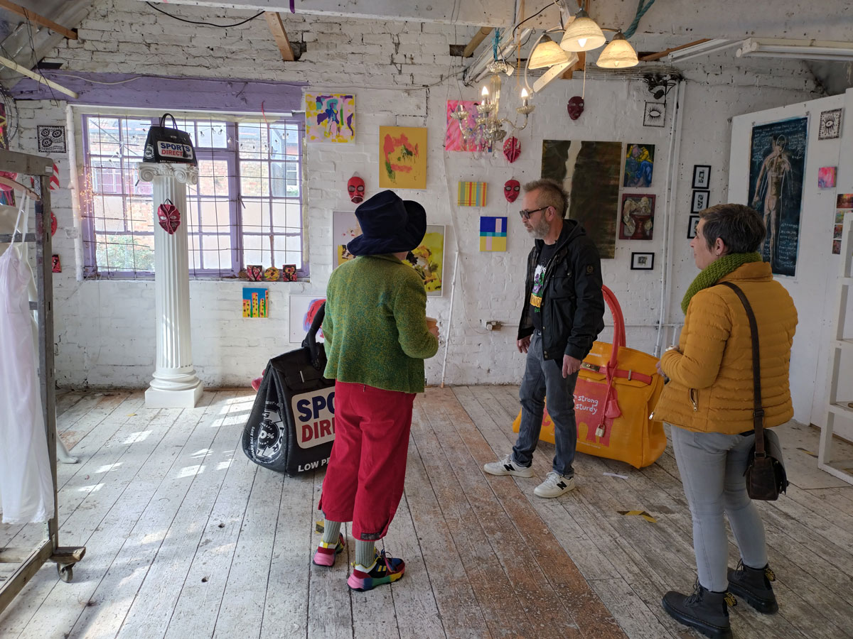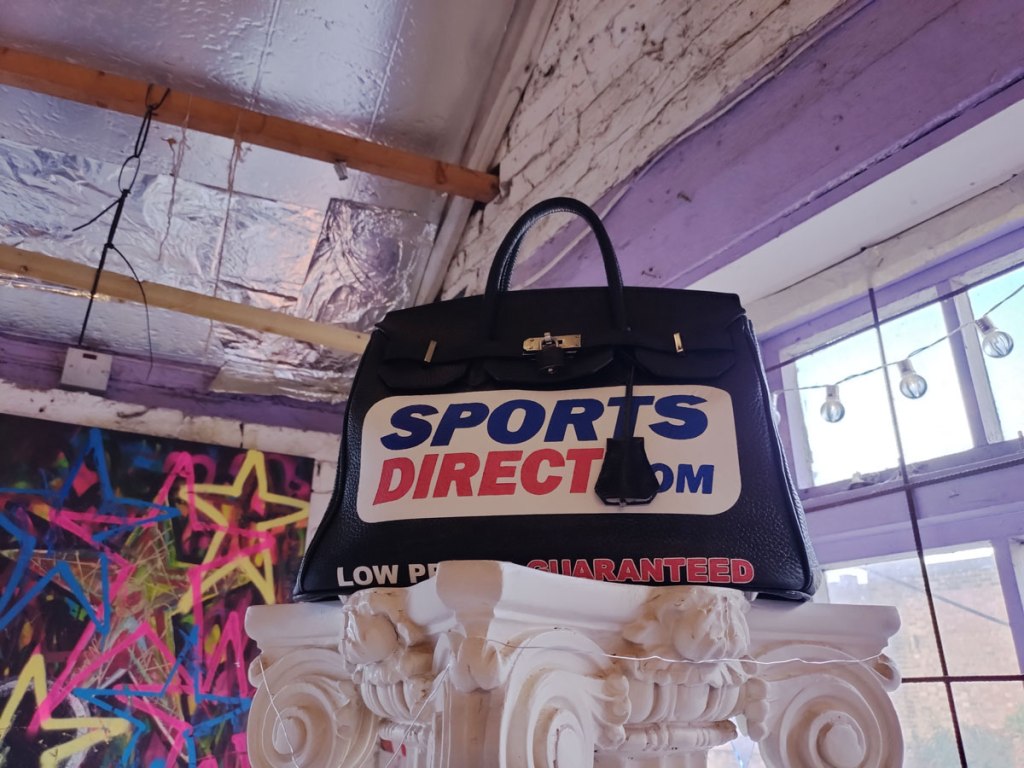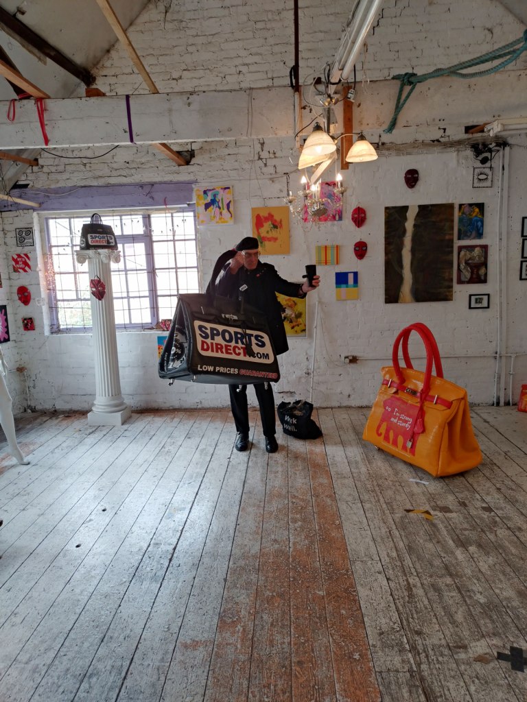 There’s a couple of shelves with two new Mia Jane Harris pieces, more of her manipulation of those found china figures that only she can find and that are always rather intriguing; that (slightly) gothy slant that come with a hint of a fetish flavoured undertone that her work always comes with. And what can we say about those big bags of Vinay Hathi‘s? Those big pop art pieces. They have figured in Cultivate shows before, I think we first showed one of his giant bags in a show something like ten years ago (that big office building just off Hackney Road we took over for a weekend in 2015). Those two bags were always going to loudly fit in with this group show in this particular space with this cross section of art and artists. In our heads this was always going to be a busy show, there was always going to be a lot of noise on the walls, lots of demands for attention and the thing about putting an exhibition like this together is you kind of have to know who is going to come in, to know what’s going to engage with the audience over the weekend. We have done shows in this space before, every time you do something in a space you learn about it, you learn about the people, the audience who come, we do not want to put on shows and that are just about the art crowd and the gang of artists who turn up at each other’s shows on the opening night – that is not what Cultivate is about, that is what we see so often at London shows these days, shows that all about the open night and a gang of London art students (or recent art students) happily showing their art to each other and seemingly not wanting to reach beyond their cosy bubble. Surely art needs to engage a little more than that? Vinay Hathi‘s bags certainly engage with people, he does like to encourage people to pick them up, to take photos with them, walk around them, we wanted that to happen in this show, we wanted people to relax and talk to us on the Saturday and Sunday, those bad were the bridge, well they were more than just the bridge but they were a positive ice breaker. The bags or pieces, the two big ones don’t function as bags (the two small ones do) are made out of found recycled material, they play with the notions of waste, of high end fashion bags and Prada and a world of waste and they are proper pieces of Pop Art, they are certainly talking points and I do rather like how once the ice was broken, conversations flowed in terms of the other art in the room all weekend, I enjoyed sitting in the space and engaging with people (or leaving them to engage with the art, personally I hate been talked to at an art exhibition, if I need to ask then I will but please don’t start talking to me, let the art do that itself.)