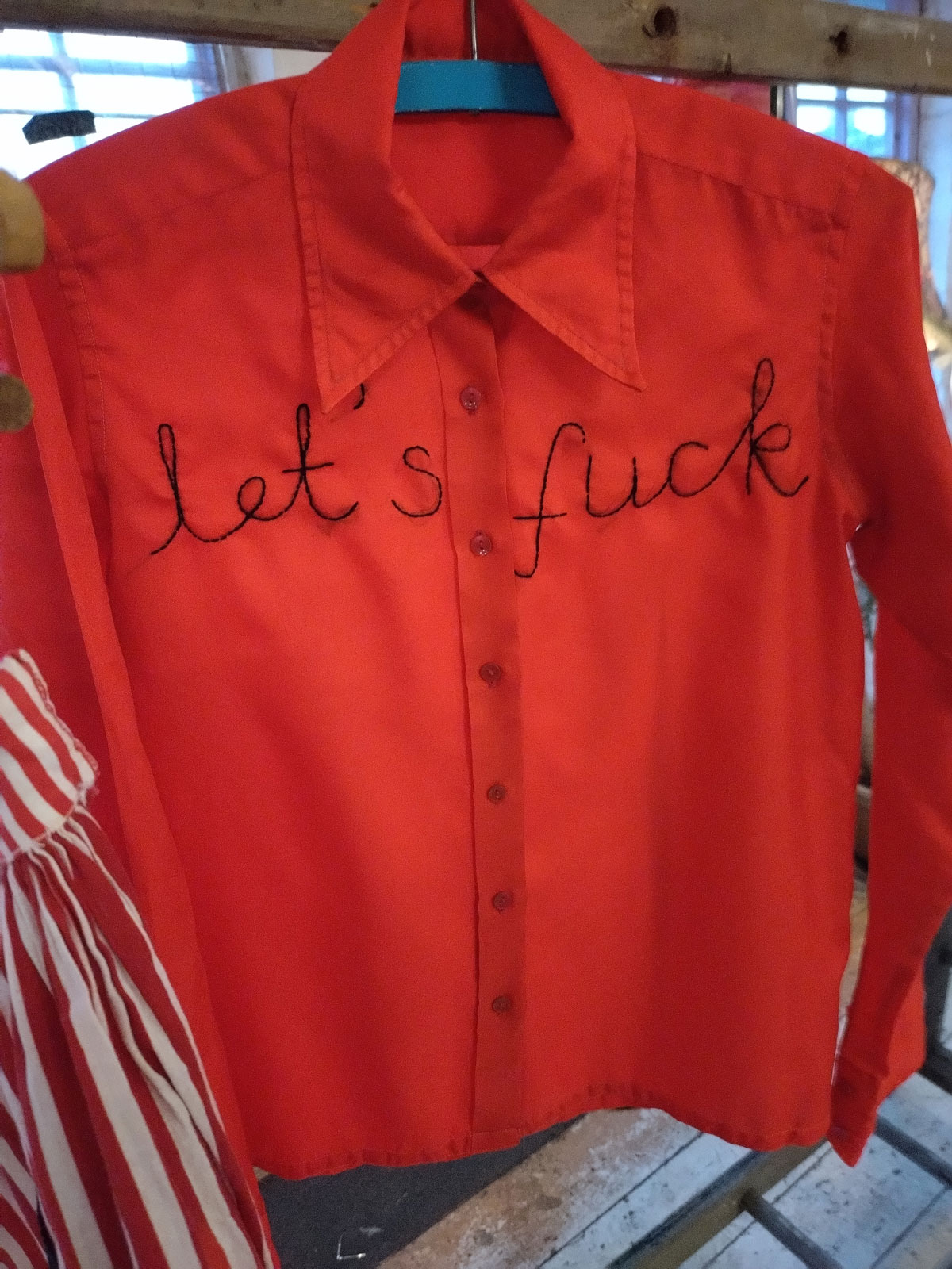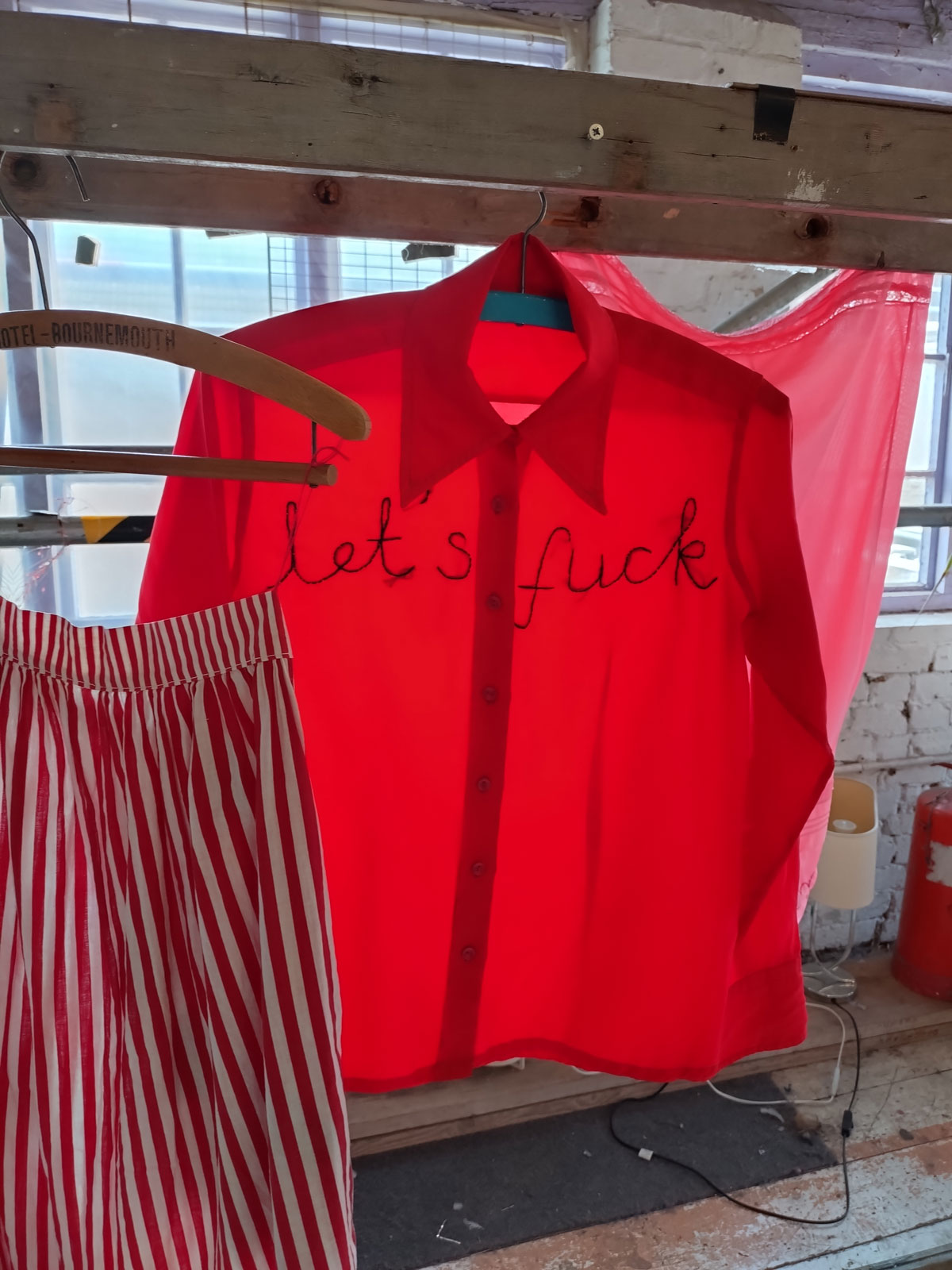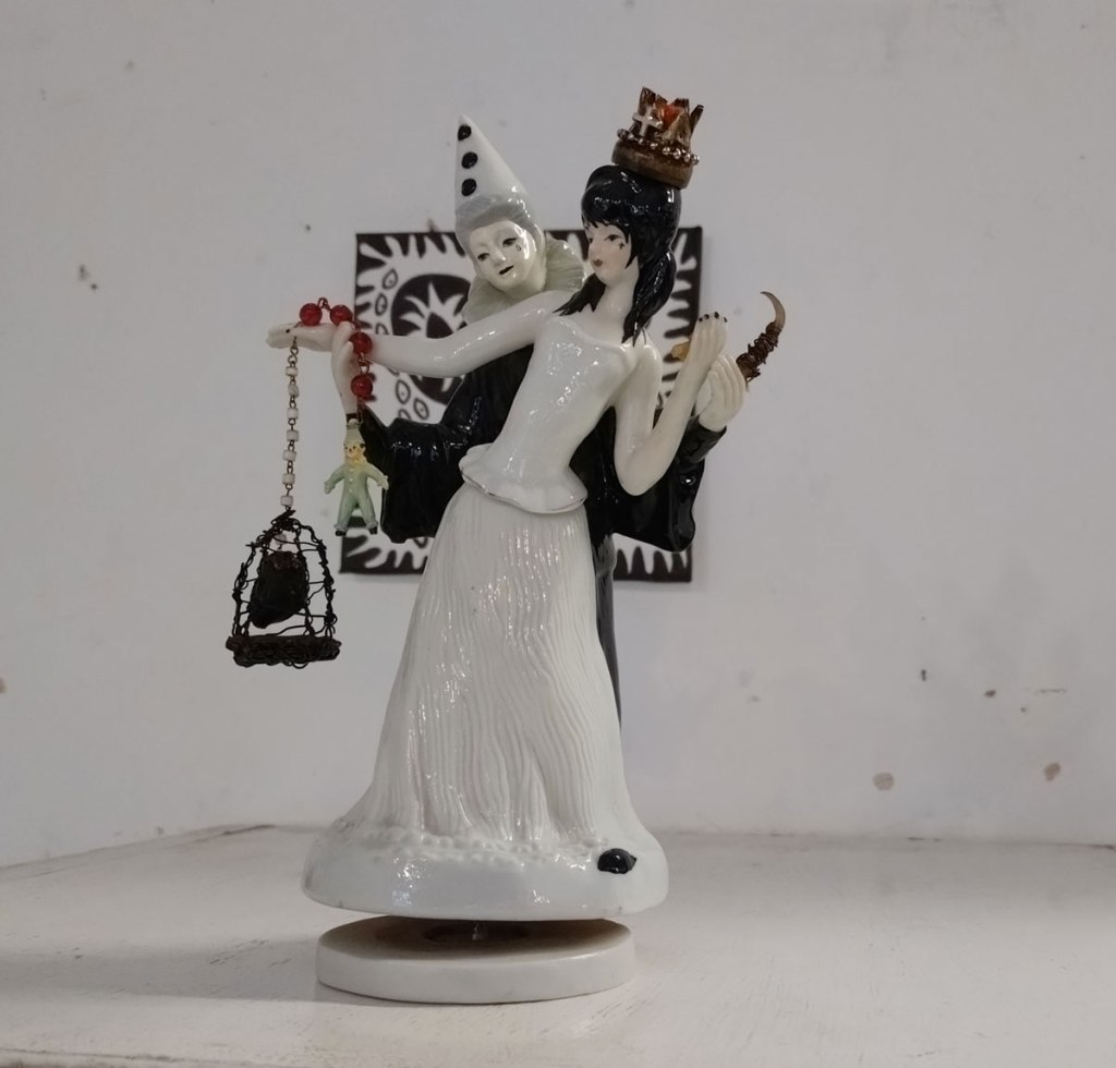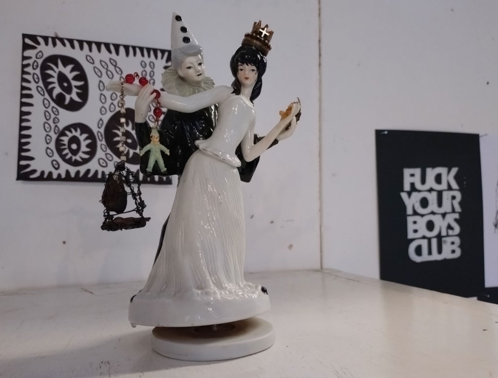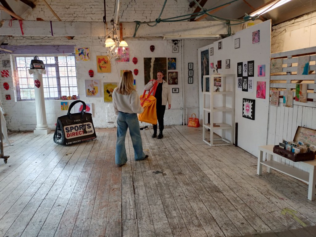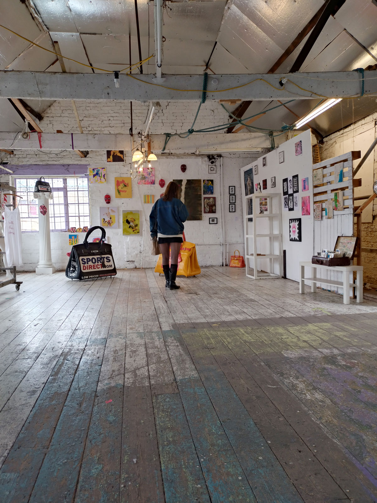 There’s a couple of shelves with two new Mia Jane Harris pieces, more of her manipulation of those found china figures that only she can find and that are always rather intriguing; that (slightly) gothy slant that come with a hint of a fetish flavoured undertone that her work always comes with. And what can we say about those big bags of Vinay Hathi‘s? Those big pop art pieces. They have figured in Cultivate shows before, I think we first showed one of his giant bags in a show something like ten years ago (that big office building just off Hackney Road we took over for a weekend in 2015). Those two bags were always going to loudly fit in with this group show in this particular space with this cross section of art and artists. In our heads this was always going to be a busy show, there was always going to be a lot of noise on the walls, lots of demands for attention and the thing about putting an exhibition like this together is you kind of have to know who is going to come in, to know what’s going to engage with the audience over the weekend. We have done shows in this space before, every time you do something in a space you learn about it, you learn about the people, the audience who come, we do not want to put on shows and that are just about the art crowd and the gang of artists who turn up at each other’s shows on the opening night – that is not what Cultivate is about, that is what we see so often at London shows these days, shows that all about the open night and a gang of London art students (or recent art students) happily showing their art to each other and seemingly not wanting to reach beyond their cosy bubble. Surely art needs to engage a little more than that? Vinay Hathi‘s bags certainly engage with people, he does like to encourage people to pick them up, to take photos with them, walk around them, we wanted that to happen in this show, we wanted people to relax and talk to us on the Saturday and Sunday, those bad were the bridge, well they were more than just the bridge but they were a positive ice breaker. The bags or pieces, the two big ones don’t function as bags (the two small ones do) are made out of found recycled material, they play with the notions of waste, of high end fashion bags and Prada and a world of waste and they are proper pieces of Pop Art, they are certainly talking points and I do rather like how once the ice was broken, conversations flowed in terms of the other art in the room all weekend, I enjoyed sitting in the space and engaging with people (or leaving them to engage with the art, personally I hate been talked to at an art exhibition, if I need to ask then I will but please don’t start talking to me, let the art do that itself.)