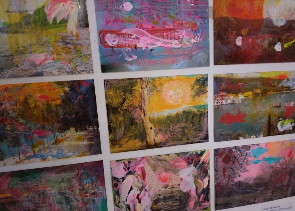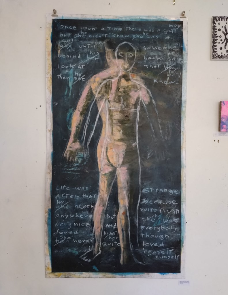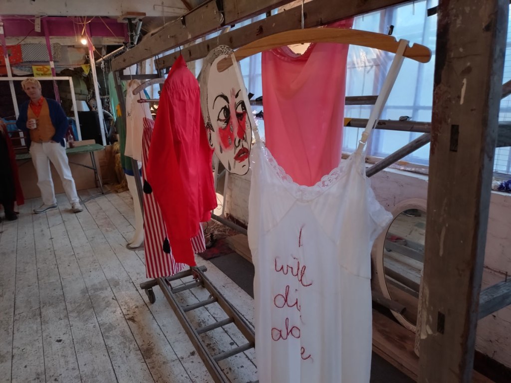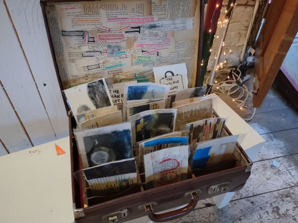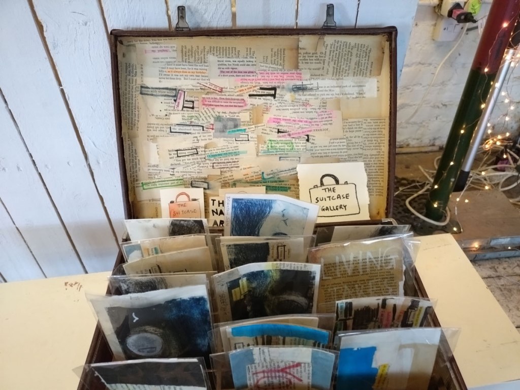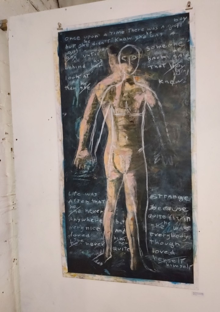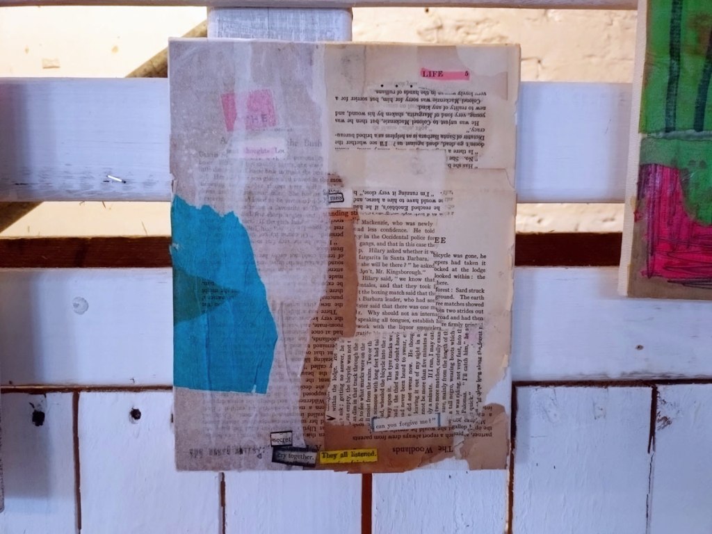 There are quite a few Suzie Pindar pieces I really like, she does often figure somewhere in our shows, I like the part she plays in them, I like her work, I do like her word-covered shoes, her bedhead, her door, there are some things I maybe don’t like so much, this work on these walls in here (or hanging on the fence in here) is amongst her strongest and possibly her most confident? You feel she’s evolving as an artist and that Suitcase Gallery of hers, that suitcase full of art that travels with her that is resting on a bench in here for this show kind of hints of things to come. The art of The Naked Artist, as she likes to be known, is evolving in interesting ways as Suzie Pindar finds herself as an artist (and maybe as a person). I’m never quite sure what Francesca Alaimo‘s art is about, I kind of like that I’m never sure, that it isn’t ever as obvious as it might appear to be at first, I do like this big piece, a new one, a do like how Francesca arrives at a show and unrolls the latest piece, those latest layers of life, the latest slice of painterly mixed media and leaves it hanging there to be considered and thought about through the length of a show and beyond.